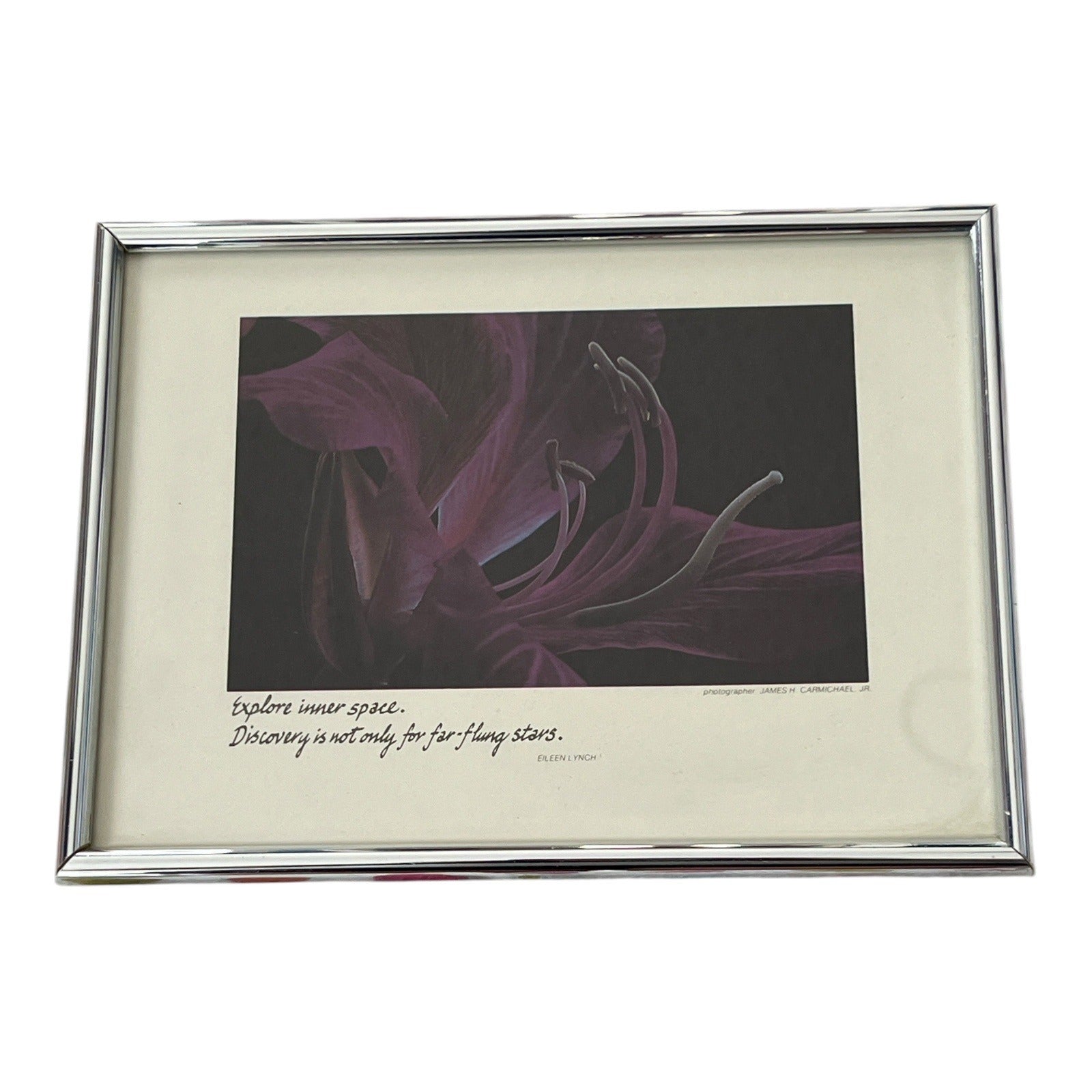 Vintage framed orchid photography print by James H. Carmichael Jr., part of *The Freelance Collection Miniatures* series. This striking close-up image of an orchid blossom captures bold detail in rich purple tones. Below the photograph is an inspirational quote by Eileen Lynch: *“Explore inner space. Discovery is not only for far-flung stars.”*