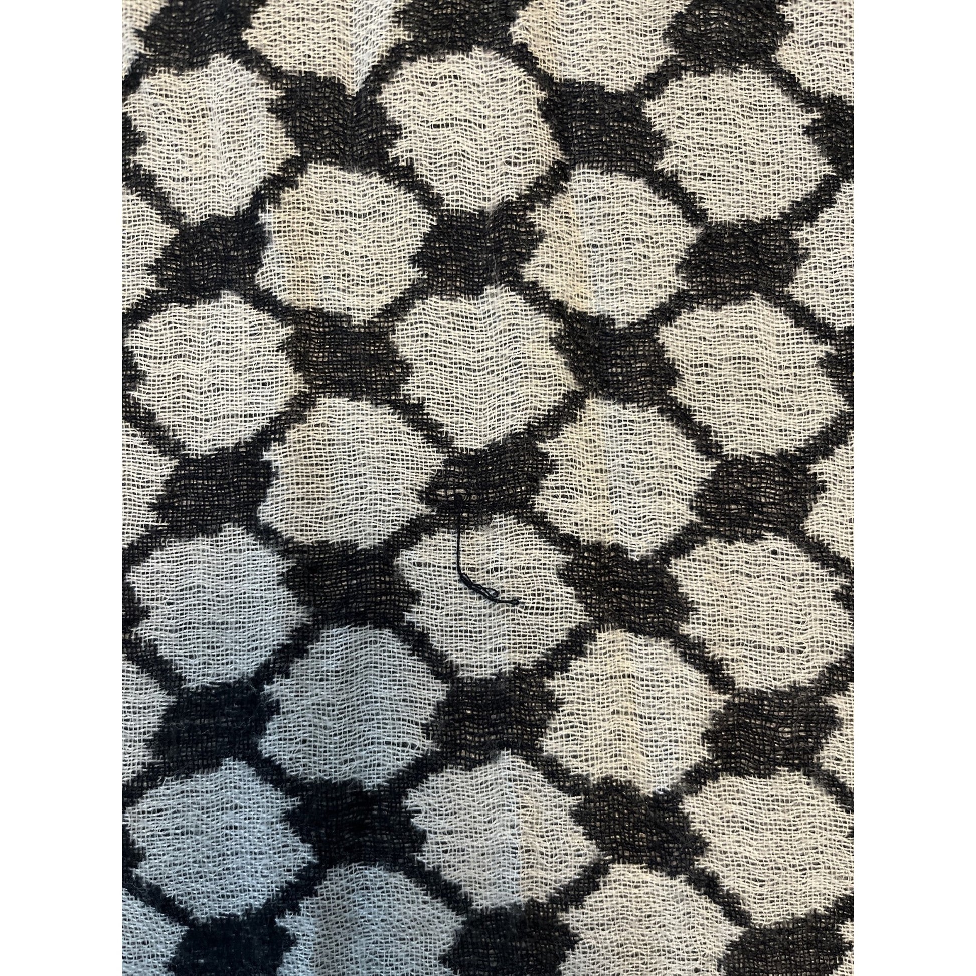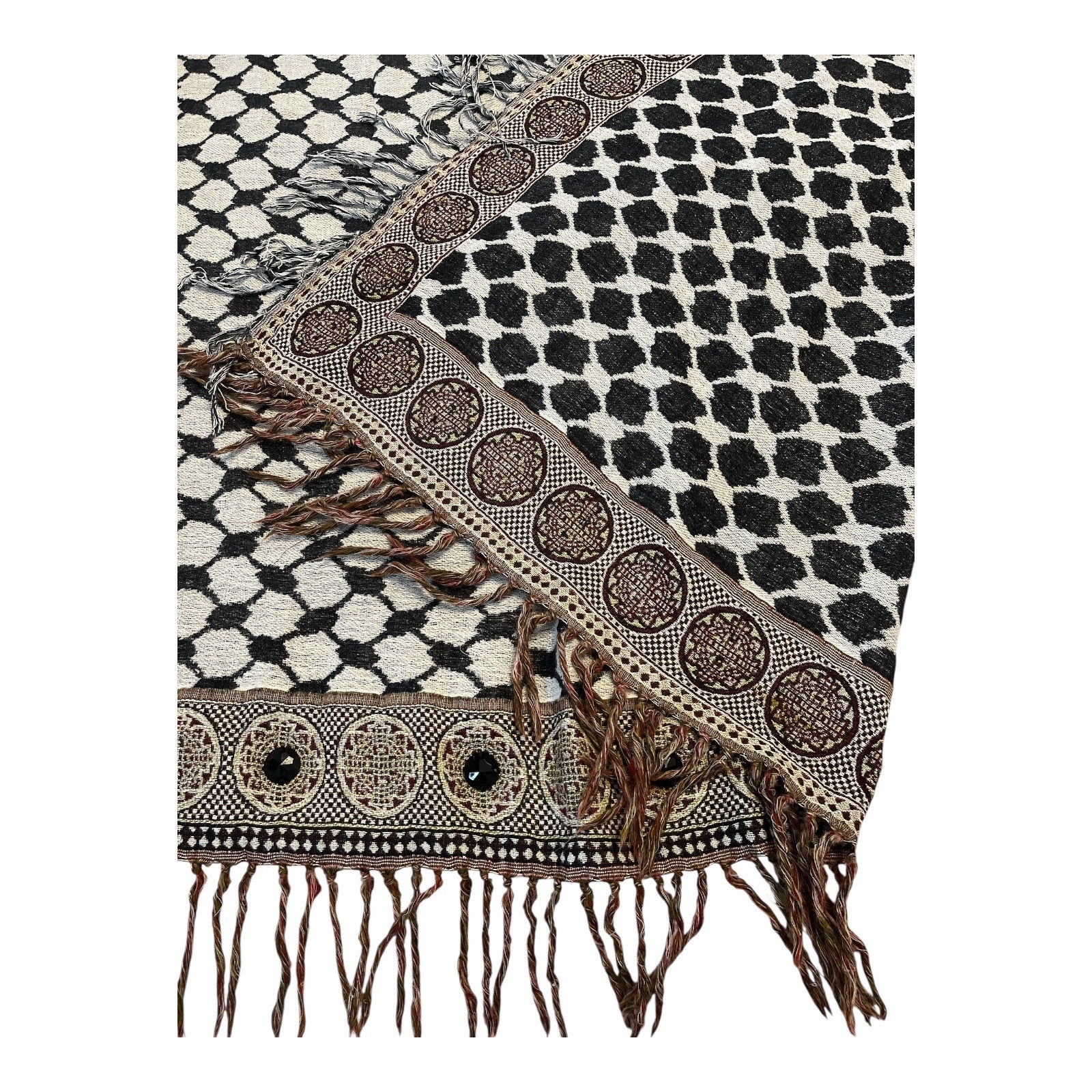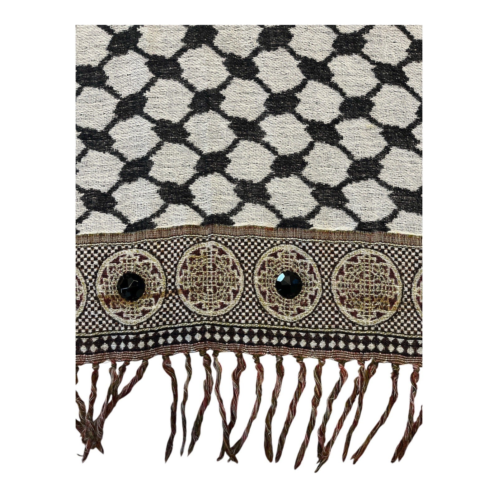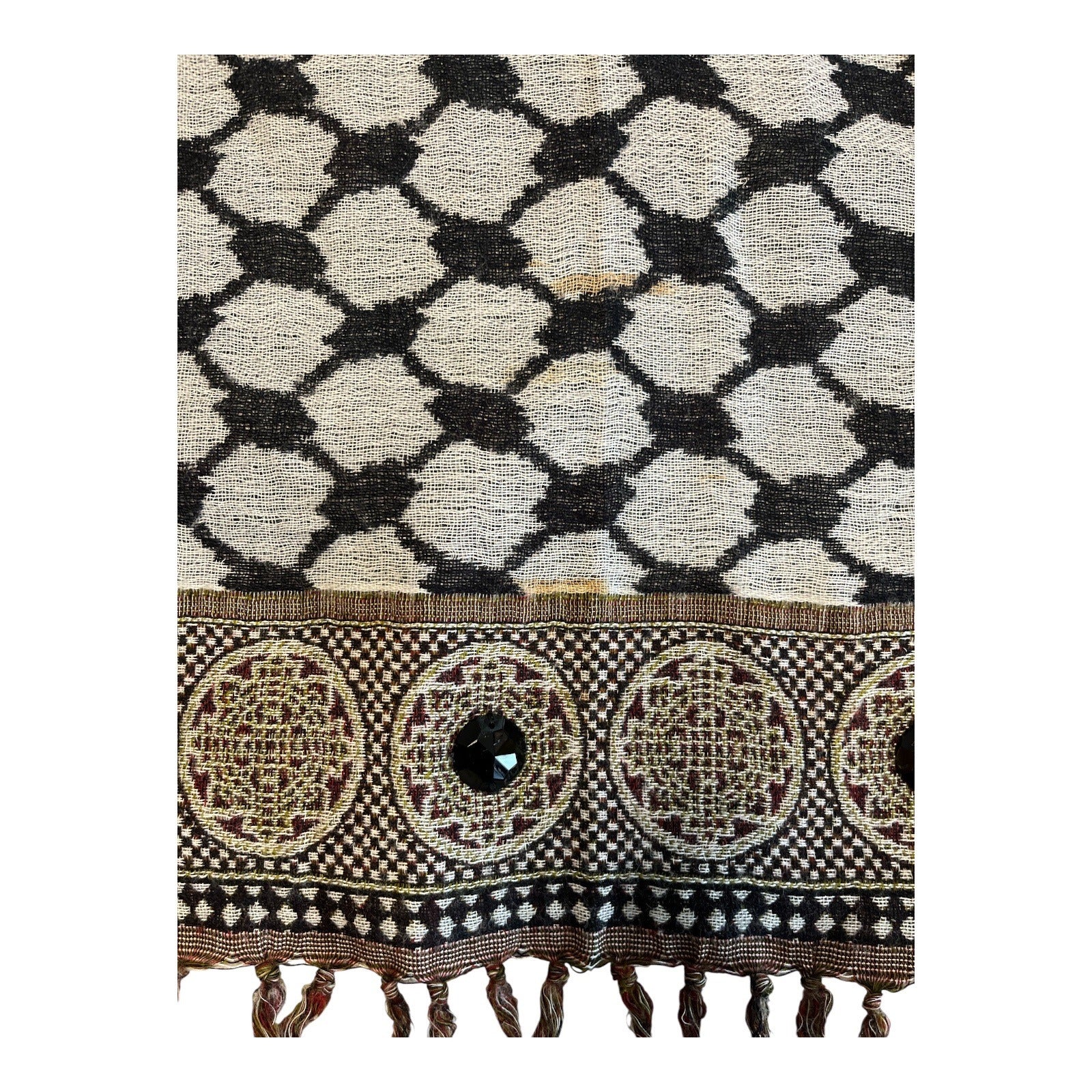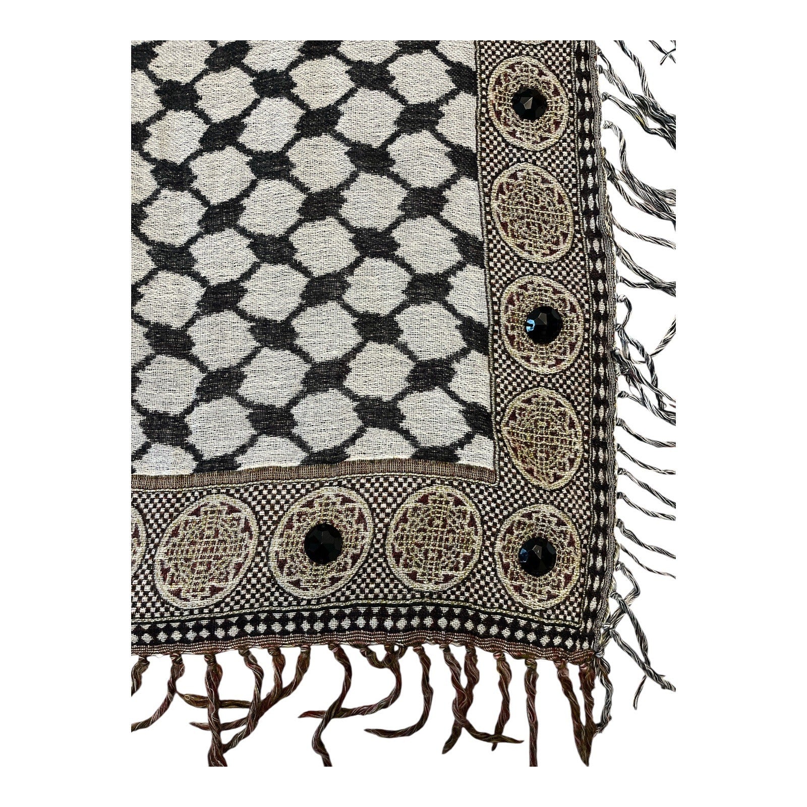 This vintage woven shawl dates to the **1980s–1990s** and features a bold black and white geometric weave with a richly decorated border. Twisted fringe edges frame the piece, while the border is embroidered with metallic threadwork and accented by **decorative faceted black gems** for added texture and sparkle.