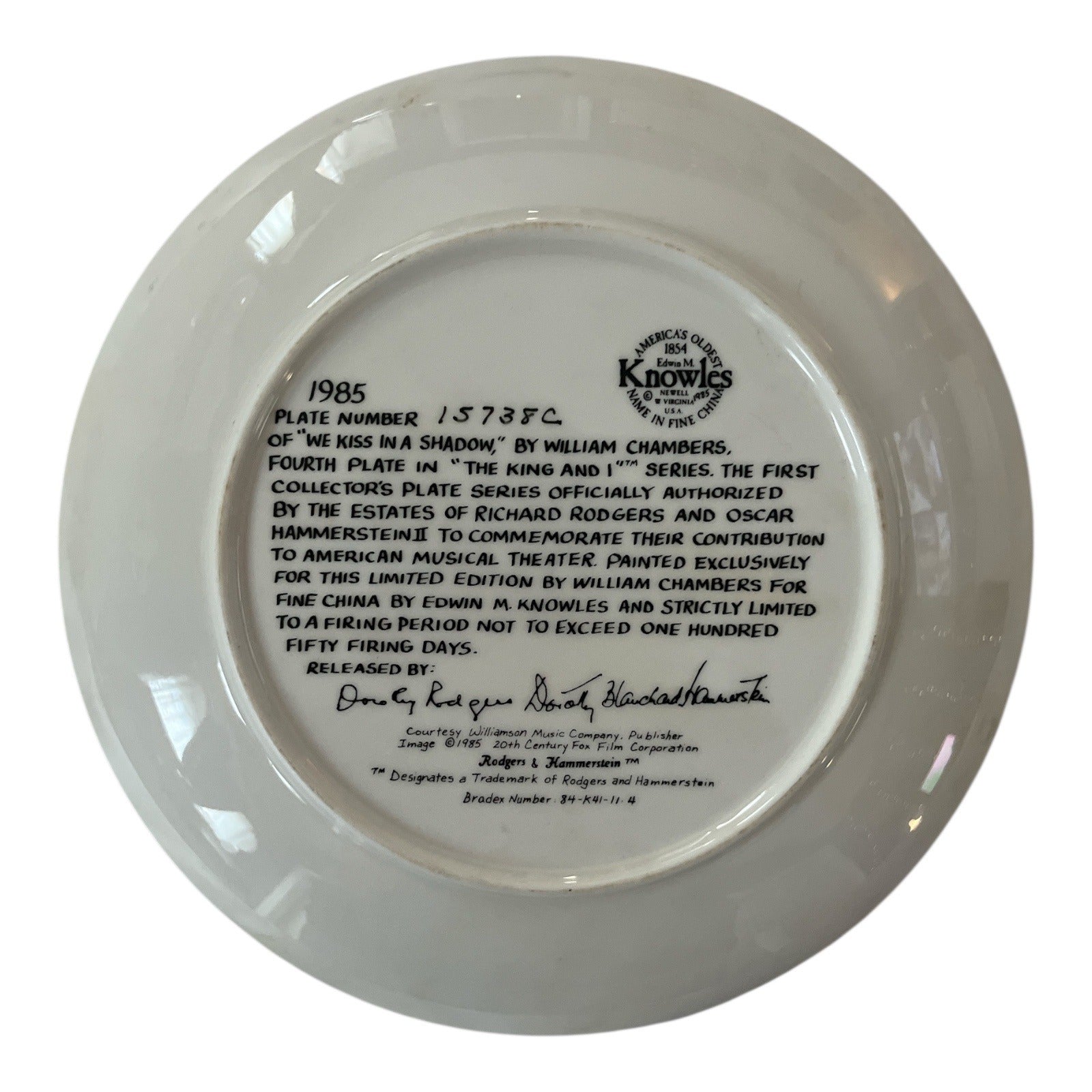 Celebrate the golden age of American musical theater with this set of two limited edition collector plates from *The King and I* series, created in 1985 by artist William Chambers. Officially authorized by the estates of Rodgers & Hammerstein and produced by Edwin M. Knowles, these porcelain display plates are part of a strictly limited firing period.