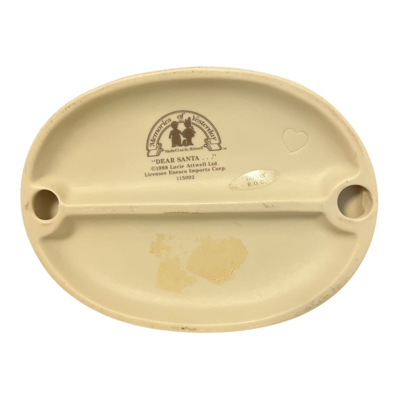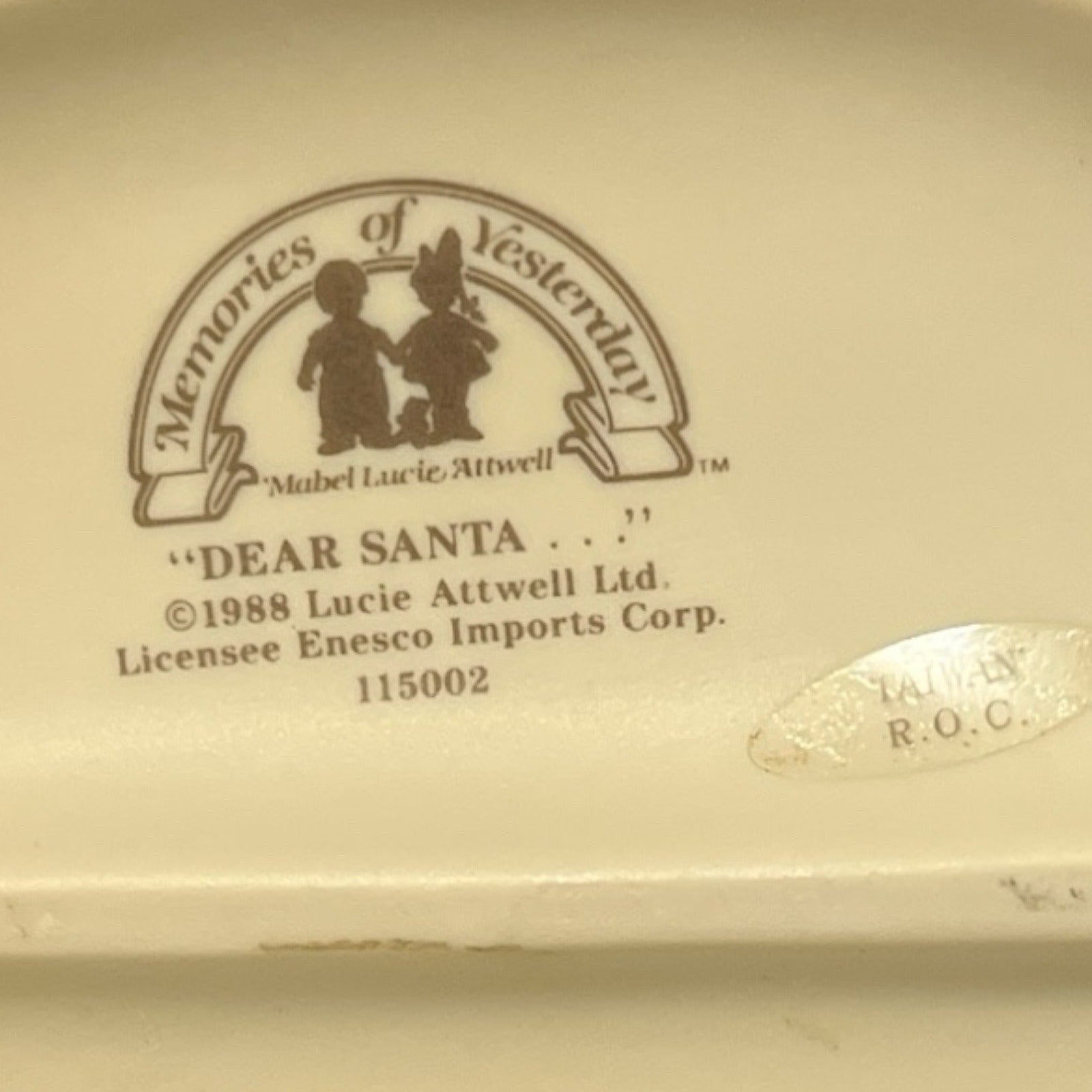 This charming **Memories of Yesterday** collectible figurine titled *"Dear Santa..."* features a sweet blonde girl writing a letter with her puppy curiously watching. Based on the artwork of **Mabel Lucie Attwell**, this piece was produced by **Enesco** under license from **Lucie Attwell Ltd.** in 1988.