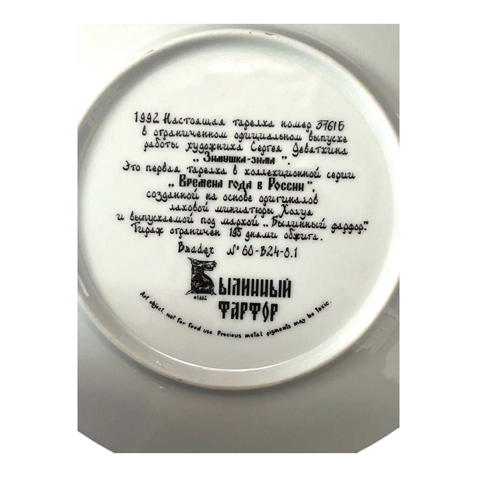 “1992. This is an authentic plate, No. 3761B, from a limited original edition featuring the work of artist Sergei Davydov. ‘Zimushka-zima’ (‘Winter’) is the first plate in the collector’s series ‘Seasons of the Year in Russia,’ created based on the original Kholuy miniature artworks and released under the brand ‘Bylinny Farfor.’ Production was limited to 195 firing days.”