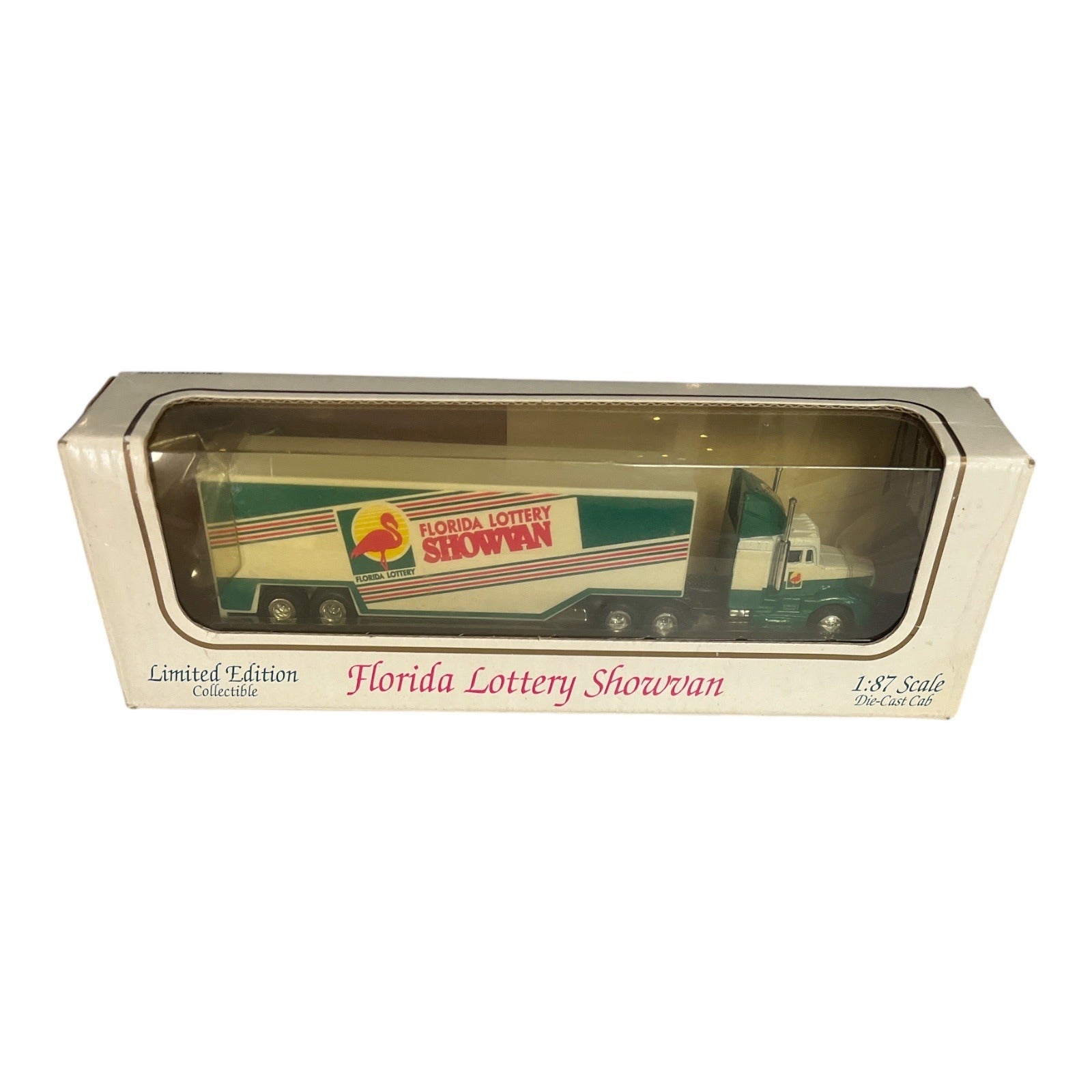 Add a rare piece to your die-cast collection with this 1994 Florida Lottery Showvan by Racing Champions. This 1:87 scale model features a detailed semi-truck and trailer with bold Florida Lottery graphics, including the classic flamingo logo. A limited edition release, this collectible includes an opening rear door and comes in its original box with insert.