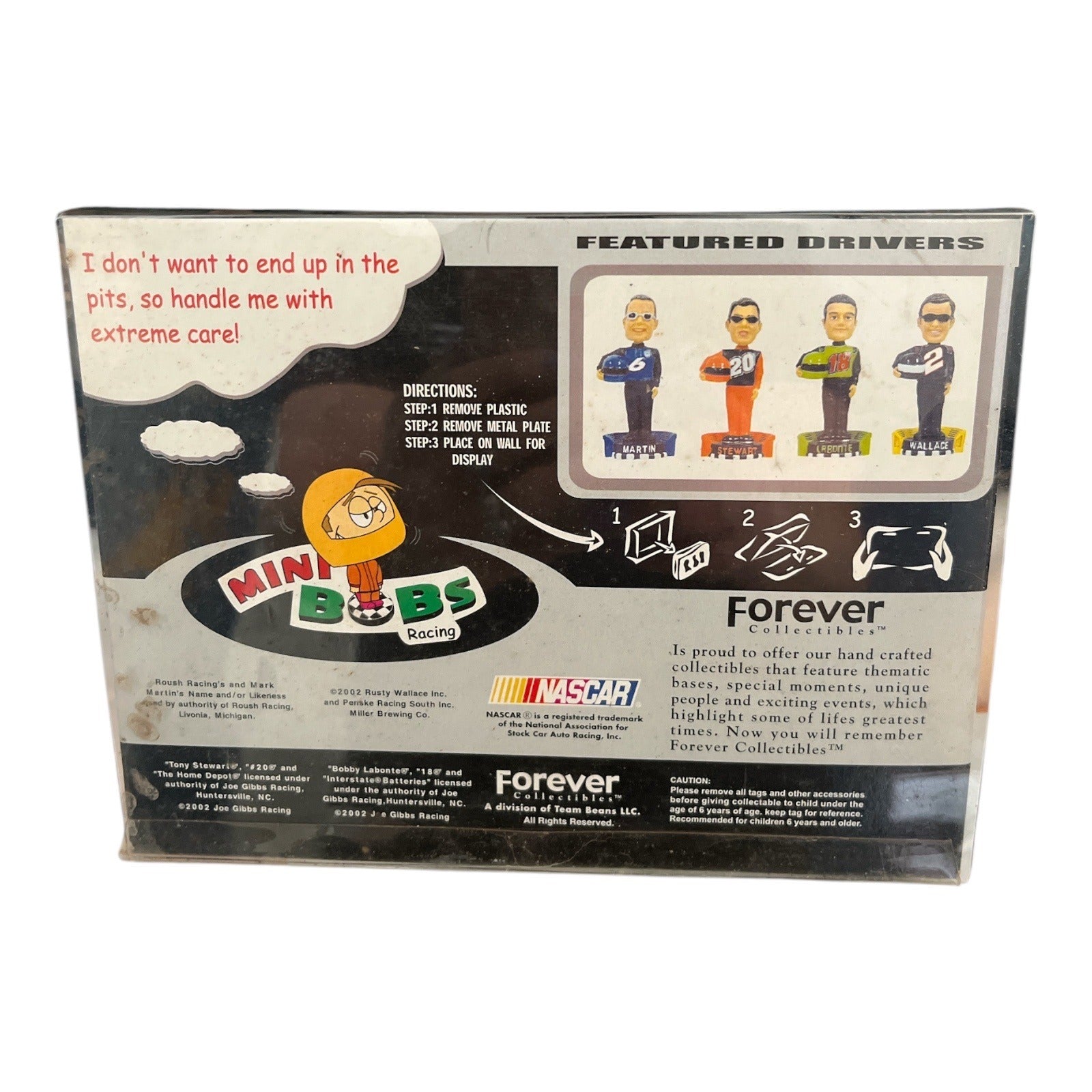Vintage 2002 NASCAR Mini Bobs collectible set featuring Rusty Wallace, Bobby Labonte, and Tony Stewart figures with magnetic display base and original themed packaging. Part of the Legends of the Track series by Forever Collectibles. Designed as display collectibles with stylized driver likenesses and uniform details. Mark Martin figure is missing from the set.