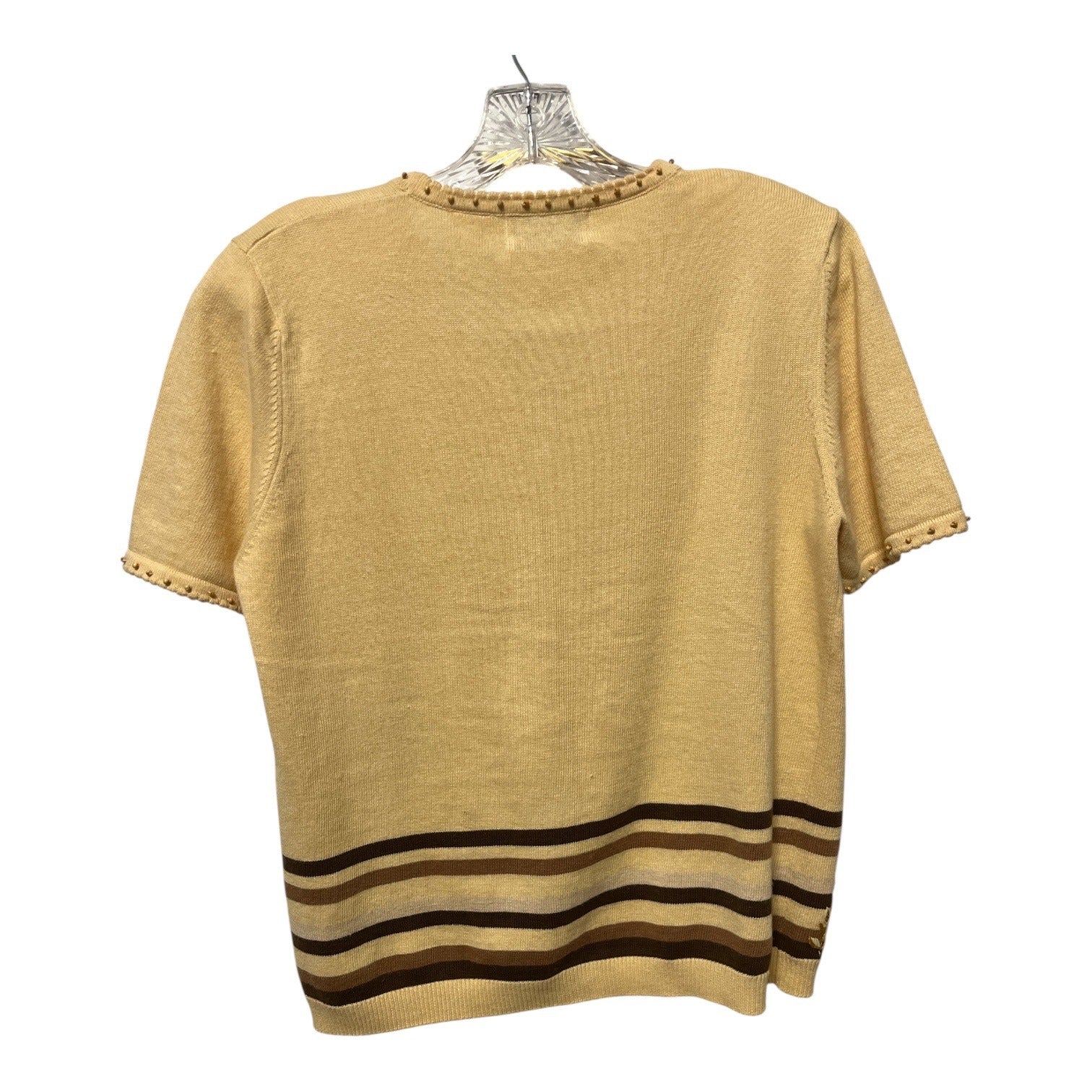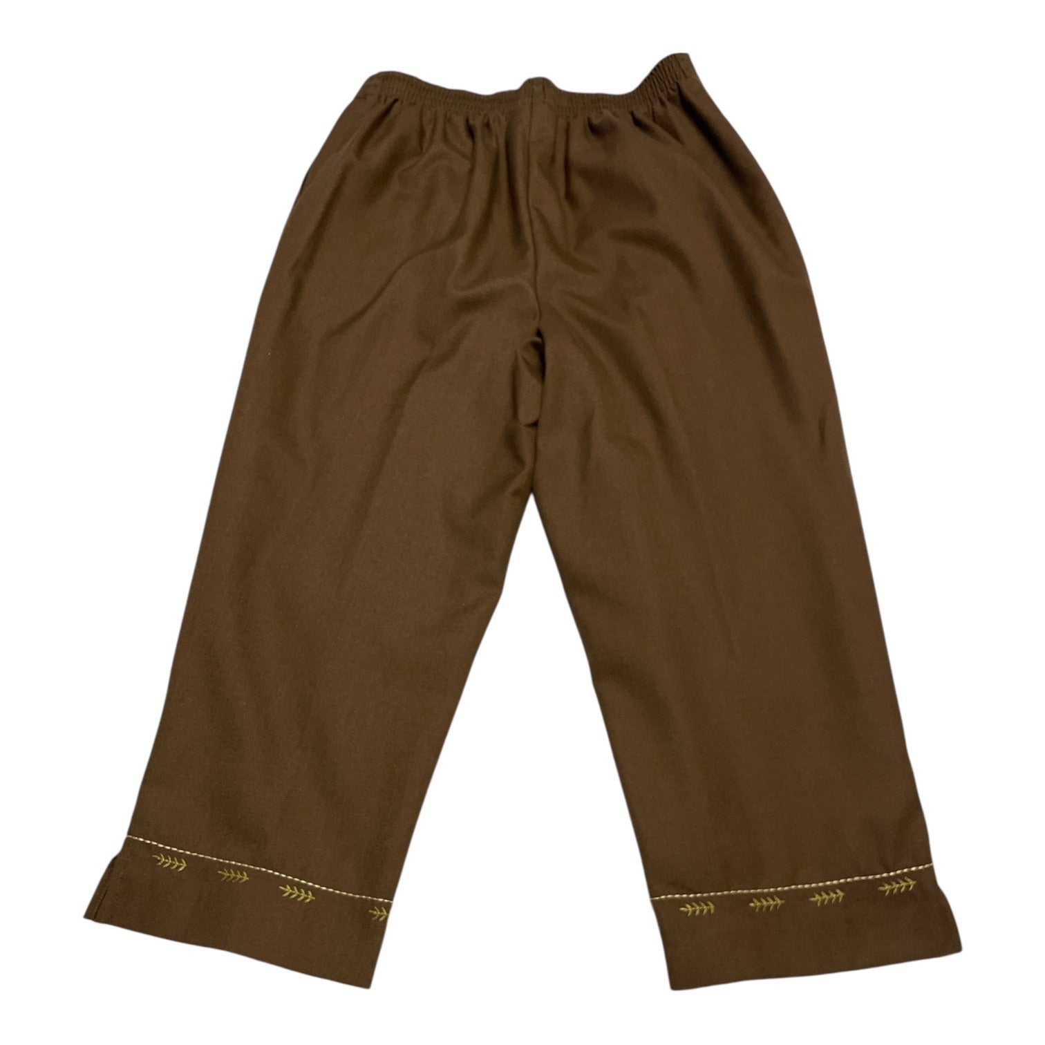 Charming coordinated petite set by Alfred Dunner featuring a soft knit short sleeve cardigan and matching pull-on pants. The cardigan showcases detailed tropical embroidery with palm trees, florals, and bead accents, while the pants feature a complementary embroidered motif near the hem. A polished vintage outfit perfect for resort wear, travel, brunch, or collectors of coordinated sets.