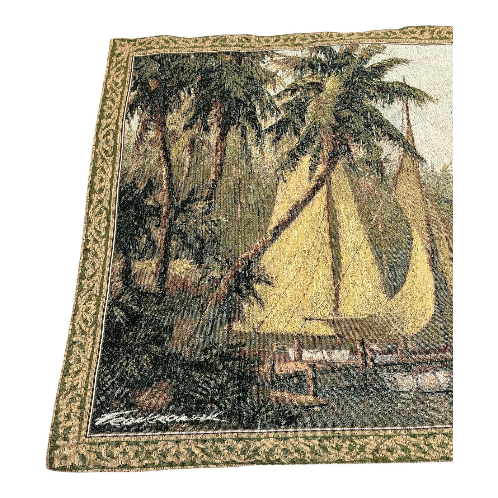 This woven wall tapestry showcases artwork by **Art Fronckowiak**, celebrated for his peaceful tropical and coastal landscapes. The design captures sailboats docked along a palm-lined shore, accented with soft golden light and an ornate border.