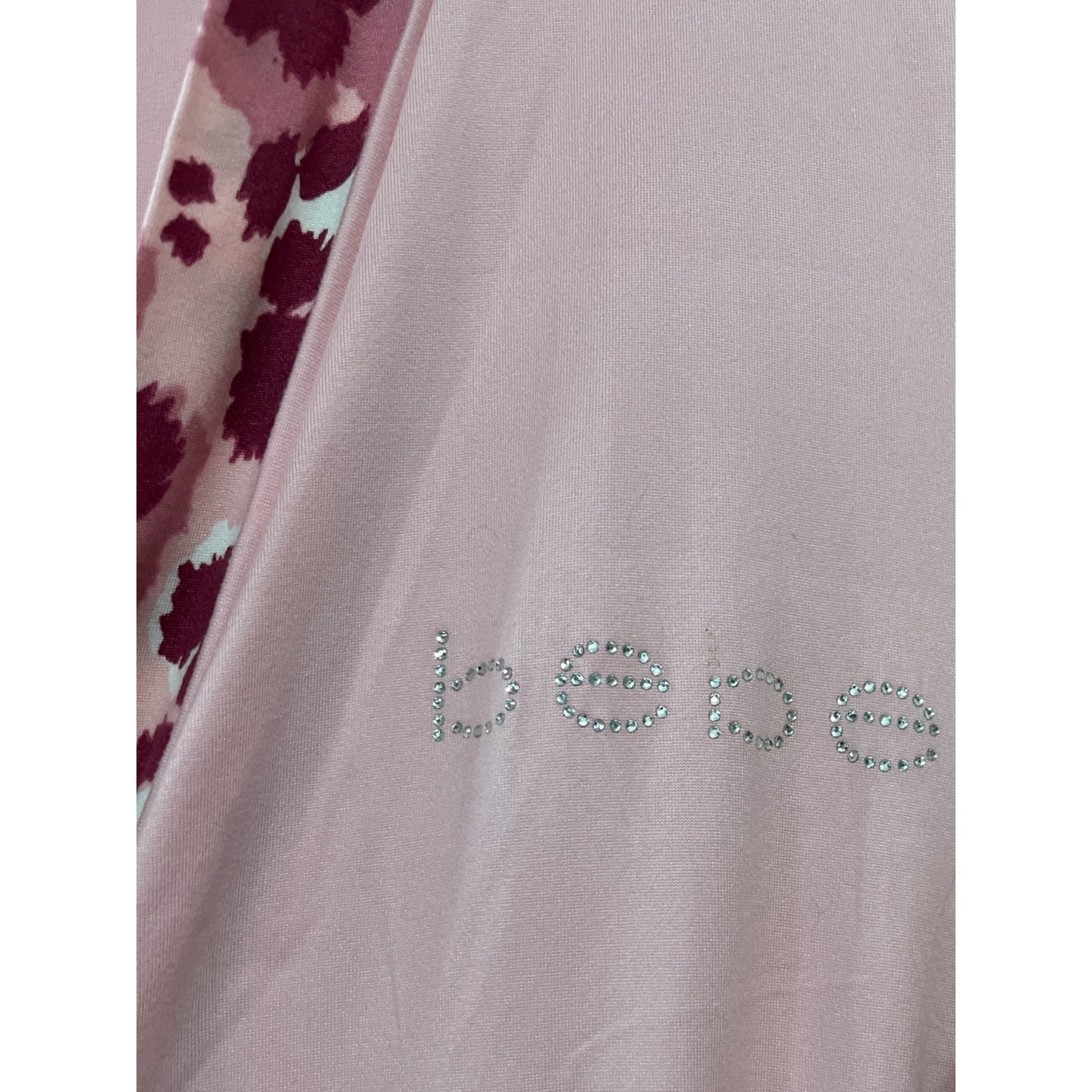 Soft and feminine Bebe sleepwear robe in light pink with a floral print trim and matching belt tie. Features the signature “bebe” rhinestone logo on the chest and a comfortable lightweight feel—perfect for lounging or layering over nightwear.