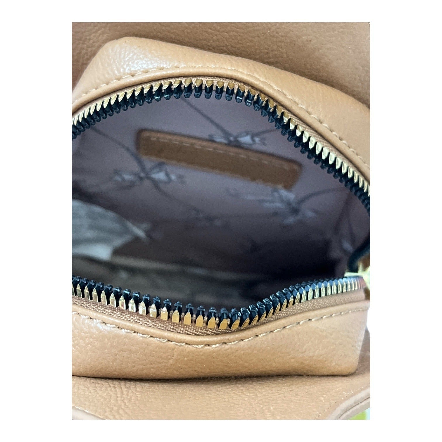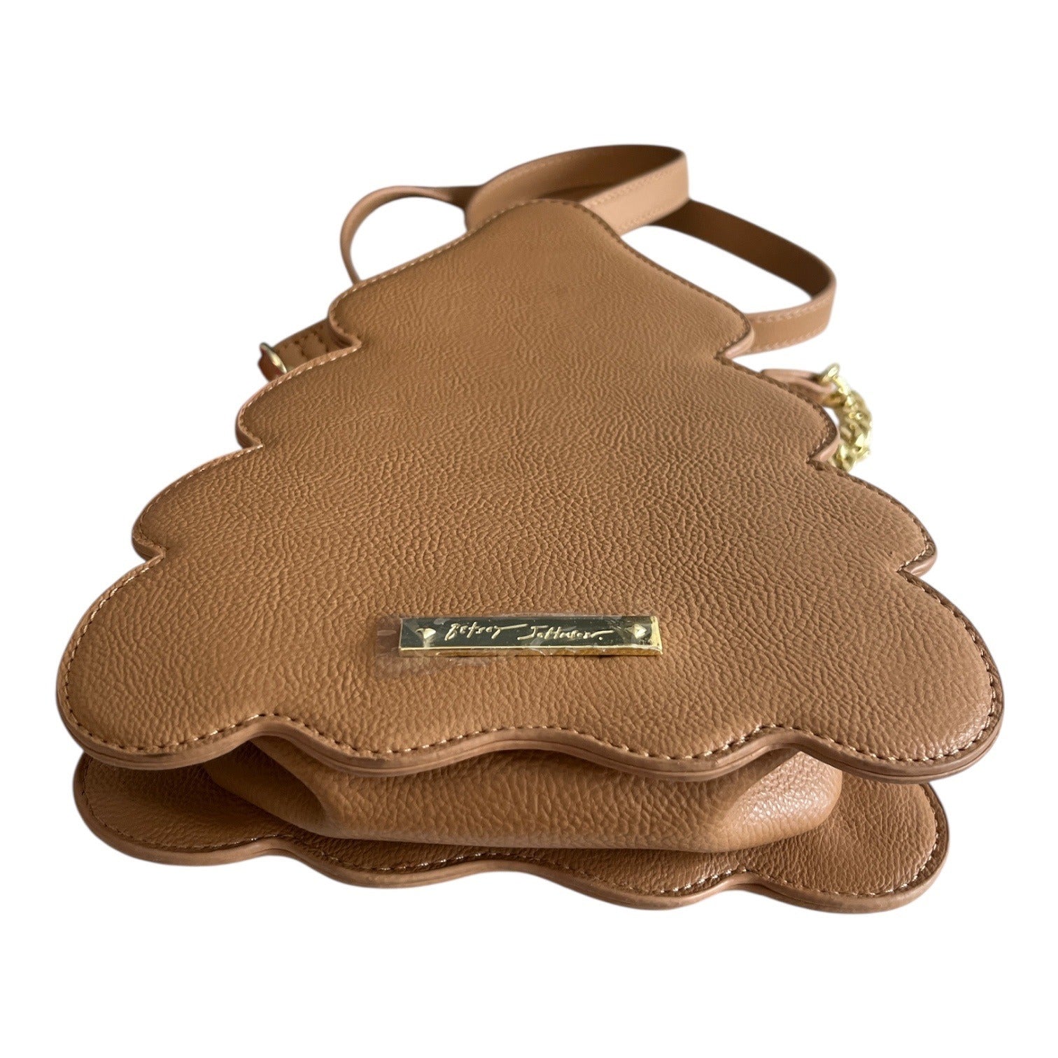 Whimsical Betsey Johnson crossbody purse designed in the shape of a decorated Christmas tree cookie. The front features sparkling “icing,” glitter panels, faux candy beads, snowflake accents, and embroidered pink frosting details. A gold-tone chain accent connects to the shoulder strap, adding a festive touch. The bag closes with a top zipper and has a structured interior compartment for small essentials. A playful holiday statement bag perfect for Christmas parties, winter events, or Betsey Johnson collectors.