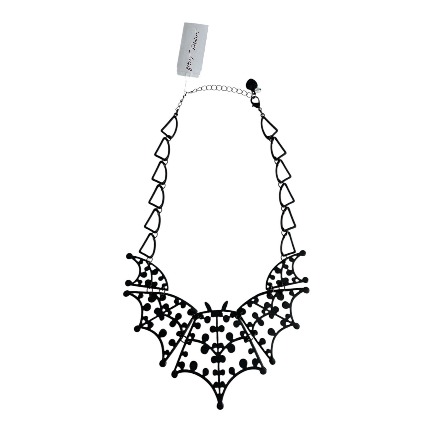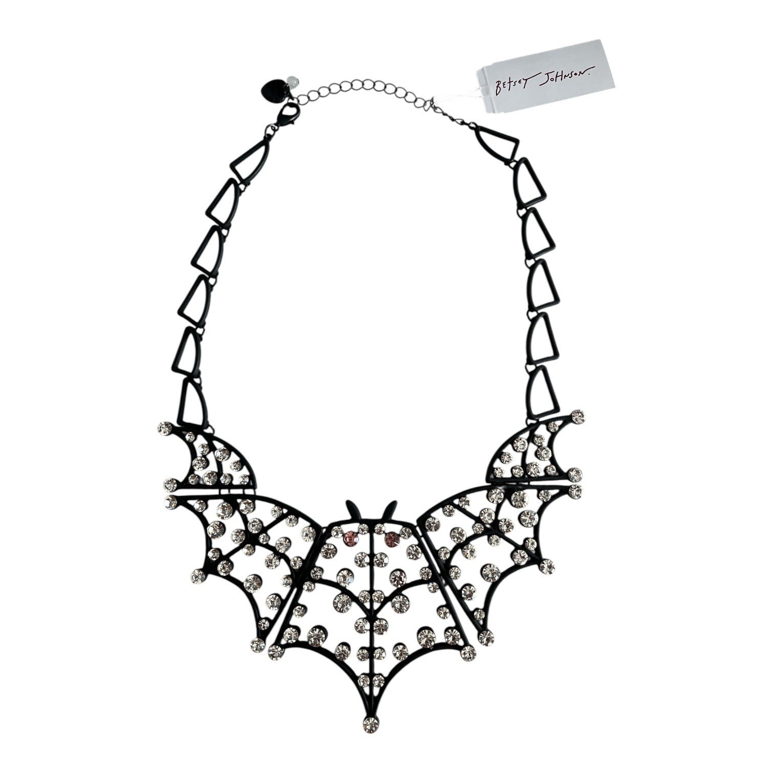 Bold Betsey Johnson statement necklace featuring a dramatic rhinestone bat centerpiece with openwork wings and faceted crystal accents. The black metal chain is styled with geometric links and an adjustable extender for fit. Signature Betsey Johnson heart charm confirms authenticity.