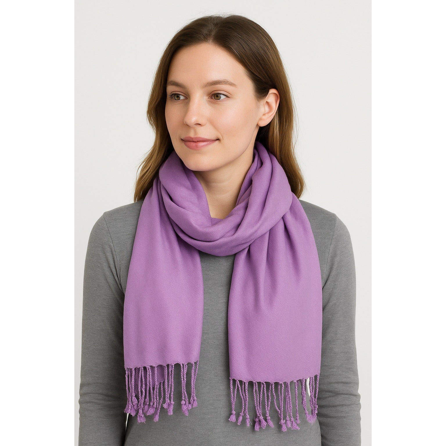 Elegant lilac **Bijoux Terner Pseudo Pashmina scarf** crafted from soft 100% viscose. This lightweight wrap adds a touch of sophistication to any outfit and drapes beautifully for both casual and dressy occasions. Finished with twisted fringe ends and a subtle sheen for a refined look.