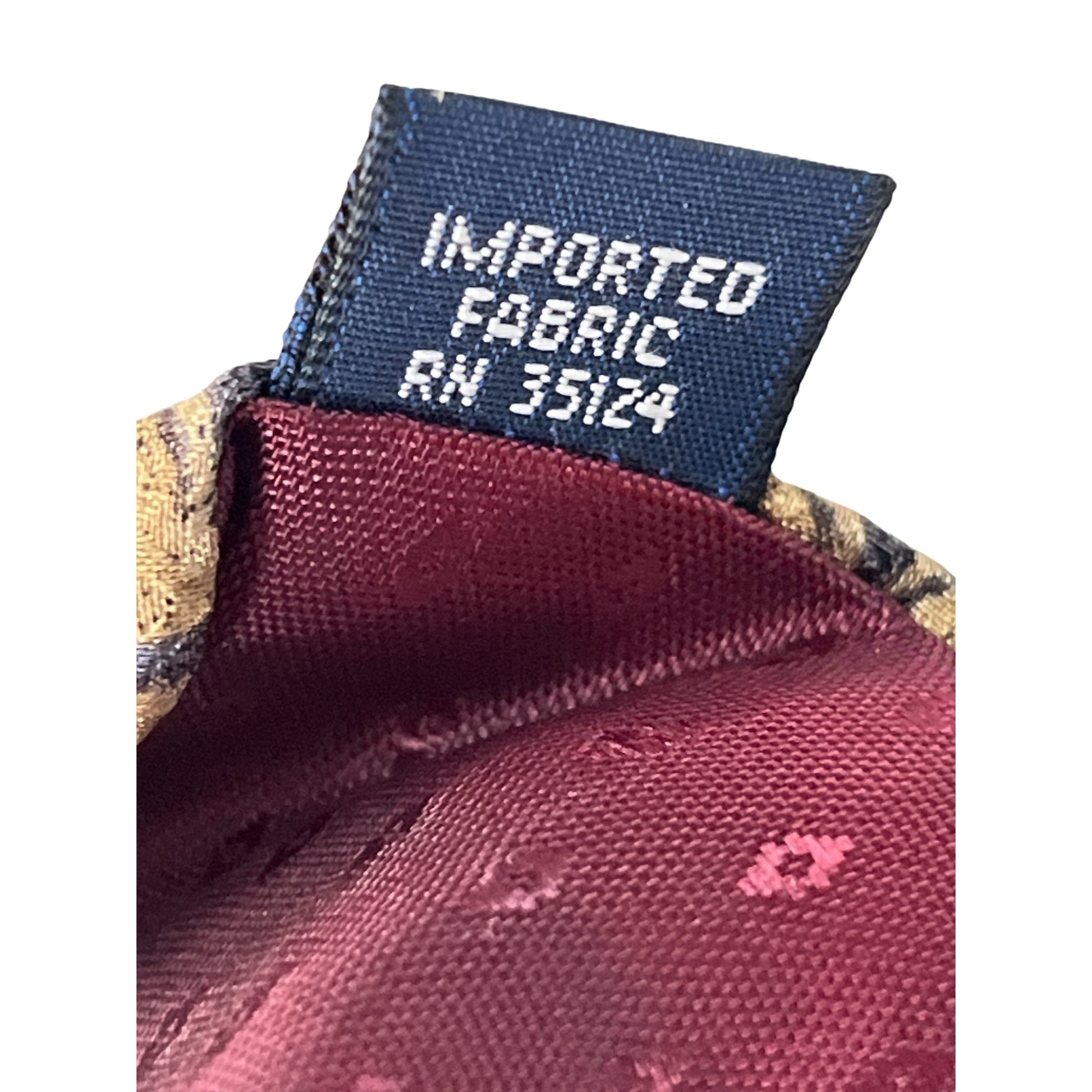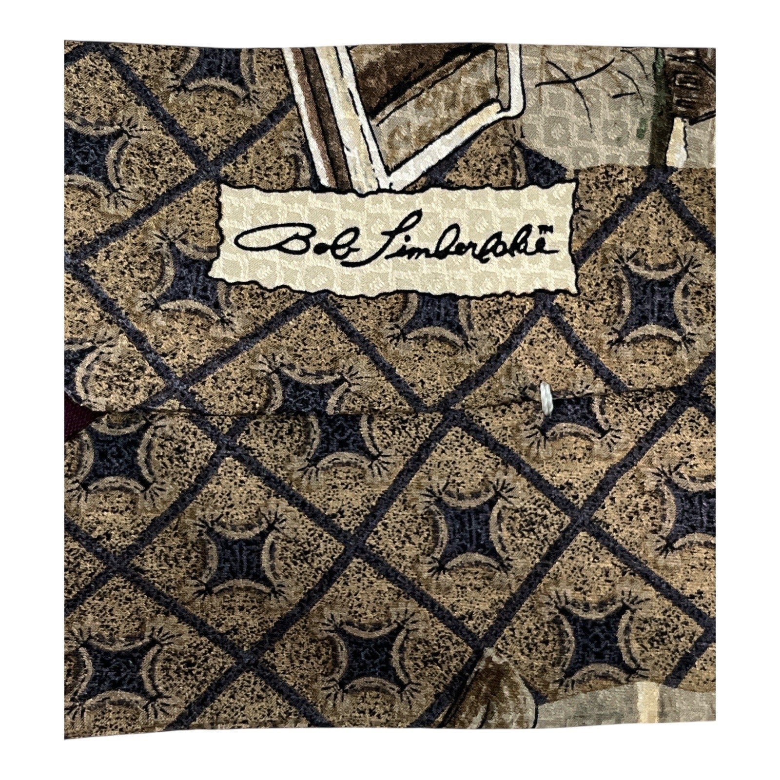 Bob Timberlake licensed artwork necktie featuring classic Americana scenes with boats, cottages, and coastal landscapes. Designed for Bee Line and made in the USA from 100% silk. The tie includes Bob Timberlake’s printed signature as part of the original licensed artwork design, set against a geometric background with a contrasting burgundy lining. A collectible piece of vintage American menswear with strong appeal to Timberlake and Americana collectors.