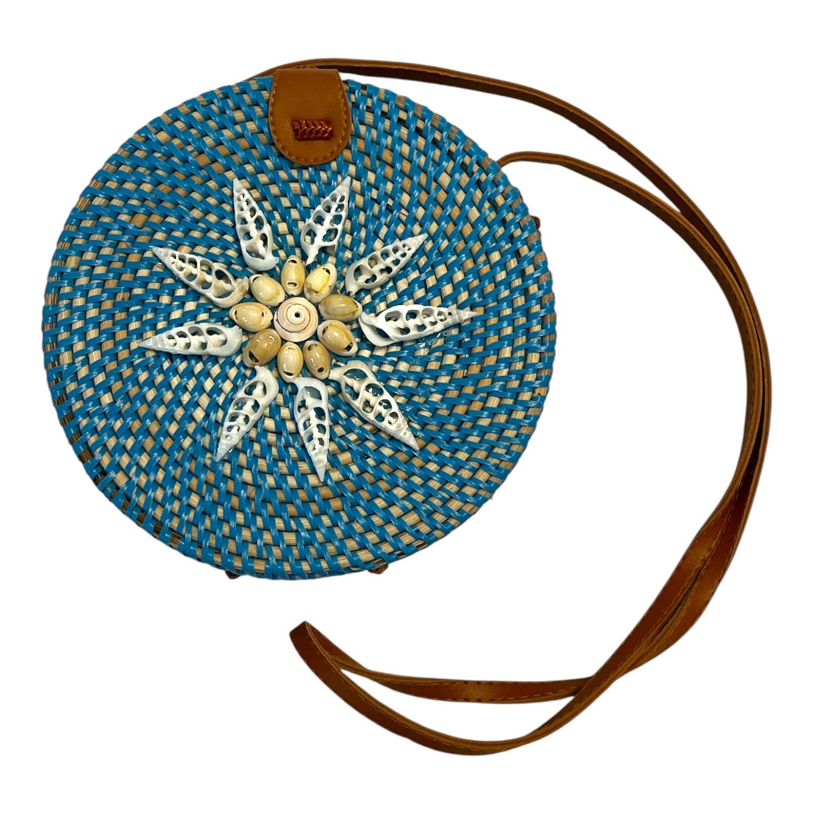 Boho Round Woven Rattan Shell Bag | Blue Straw Circle Crossbody Purse | 8" with 20” Drop | Made in Philippines