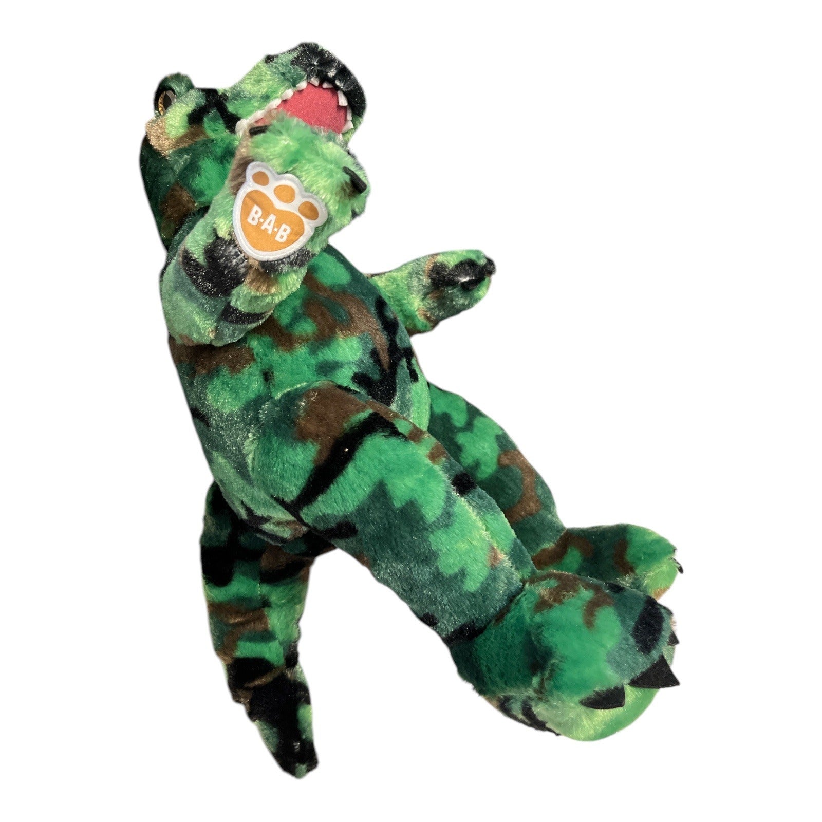Build-A-Bear Workshop plush dinosaur featuring a green camouflage pattern with embroidered details and soft, plush fabric. This larger 17 inch T-Rex style dinosaur stands upright and makes a fun display piece, gift, or addition to a Build-A-Bear collection.