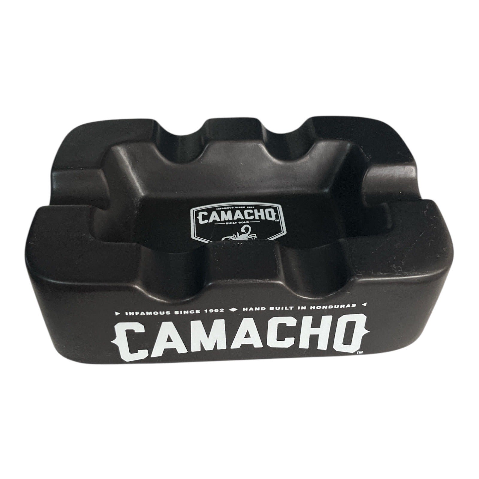 Heavy ceramic cigar ashtray by Camacho Cigars featuring four cigar rests and bold branding on all sides. Matte black finish with the iconic scorpion logo and Camacho name. Designed for stability and everyday cigar use, making it a great piece for a cigar lounge, bar, office, or collector display.