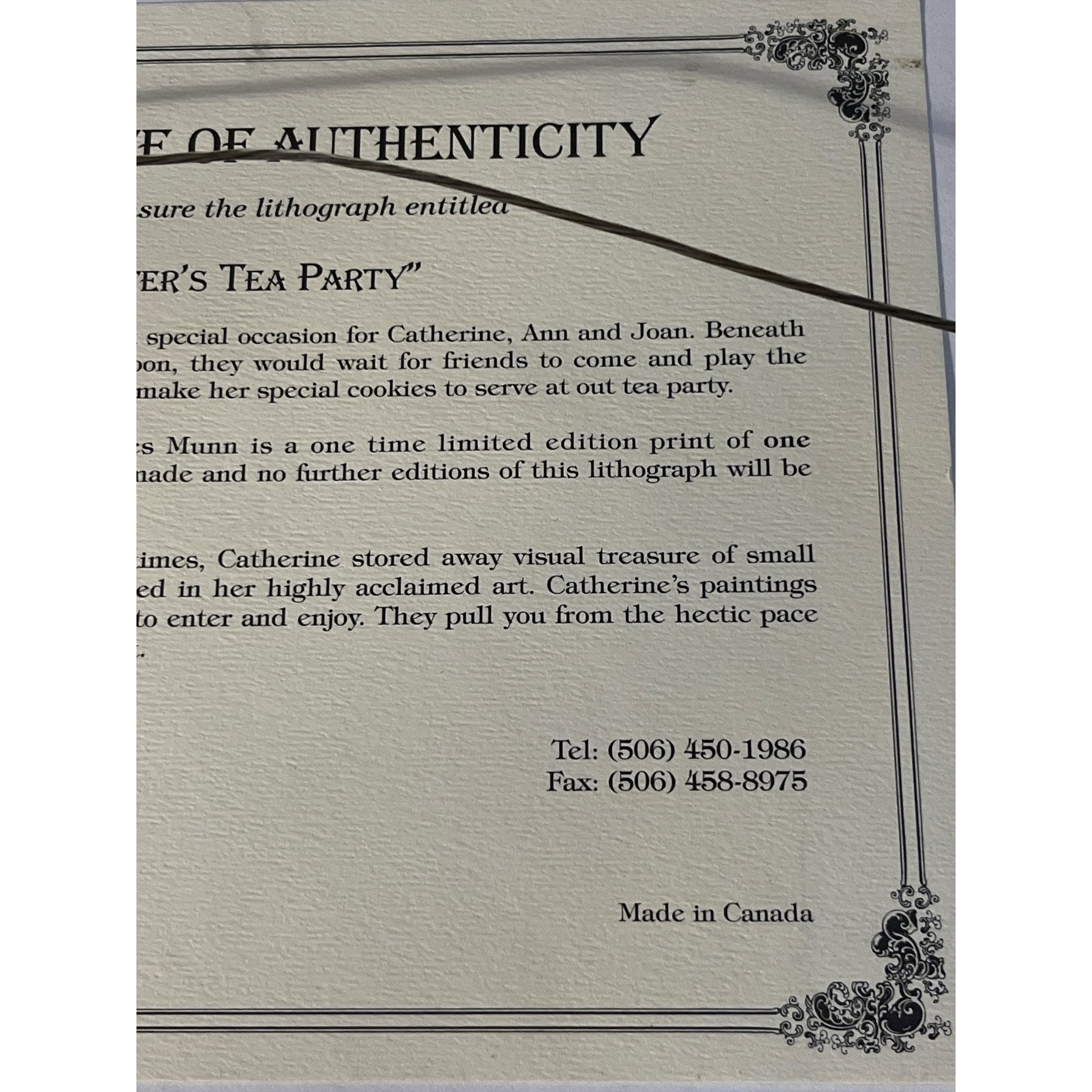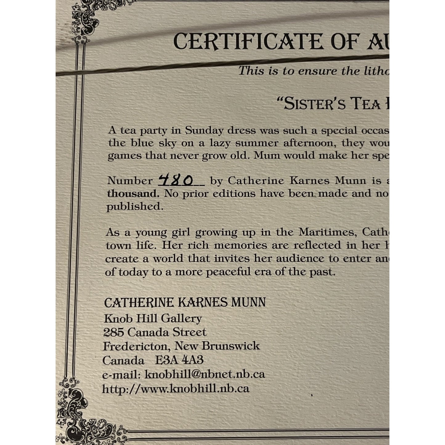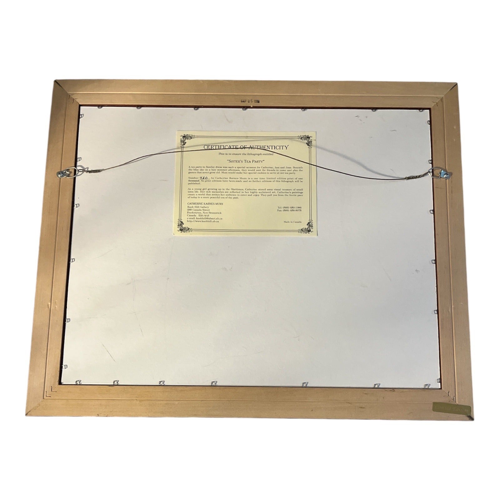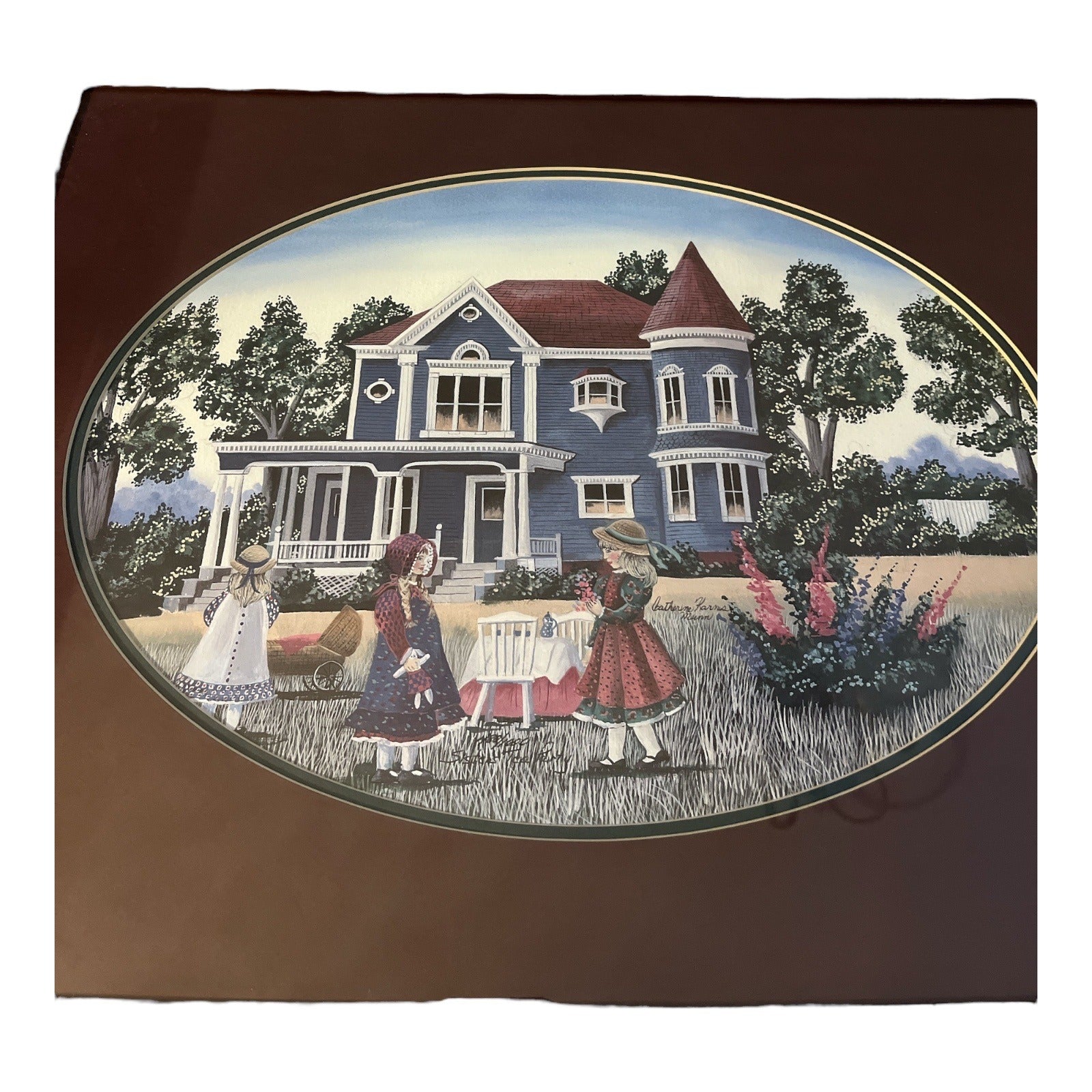 Framed limited edition lithograph print titled “Sister’s Tea Party” by Canadian artist Catherine Karnes Munn. This nostalgic artwork depicts a Victorian home with three girls in bonnets and Sunday dress enjoying a tea party in the garden. The print is signed and hand-numbered 480/1000 by the artist and includes the original certificate of authenticity on the back.
