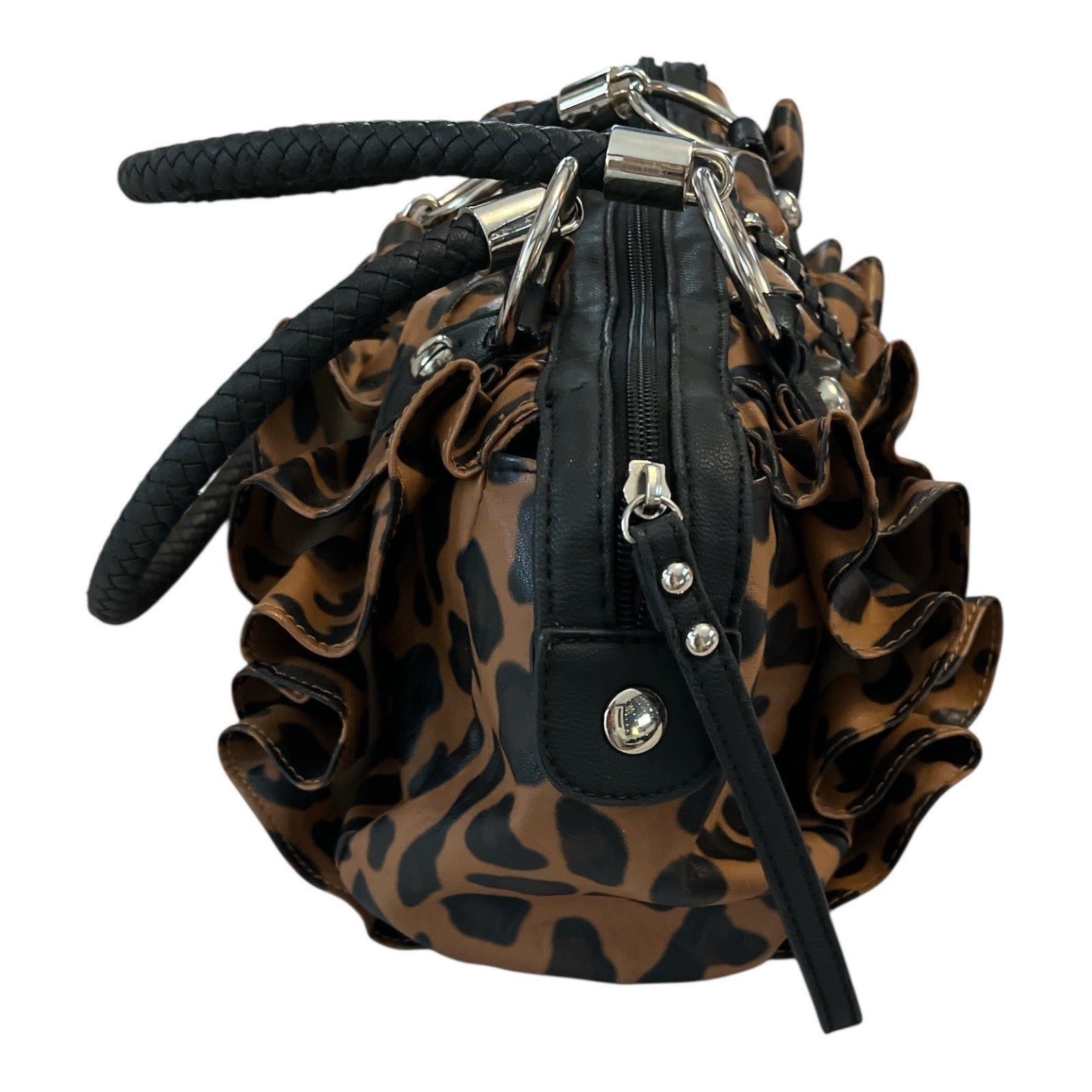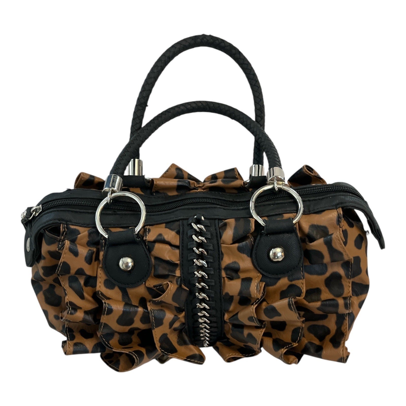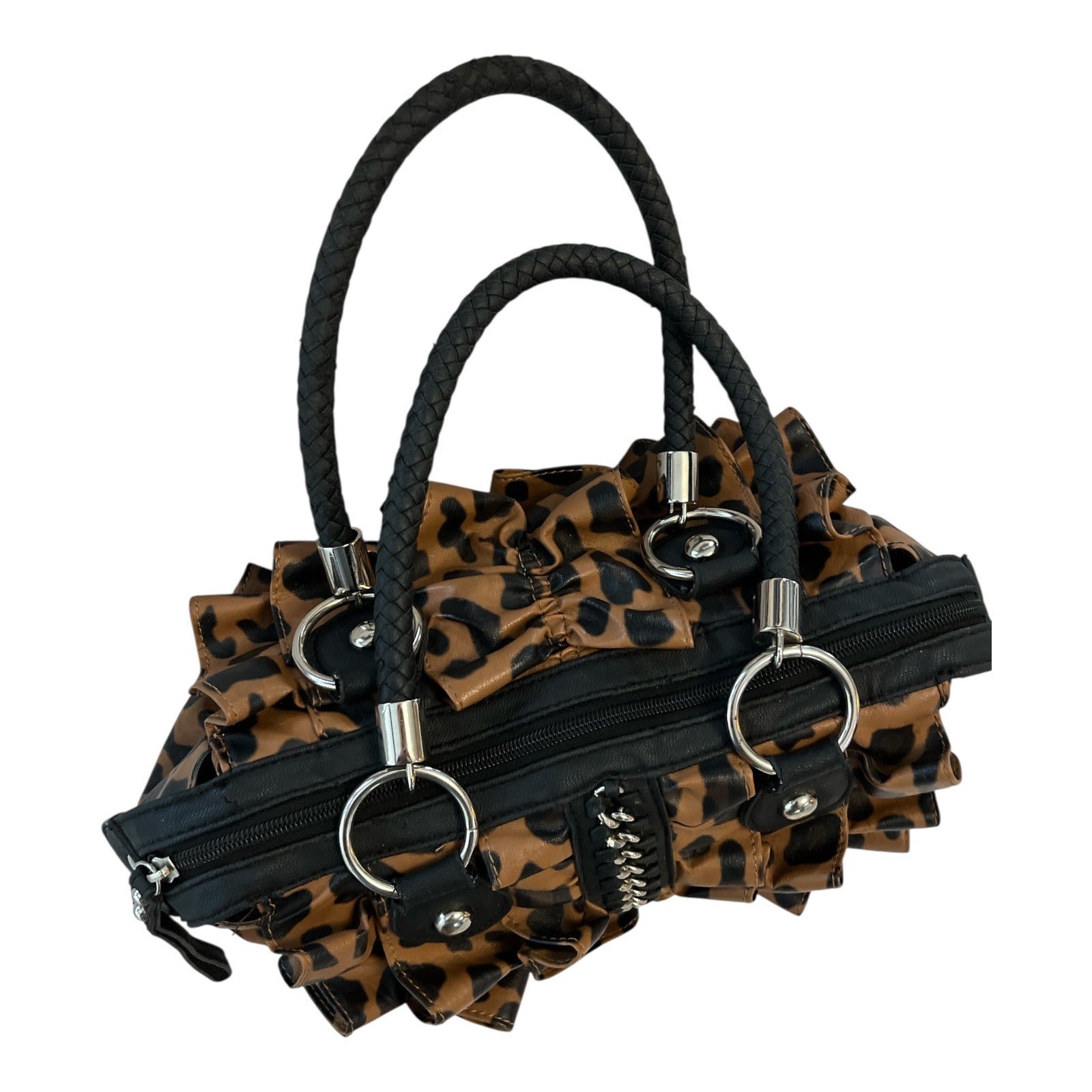 Cato Brown Leopard Print Ruffle Handbag – Black Braided Handles – Edgy Rockabilly Purse