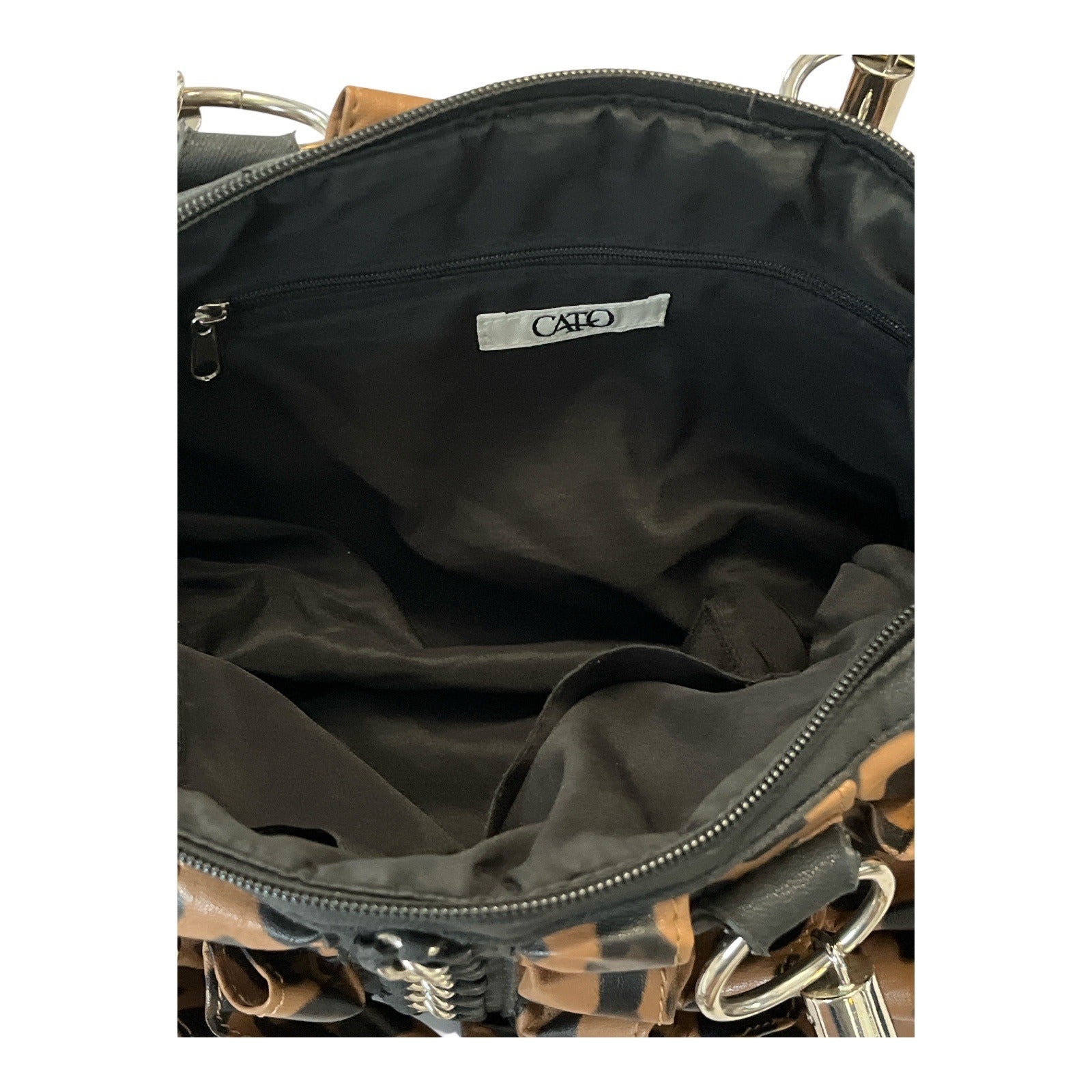 Make a bold statement with this fierce and flirty Cato handbag, featuring a brown and black leopard print with layered ruffle details and edgy chain lacing. Braided black handles and silver-tone hardware add a stylish finish to this eye-catching purse.
