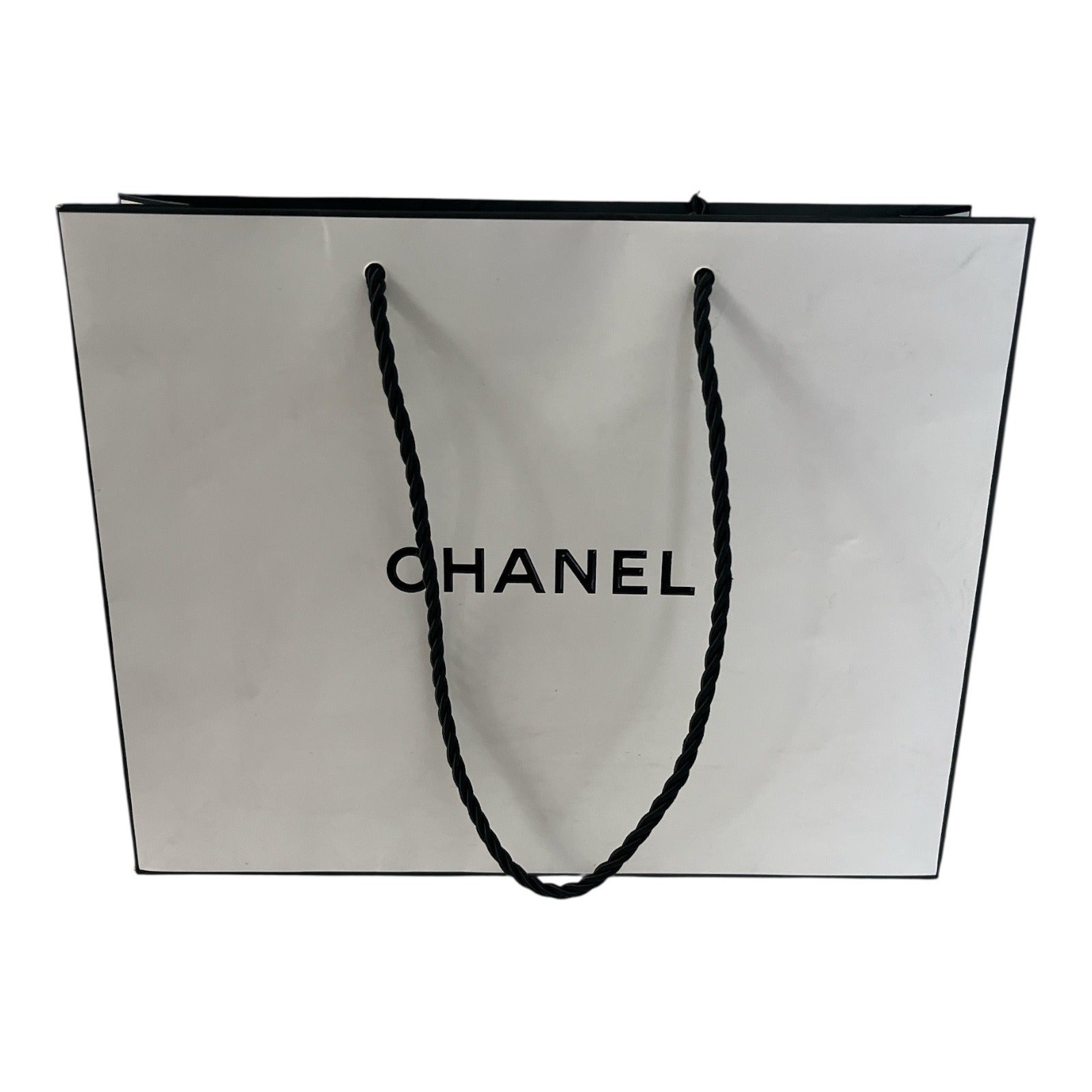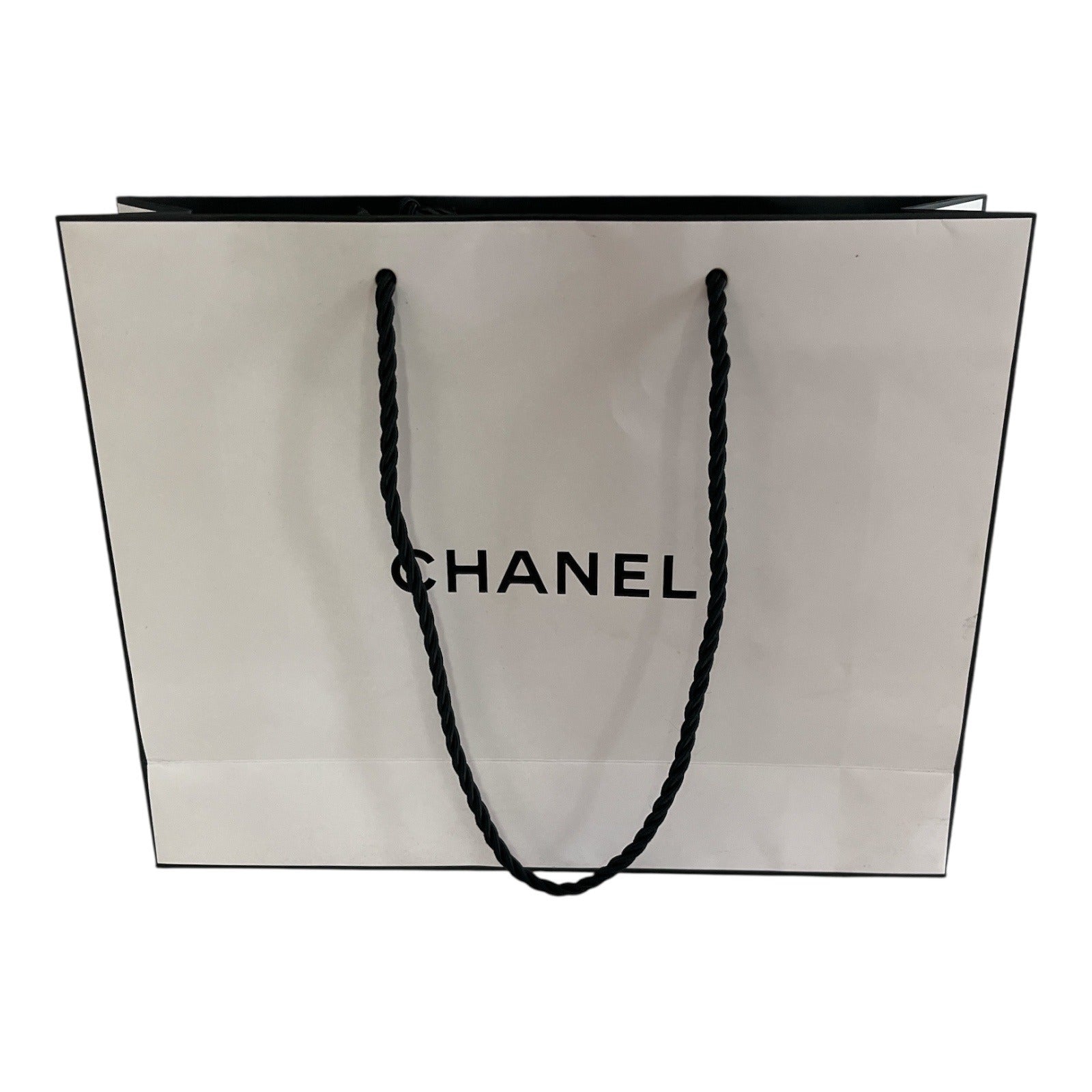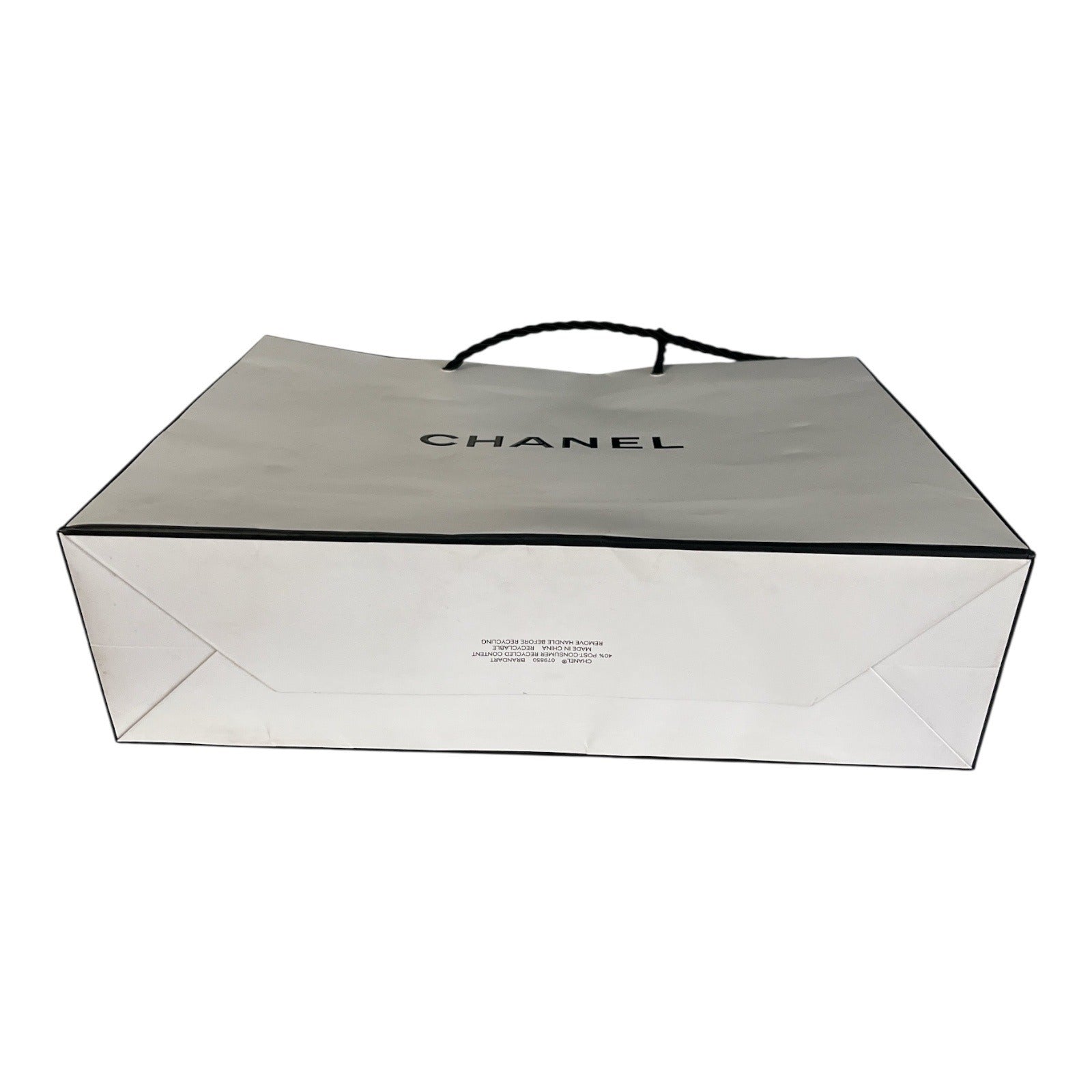 Elegant Chanel shopping bag, perfect for gifting, display, or storage. Features the iconic black logo on white with sturdy black rope handles. A must-have for collectors of luxury brand packaging or those looking to elevate presentation for special gifts.
