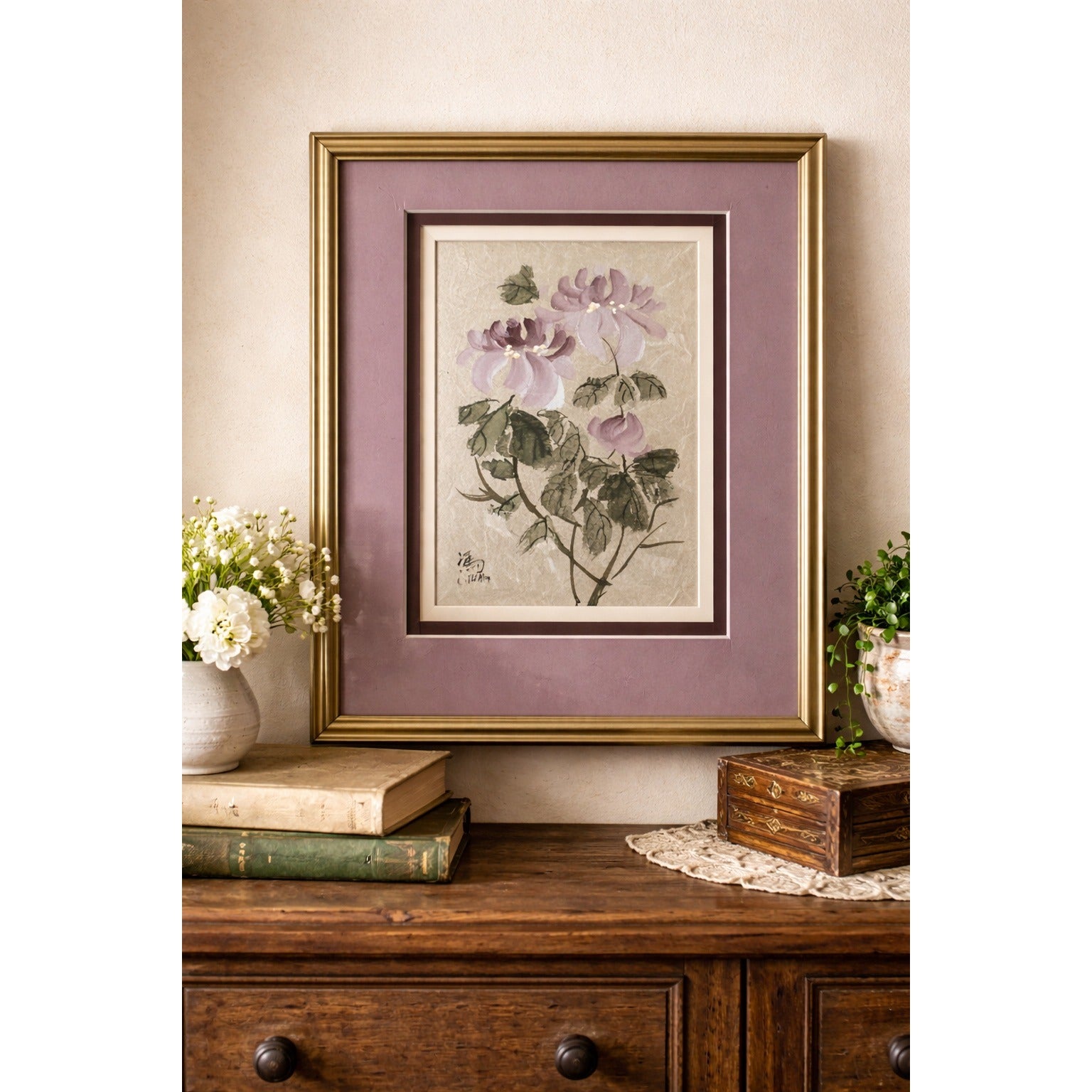 Delicate Chinese brush painting featuring soft lavender blossoms and leafy branches, signed by the artist Charlotte Fung Miller. The artwork is presented in a mauve mat with layered inner matting that complements the floral tones. Traditional brushwork and muted colors give this piece a calm, timeless feel. Sealed in plastic and ready for display or gifting.