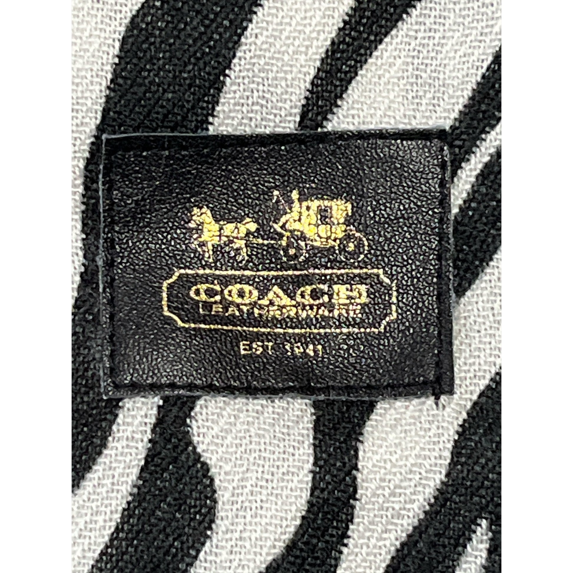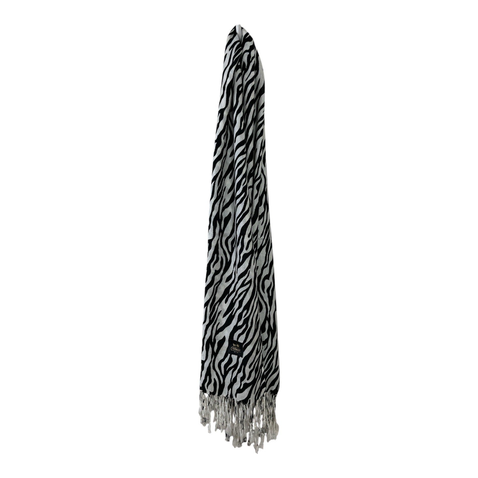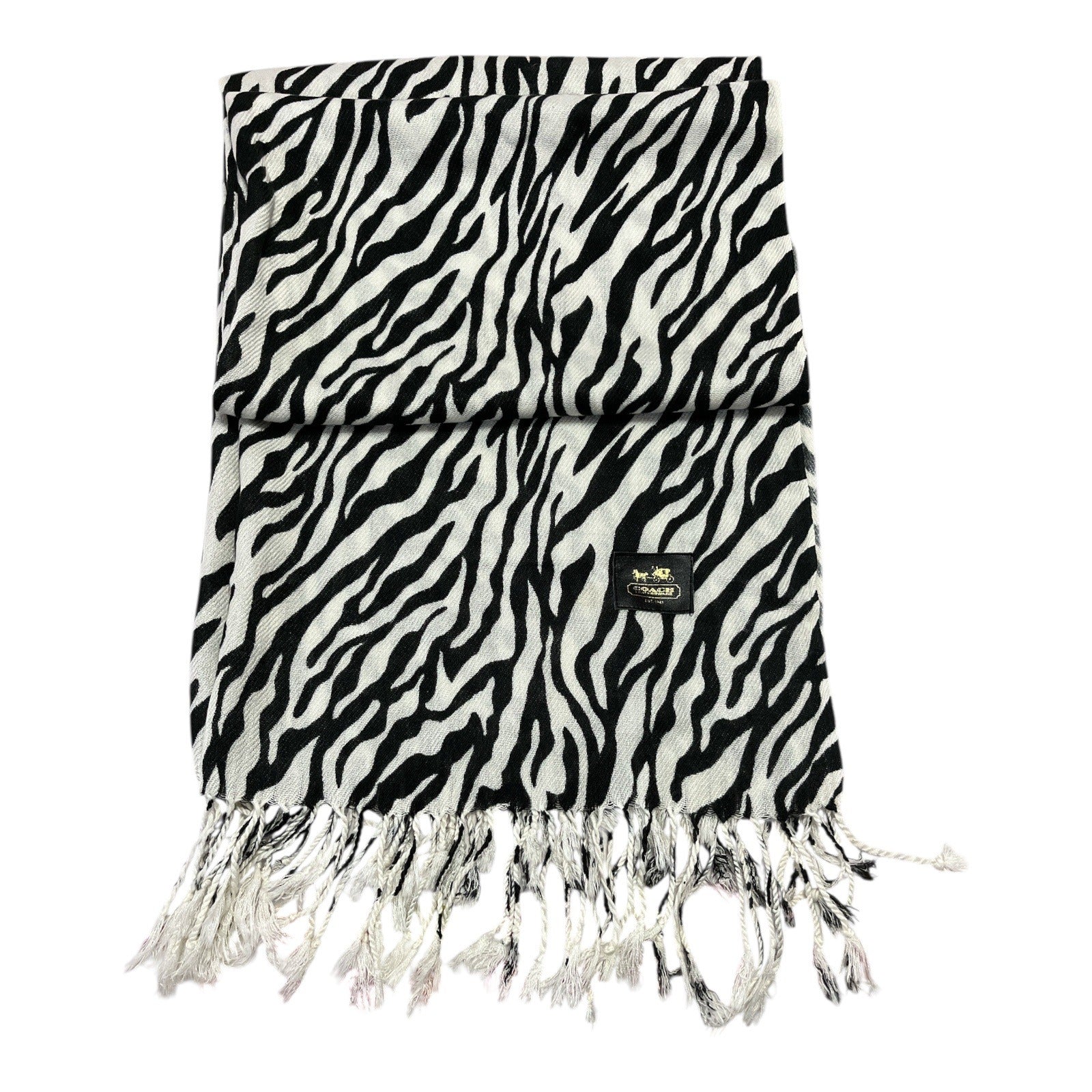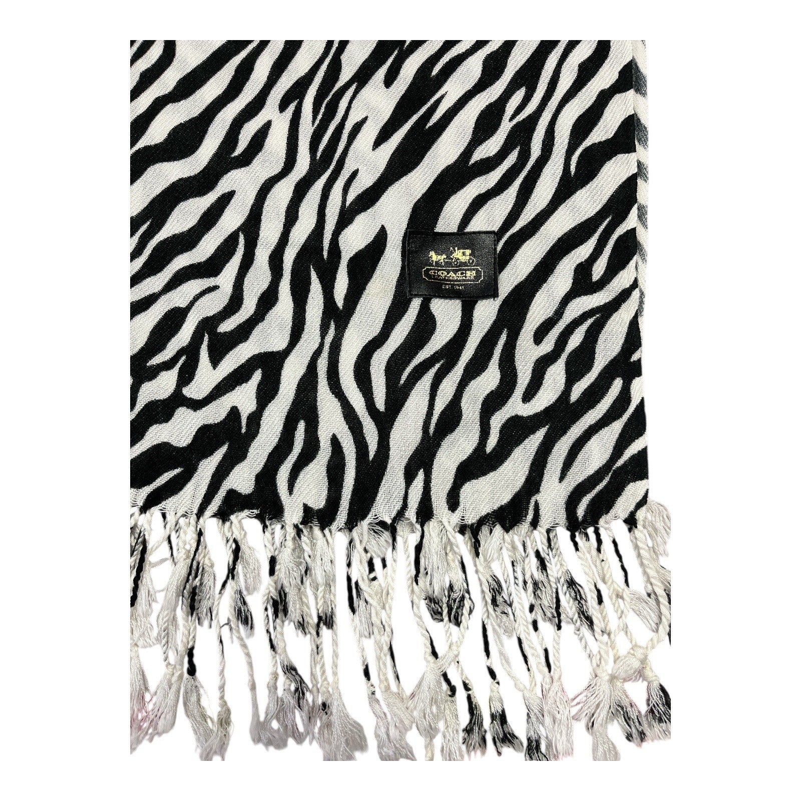 This authentic Coach scarf features a striking black and white zebra pattern with fringe edges. The classic horse-and-carriage logo patch adds a designer touch. Oversized in length and width, it can be styled as a wrap, shawl, or winter scarf. 1990s - 2000s