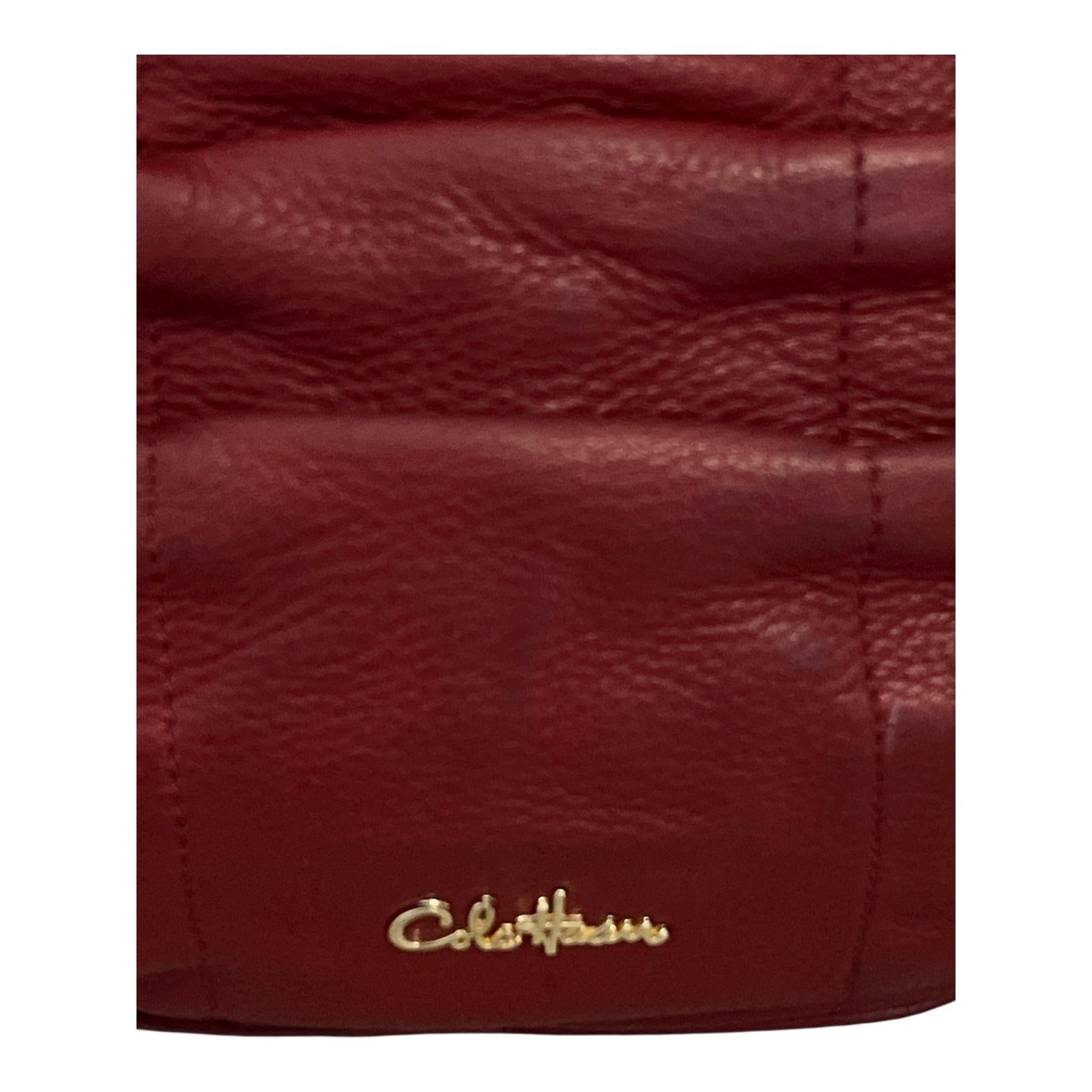 Add a pop of color and timeless style to your wardrobe with this genuine leather shoulder bag by Cole Haan. Featuring a rich red exterior with elegant ruched detailing, this bag offers both sophistication and functionality. The interior includes a zip pocket, two slip pockets, and a woven black lining, all trimmed in red leather. Finished with gold-tone hardware and dual exterior zip pockets for easy access on the go.