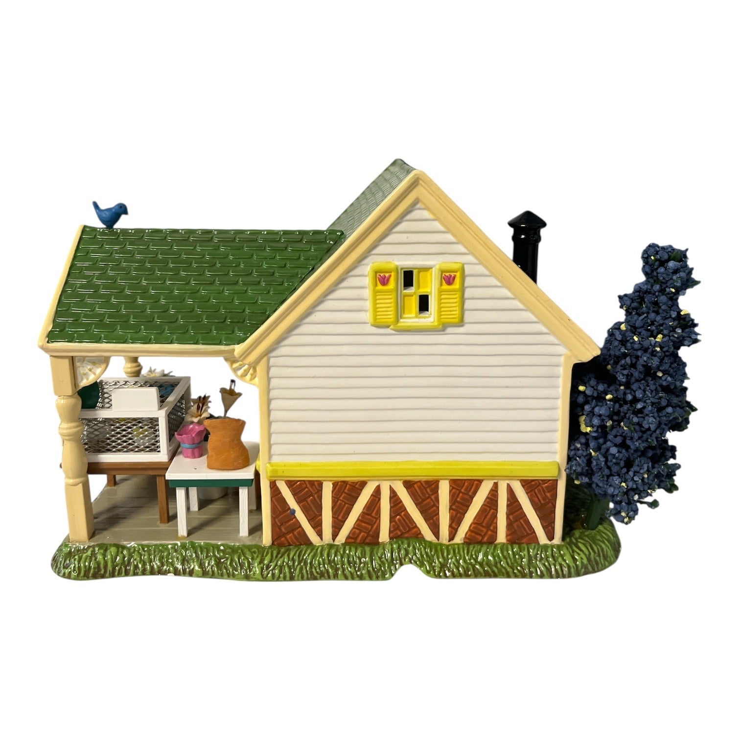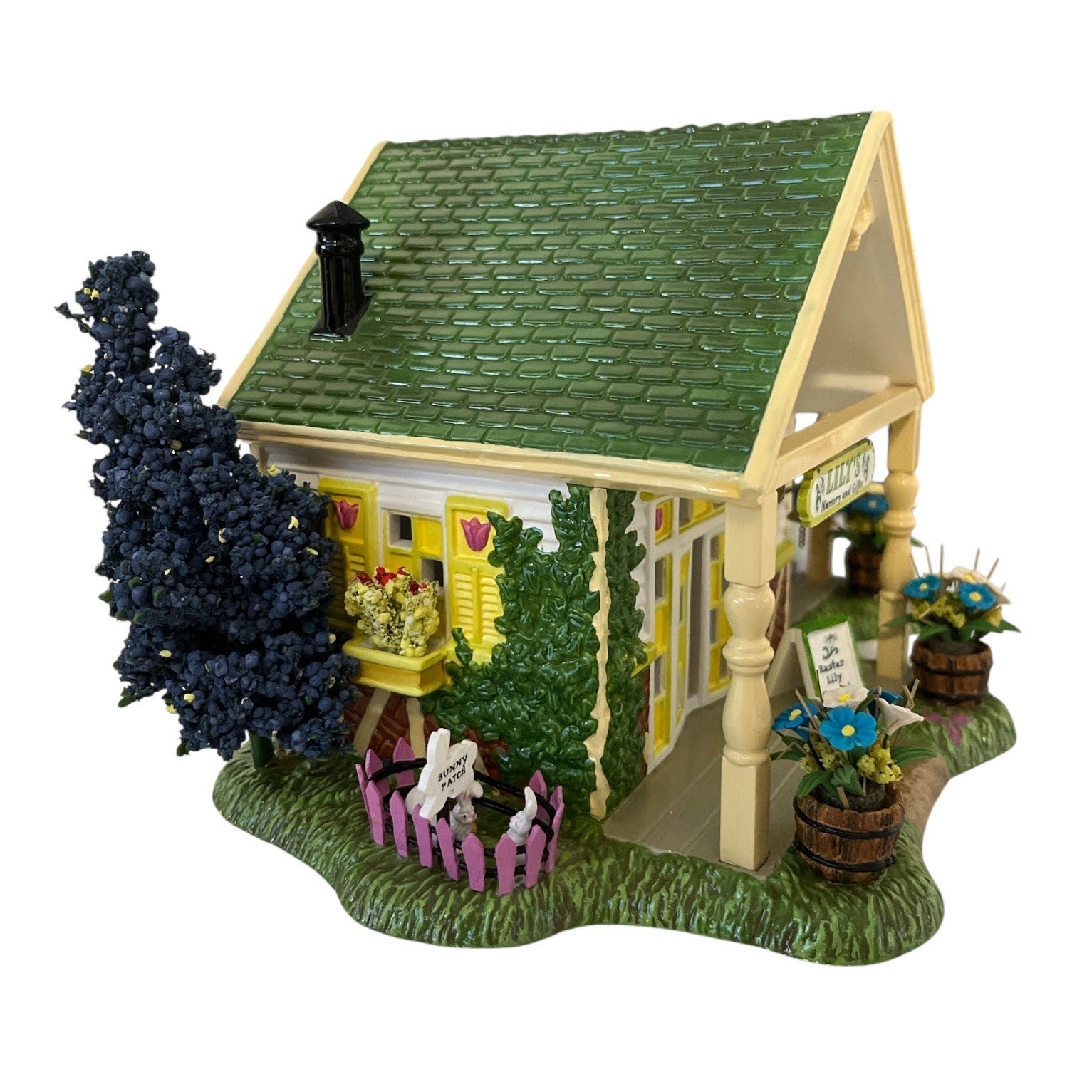 Charming Department 56 Snow Village piece titled Lily’s Nursery & Gifts featuring a cheerful spring shop scene with pastel accents, floral details, and porch display. Includes original coordinating add-on figurines in their separate box plus working light cord for a warm illuminated display. A sweet seasonal collectible perfect for Easter villages or year-round miniature displays.