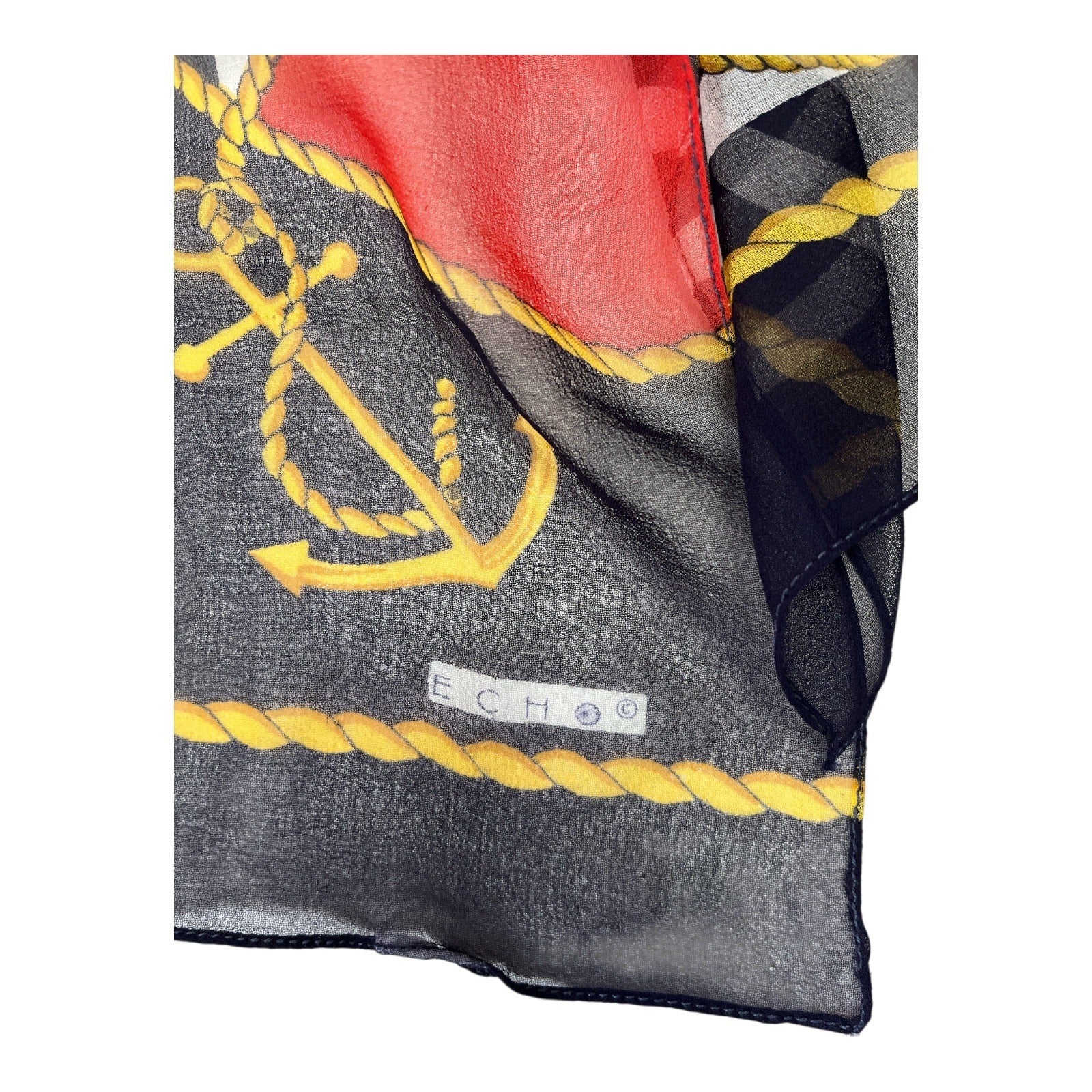 Vintage Echo brand sheer chiffon scarf featuring a bold nautical theme with anchors, ship wheels, ropes, and chain accents. The vibrant mix of red, black, yellow, and white stripes makes this piece a standout accessory for any outfit. Lightweight and semi-sheer with rolled edges.