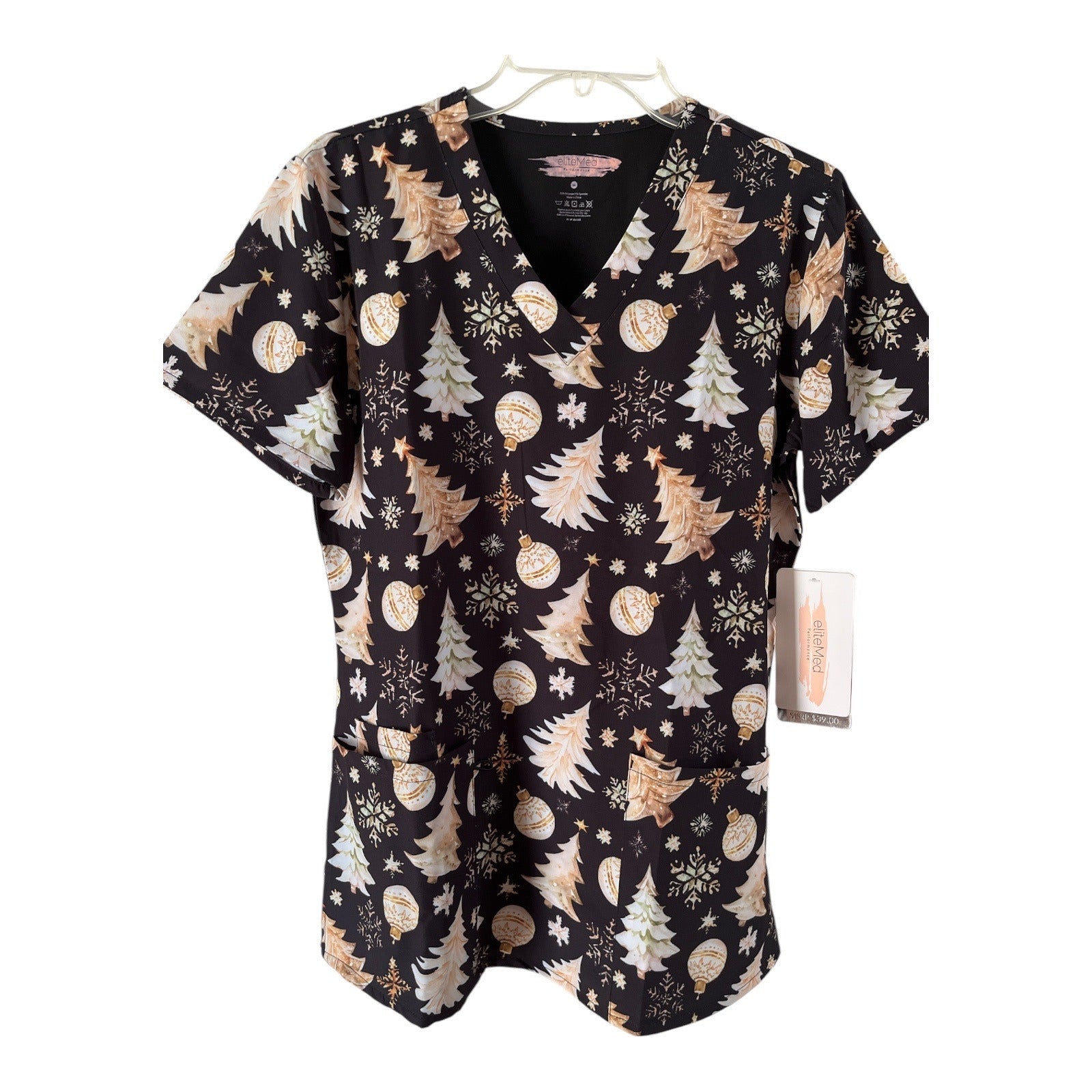 This festive scrub top by Elite Med features a cheerful Christmas print with decorated trees, snowflakes, and ornaments against a black background. Perfect for adding holiday spirit to your workday. Includes two front patch pockets for functionality. New with tags.