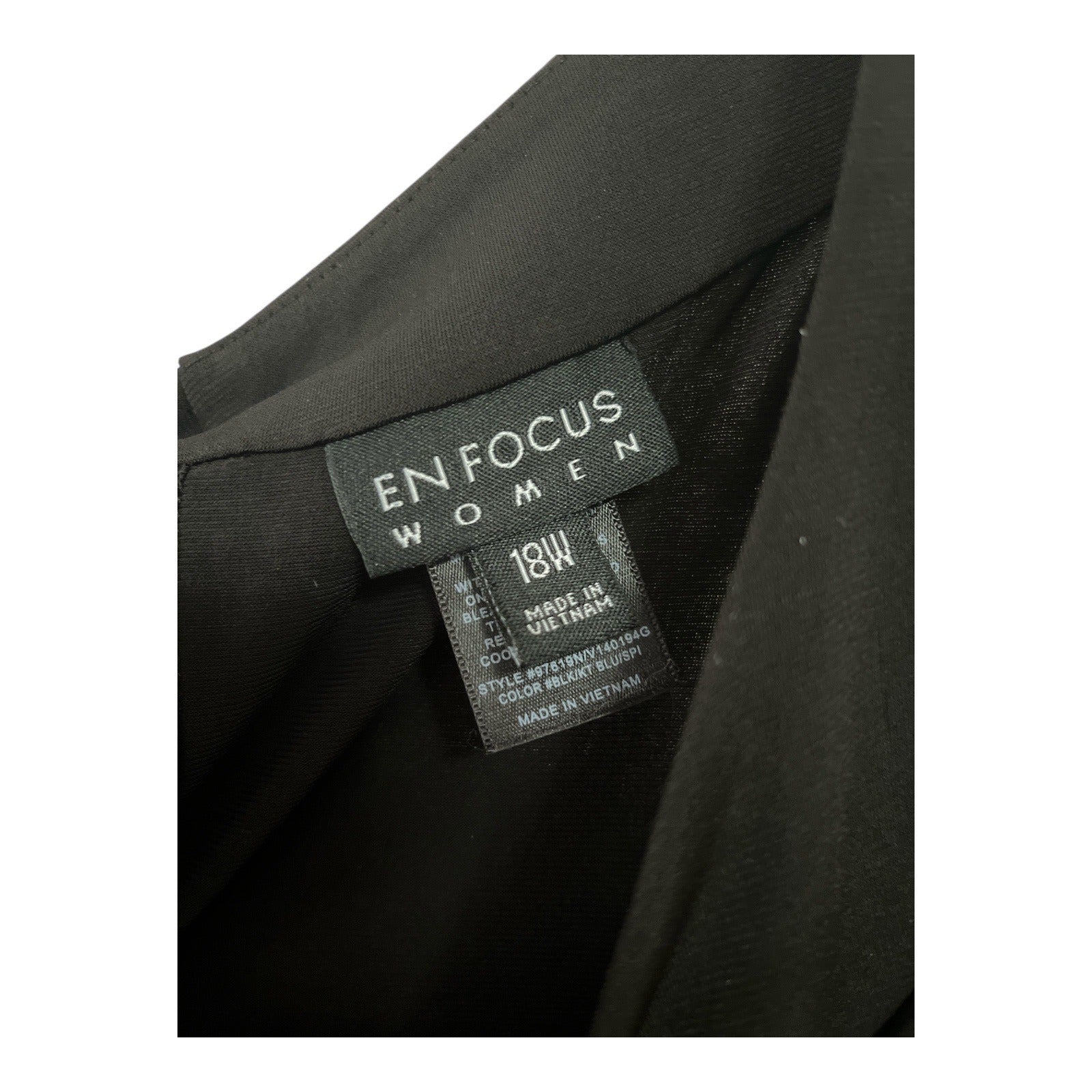 Bold and modern sleeveless dress from En Focus Women in plus size 18W. Features wide black, blue, and orange colorblock stripes, a round neckline with button detail, and a tie-back design for added style. Comfortable stretch fabric makes it ideal for casual or semi-dressy occasions.