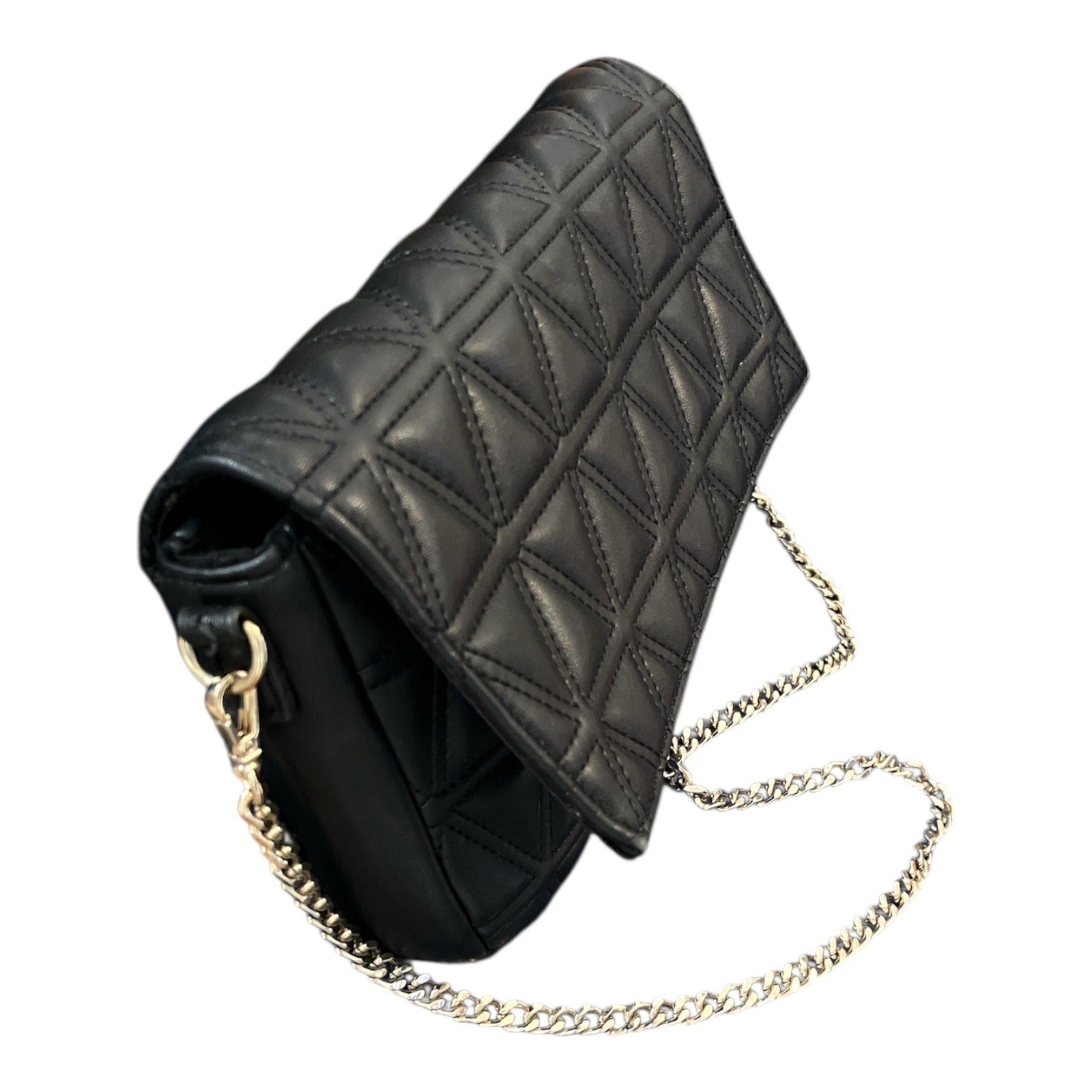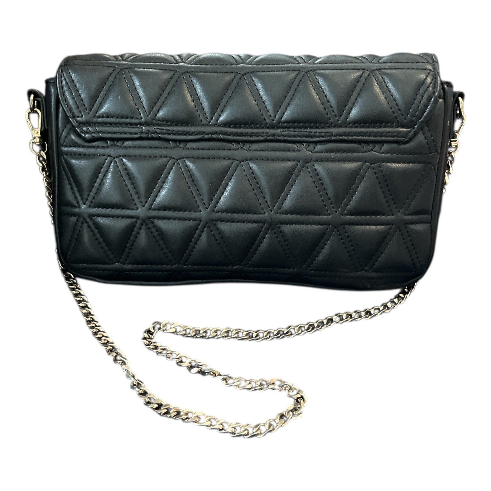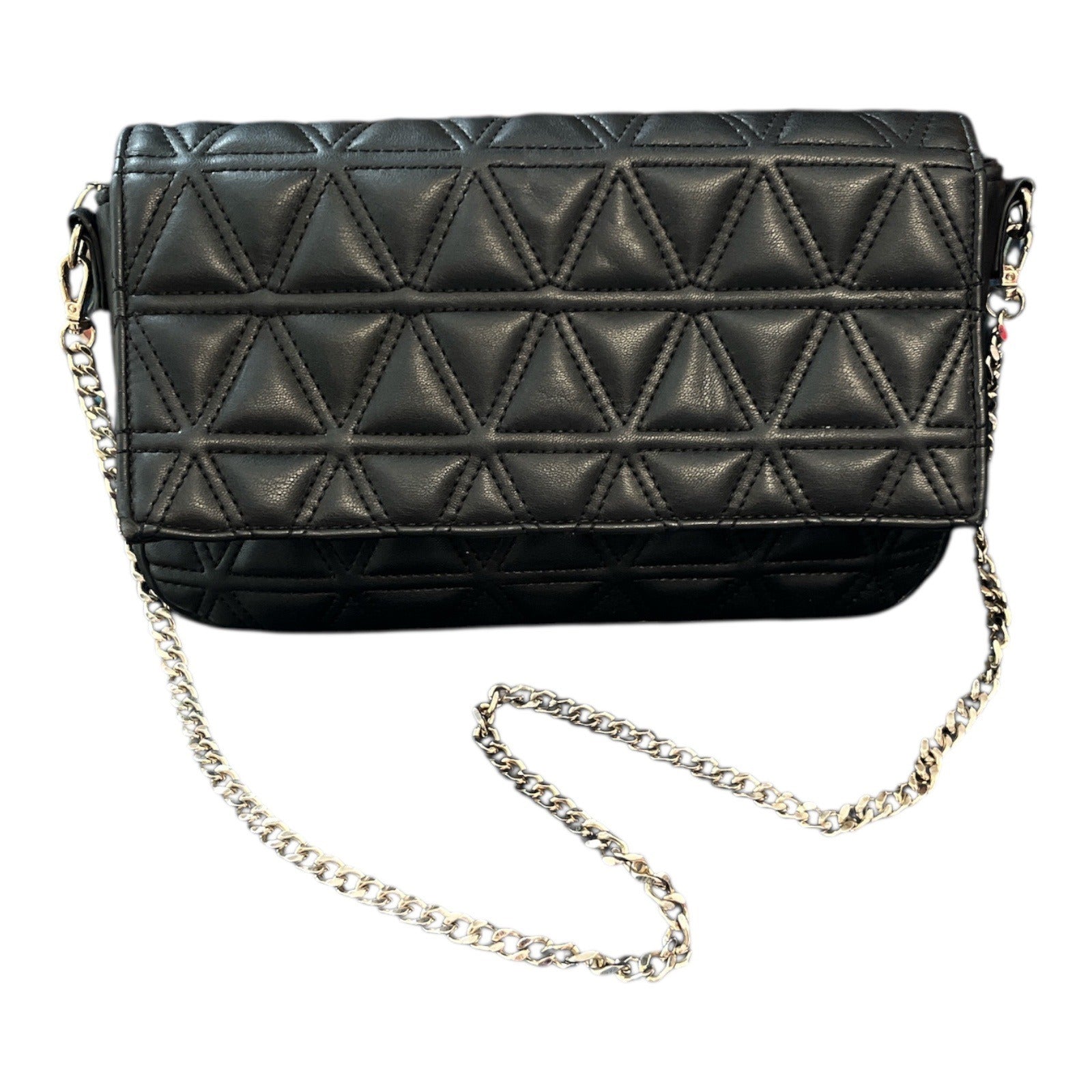 Add a stylish edge to your outfit with this Express crossbody bag, featuring a geometric quilted faux leather design in classic black. The bag has a gold-tone chain strap with a 14-inch drop, magnetic flap closure, and zippered interior pocket. Compact yet functional for day or night use.