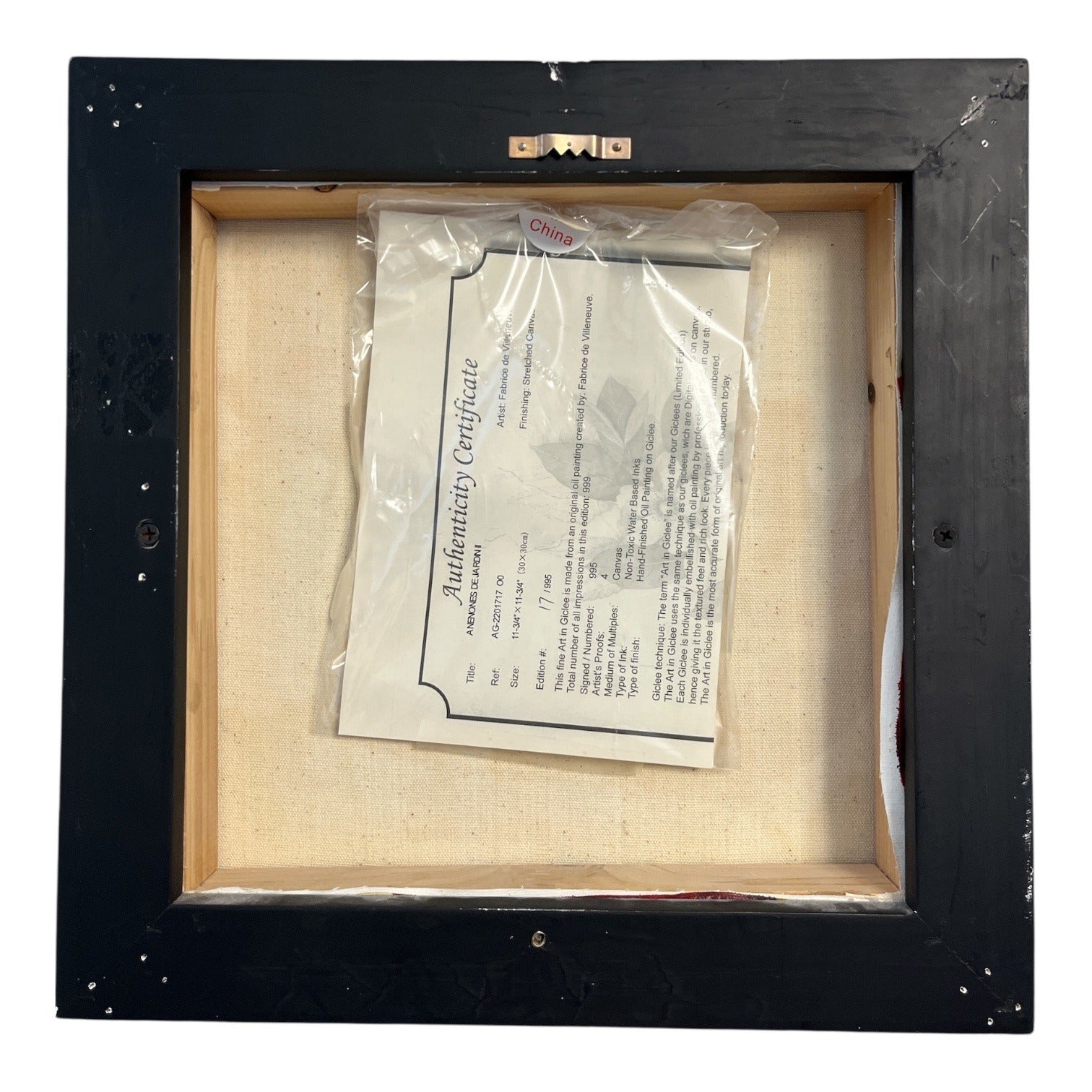 Elegant framed floral giclée titled Anémones de Jardin by listed artist Fabrice de Villeneuve. This signed and numbered limited edition canvas print is hand-finished with oil detailing for a textured painted effect. Features rich red blossoms against a soft botanical background, mounted in a black frame and ready to hang. Includes original certificate of authenticity attached on the back.