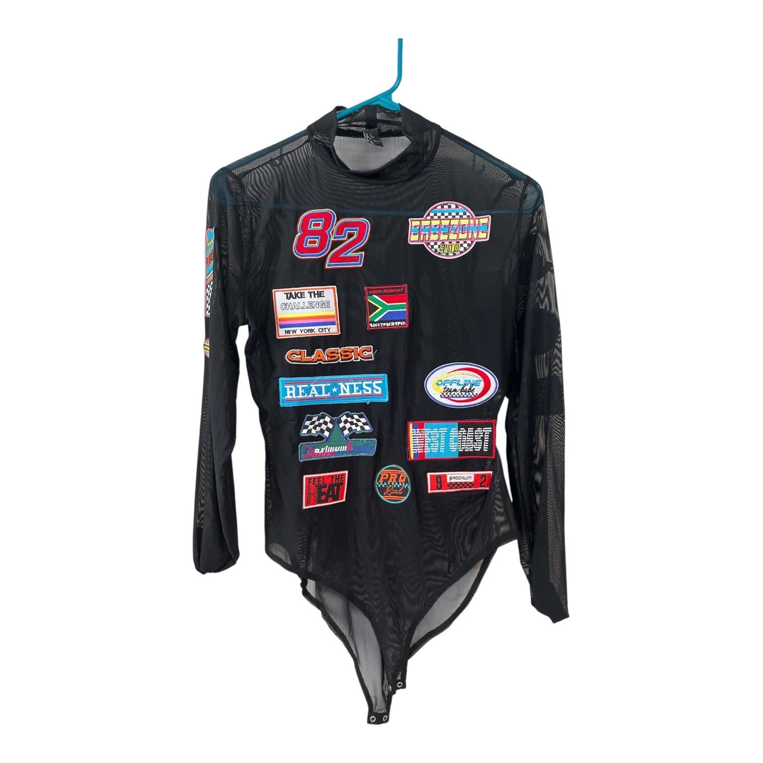 Black sheer mesh bodysuit featuring colorful racing-style patches, mock neck, long sleeves, and snap closure bottom. Stretchy lightweight fabric with statement graphic front and minimal back for edgy streetwear, festival, or layered Y2K looks.