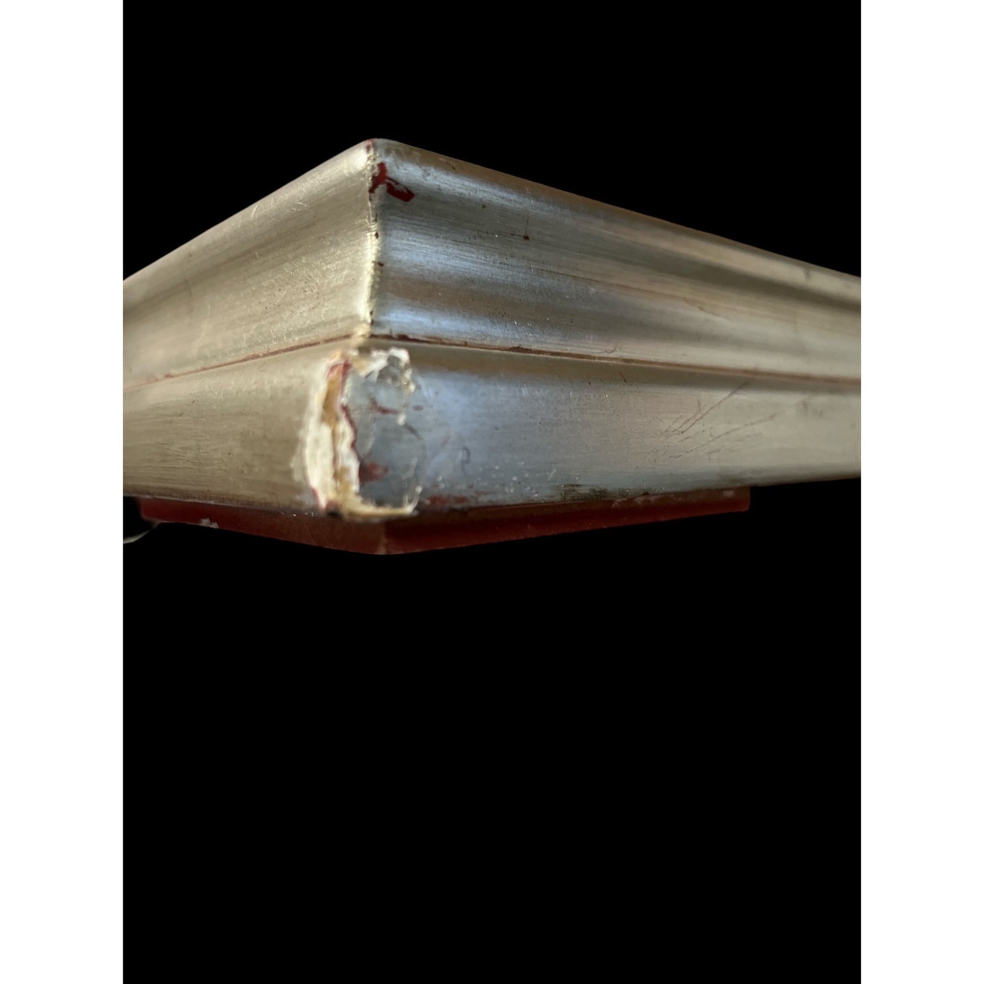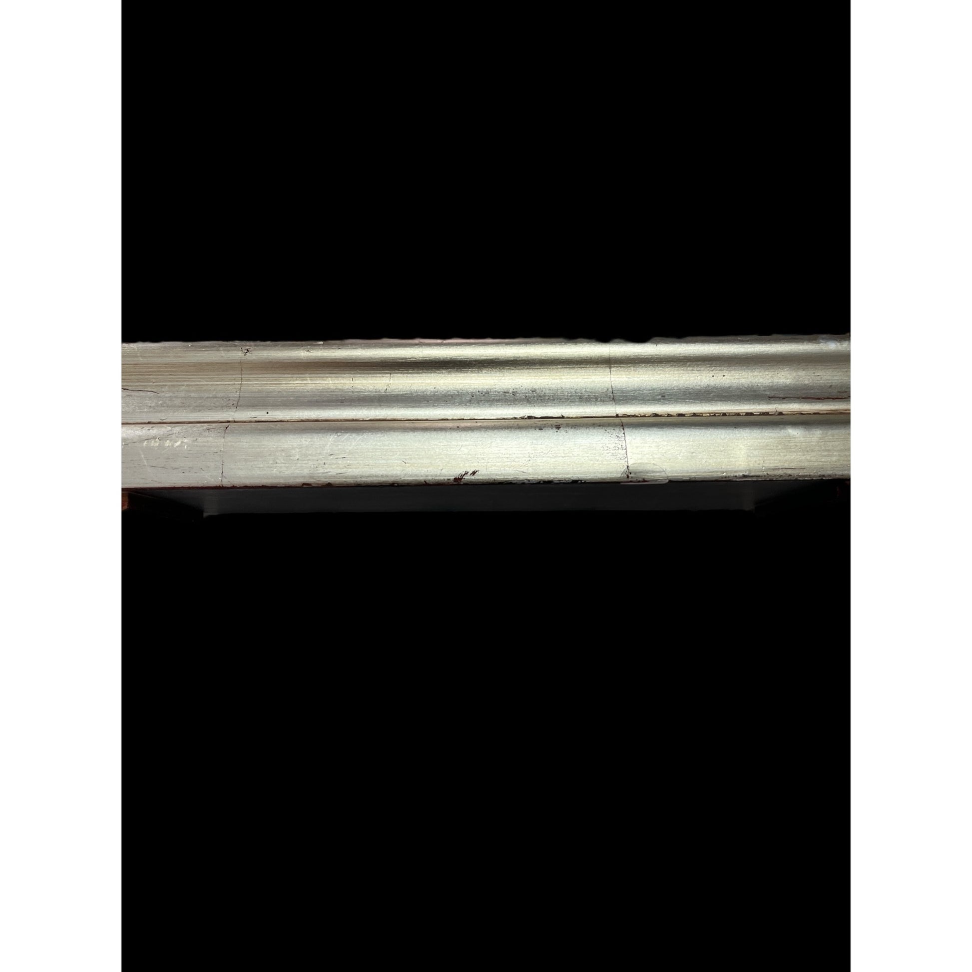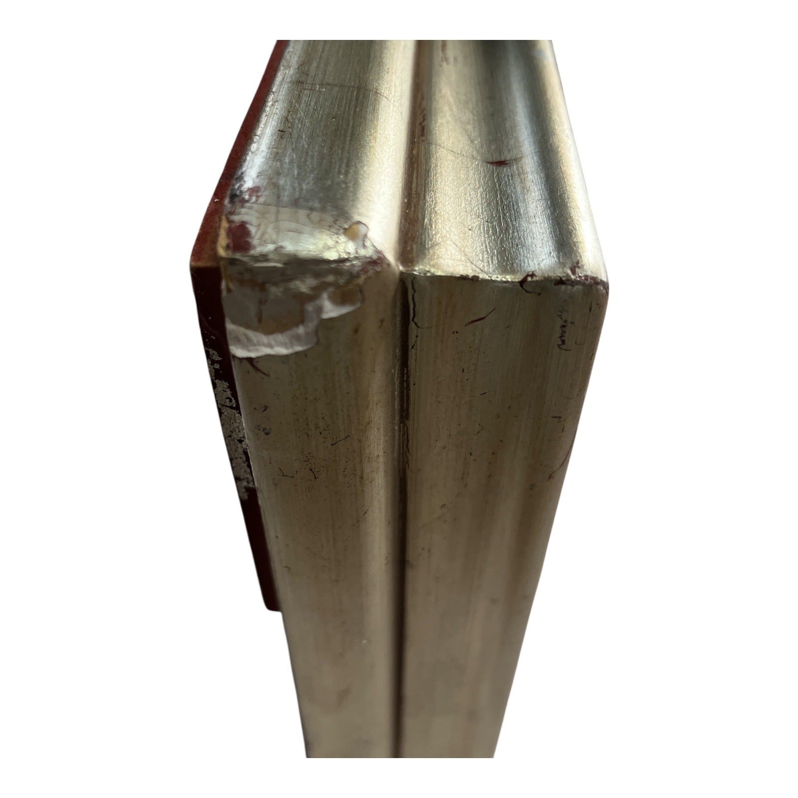 The painting is presented in a substantial, high-quality frame with a wide silver-tone beaded border. The frame construction is solid wood with protective backing and wire hanger, giving the piece both durability and elegance. Its weight reflects the sturdiness and quality of the materials, more like a gallery presentation frame than a lightweight decorative one.