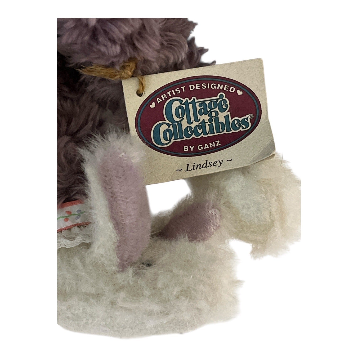 Vintage Ganz Cottage Collectibles artist bear named Lindsey, designed by Christy Rave in 1998. This handcrafted keepsake features a white mohair head, curly purple mohair body, lace collar with pink trim, bow accent, and charming bunny-style feet. A collectible display teddy with classic jointed construction and original tags.