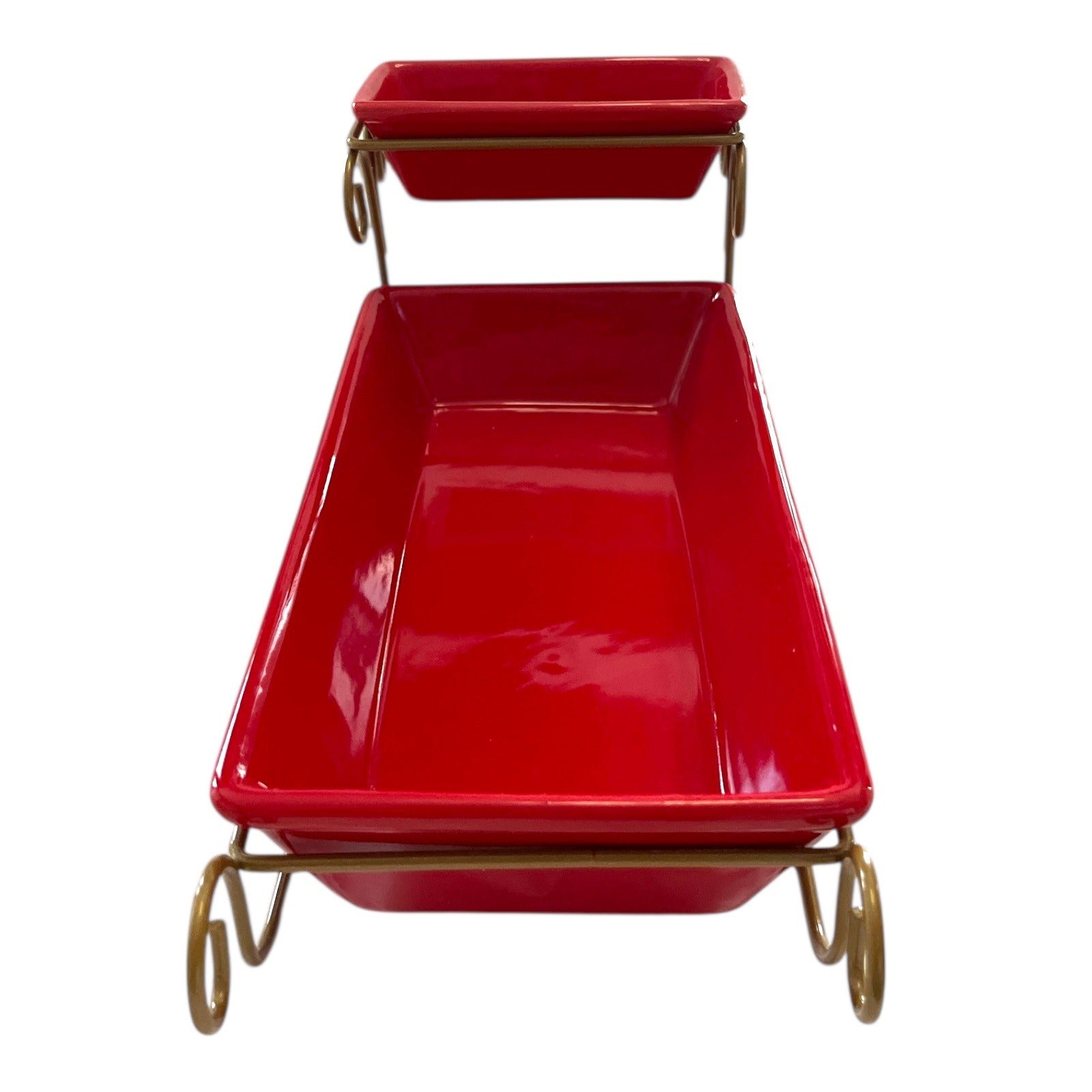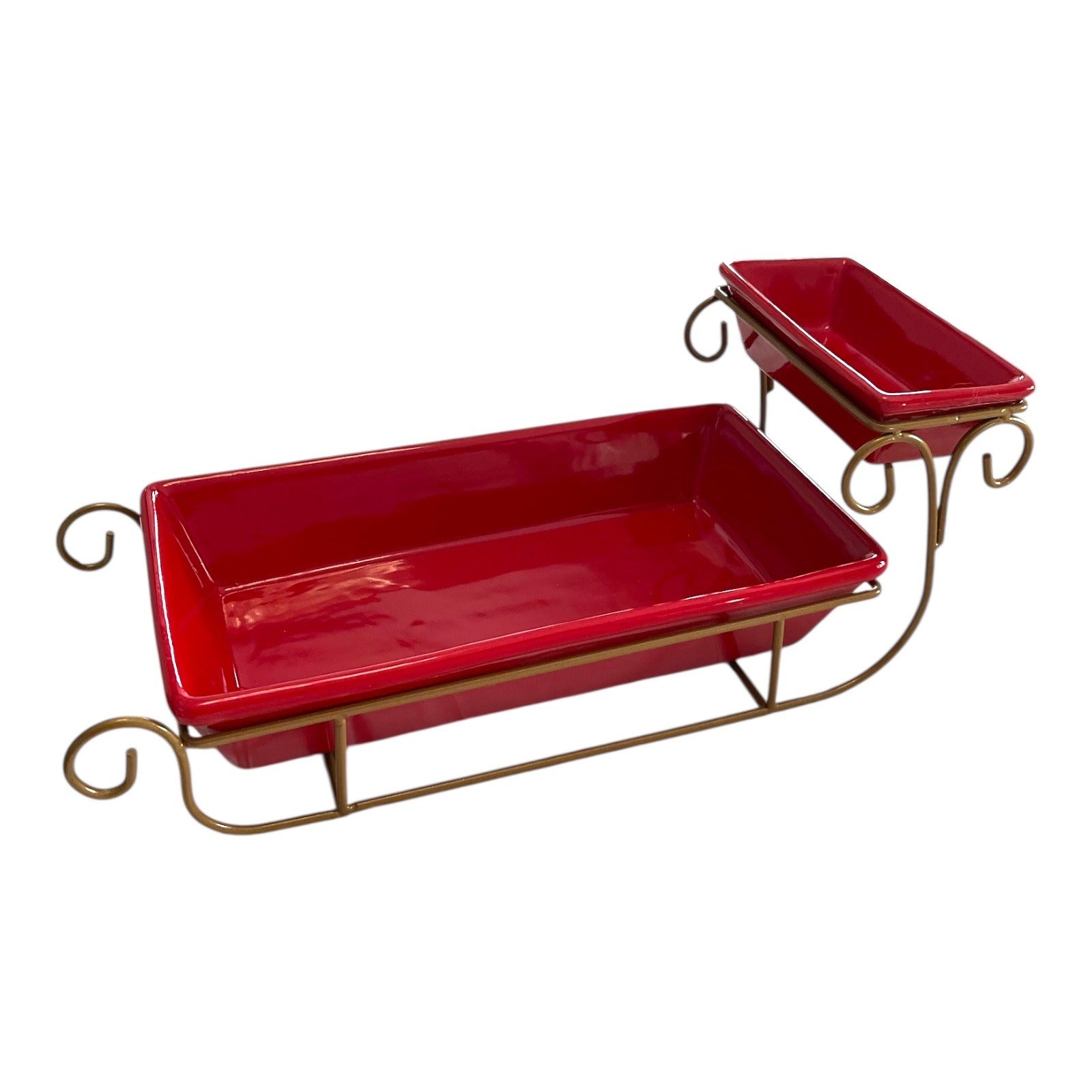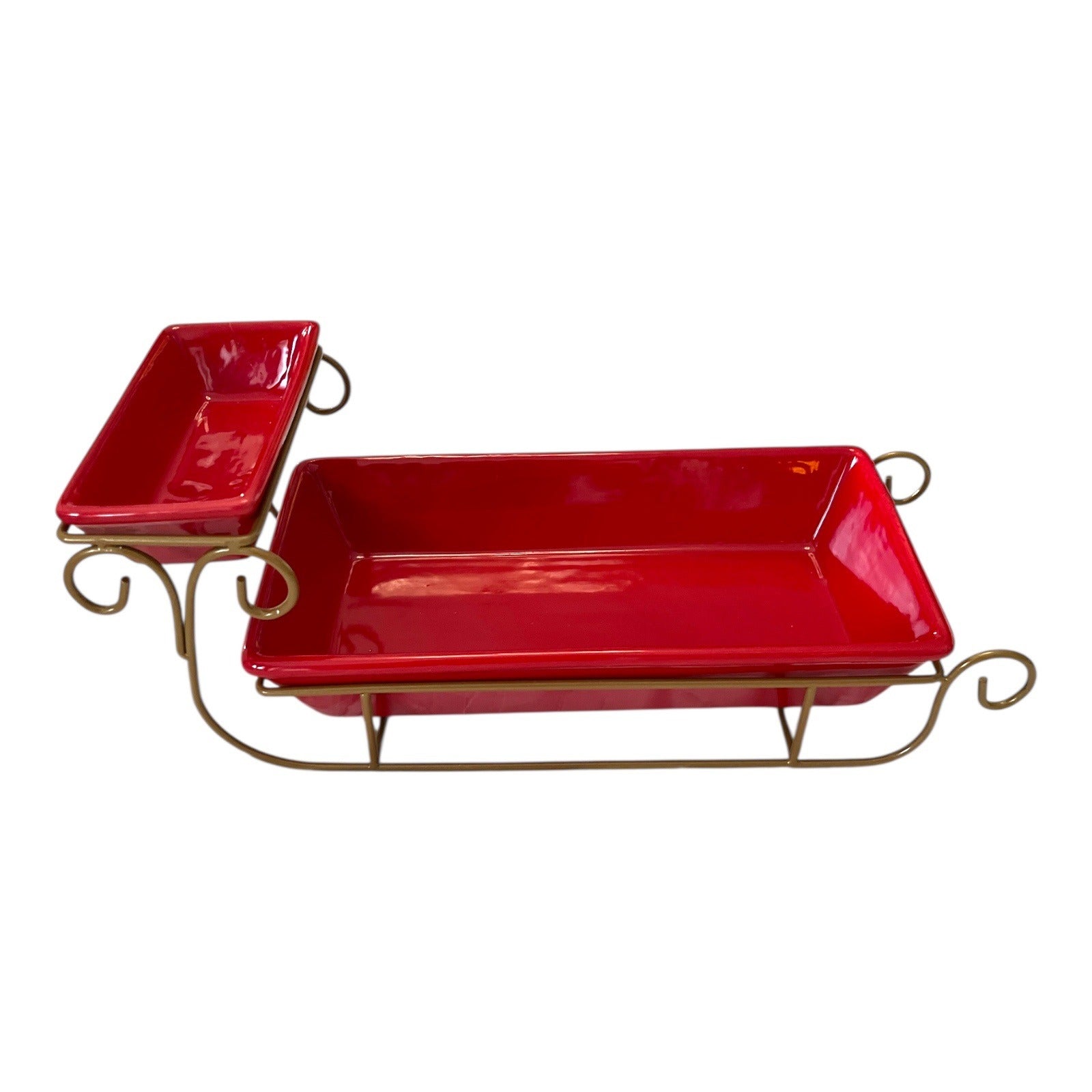 Festive 3-piece holiday serving set from the early 2000s featuring a decorative gold-tone metal sleigh paired with two red ceramic gift-shaped trays. The trays fit perfectly inside the sleigh, making this a charming and functional piece for Christmas table settings, buffets, or seasonal displays.
