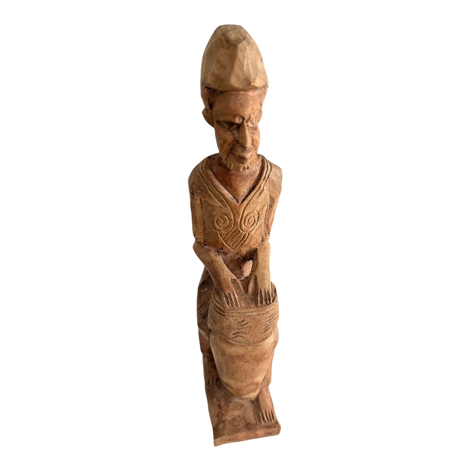 Unique hand-carved wooden sculpture depicting a standing musician playing a tall goblet-style drum. Crafted from natural wood with visible tool marks and carved swirl designs on the chest, giving it an expressive, rustic charm. The carving style and subject suggest West African influence, commonly seen in mid-to-late 20th century folk and tourist art.