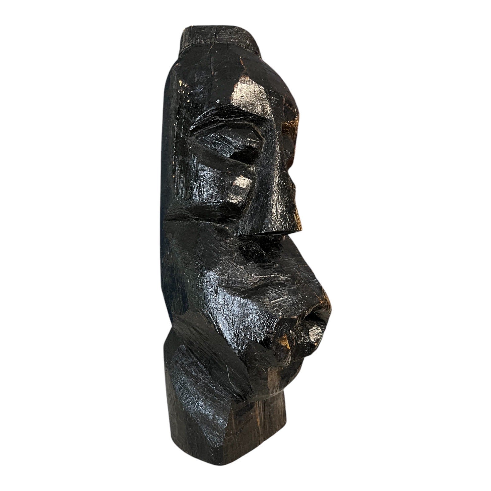 Hand-carved wooden head sculpture with bold, angular facial features and a dark stained finish. This piece has a strong primitive folk art presence, with visible tool marks and natural variations that give it depth and character. The flat base allows it to display easily on a shelf, mantel, or table as a striking standalone accent.