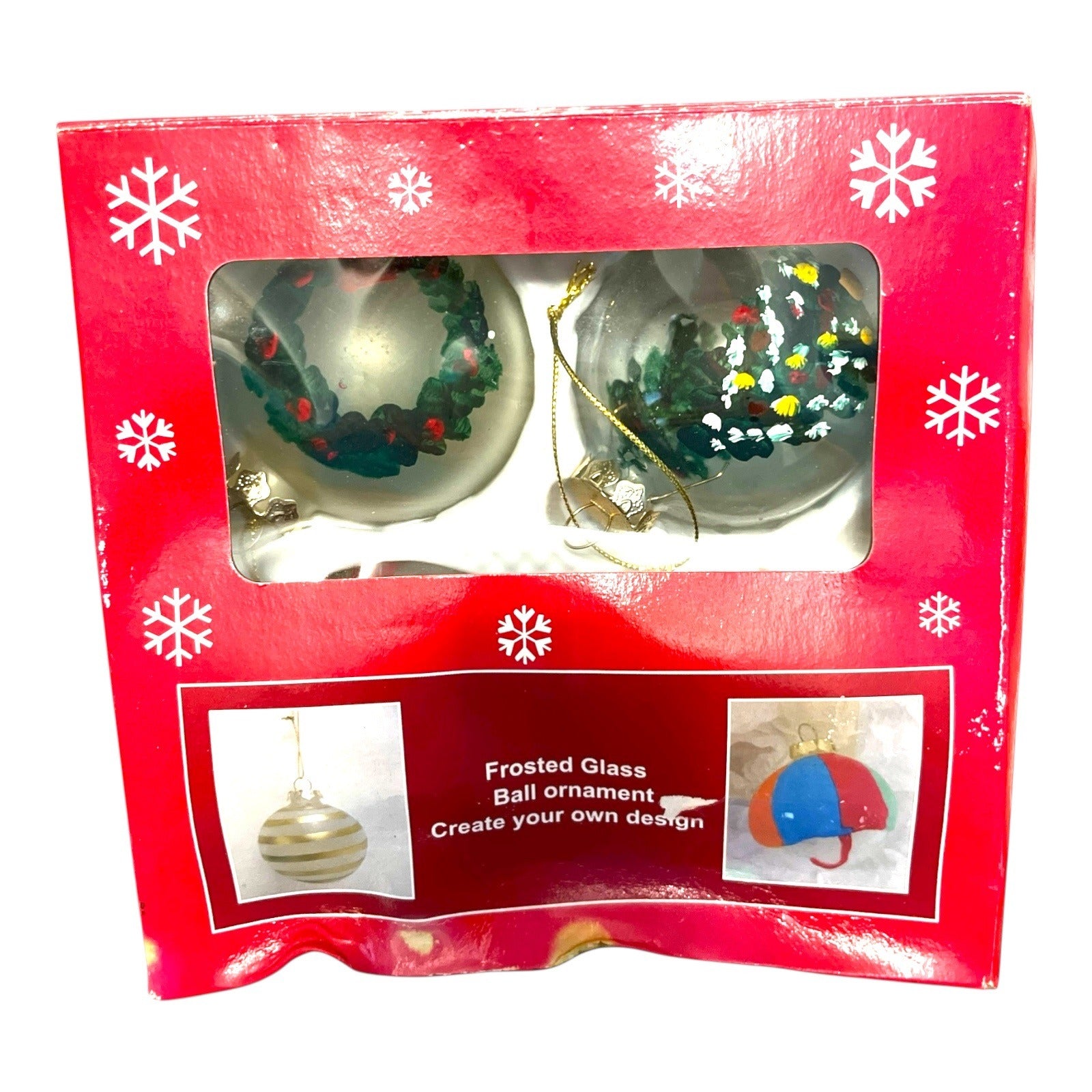 Add a personal touch to your holiday decor with this boxed set of 4 frosted glass ball ornaments from Jo-Ann Stores. Two of the ornaments are already hand-painted with charming holiday motifs—a festive wreath and a whimsical floral scene—while the remaining two are blank for your own creative expression. This vintage kit was originally marketed as a “create your own design” DIY set.