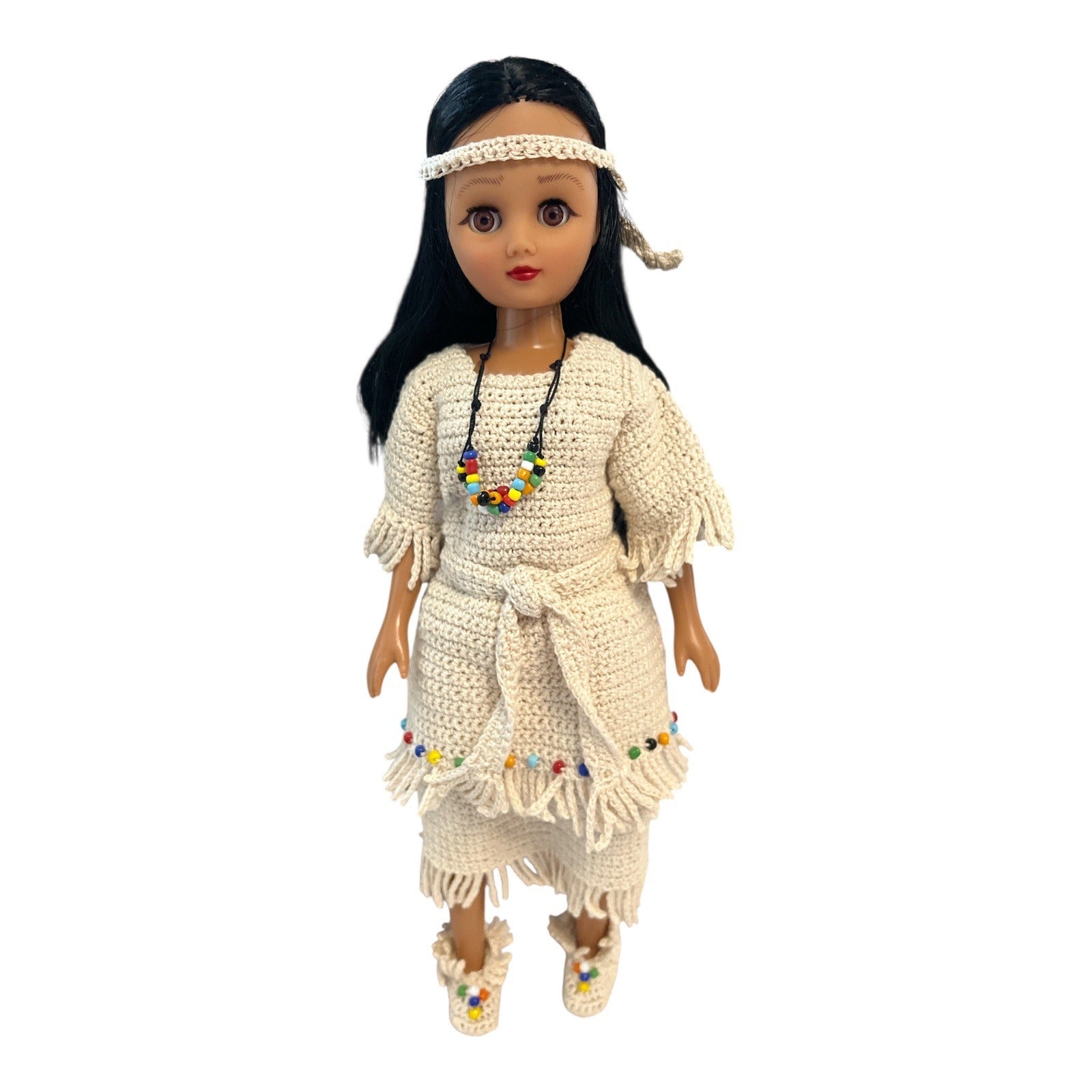 This beautiful 14-inch handcrafted doll features a full outfit crocheted in a traditional-inspired style. She wears a cream-colored fringed top and skirt adorned with colorful beads, a matching headband, and soft crocheted moccasins. Her long black hair and serene expression add to her folk art charm.