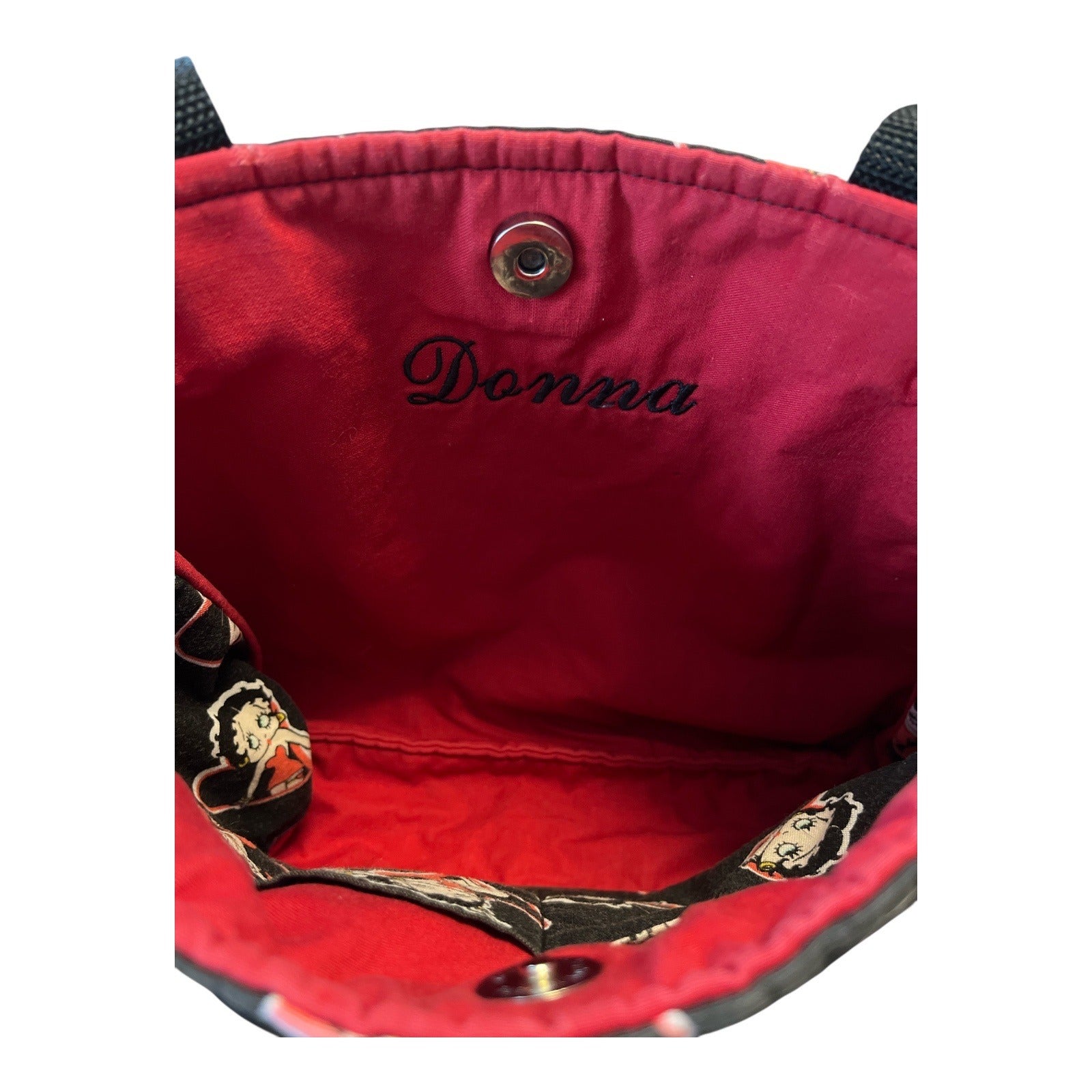 Add a playful pop of vintage flair to your look with this one-of-a-kind handmade Betty Boop shoulder bag. Featuring a bold all-over print of Betty Boop striking her signature pose in red hearts, this fabric tote is perfect for fans and collectors alike. The interior is fully lined in red and includes a slip pocket and magnetic snap closure. A personalized “Donna” embroidery adds a sweet, custom touch—making this bag a standout conversation piece whether or not your name is Donna!