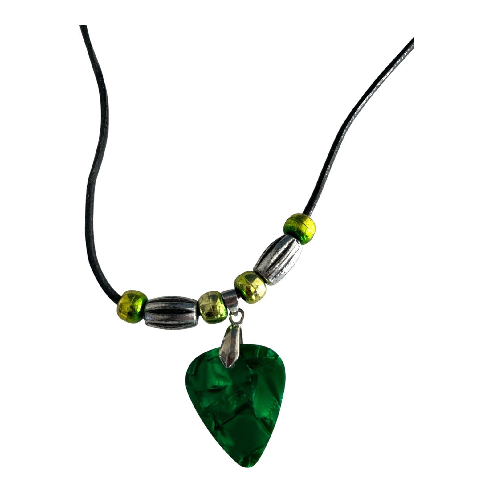 Unique handmade necklace featuring a genuine green Fender medium guitar pick pendant. The pick hangs from a black cord with metallic silver-tone and green accent beads. A great accessory for musicians, guitar lovers, or anyone with a bold, edgy style.