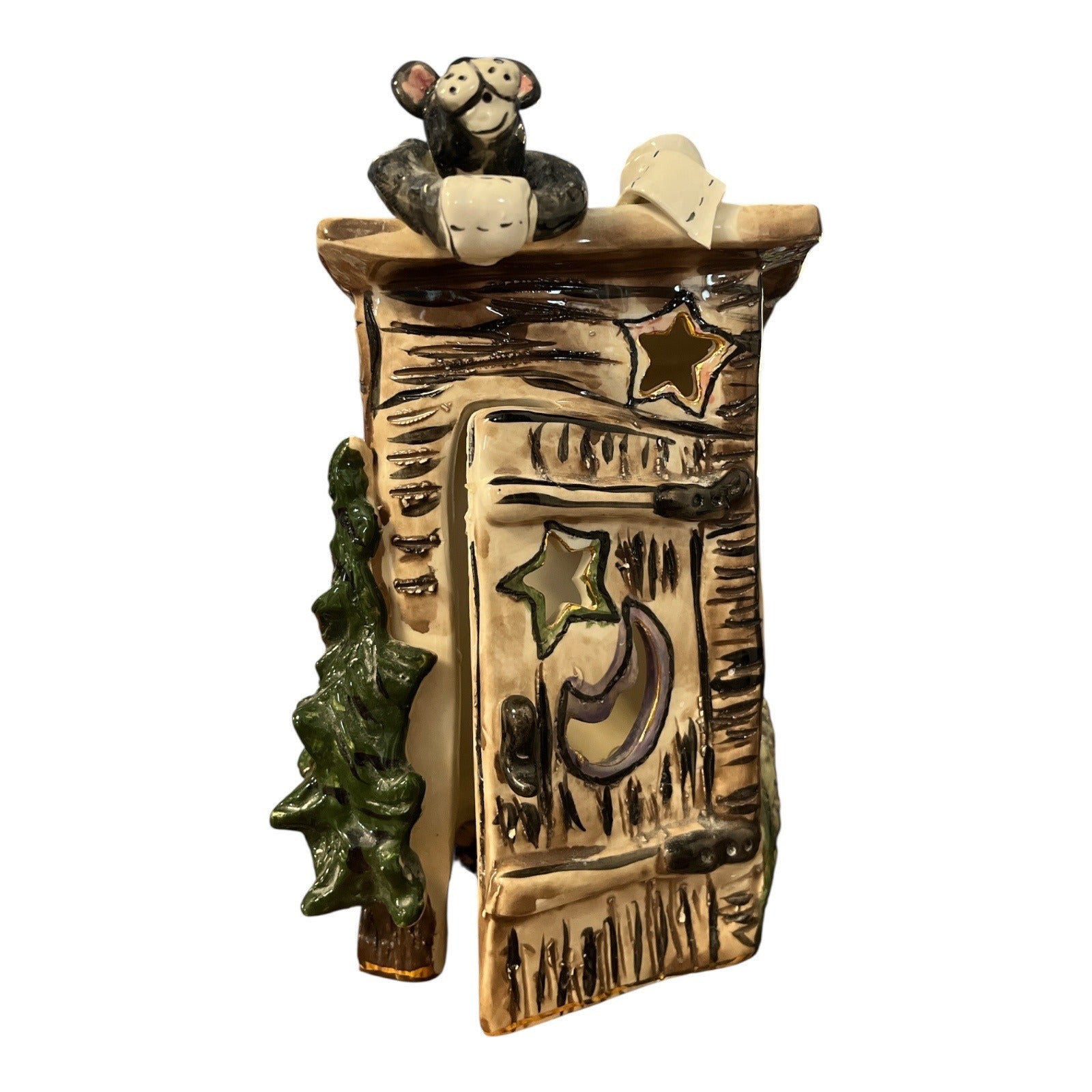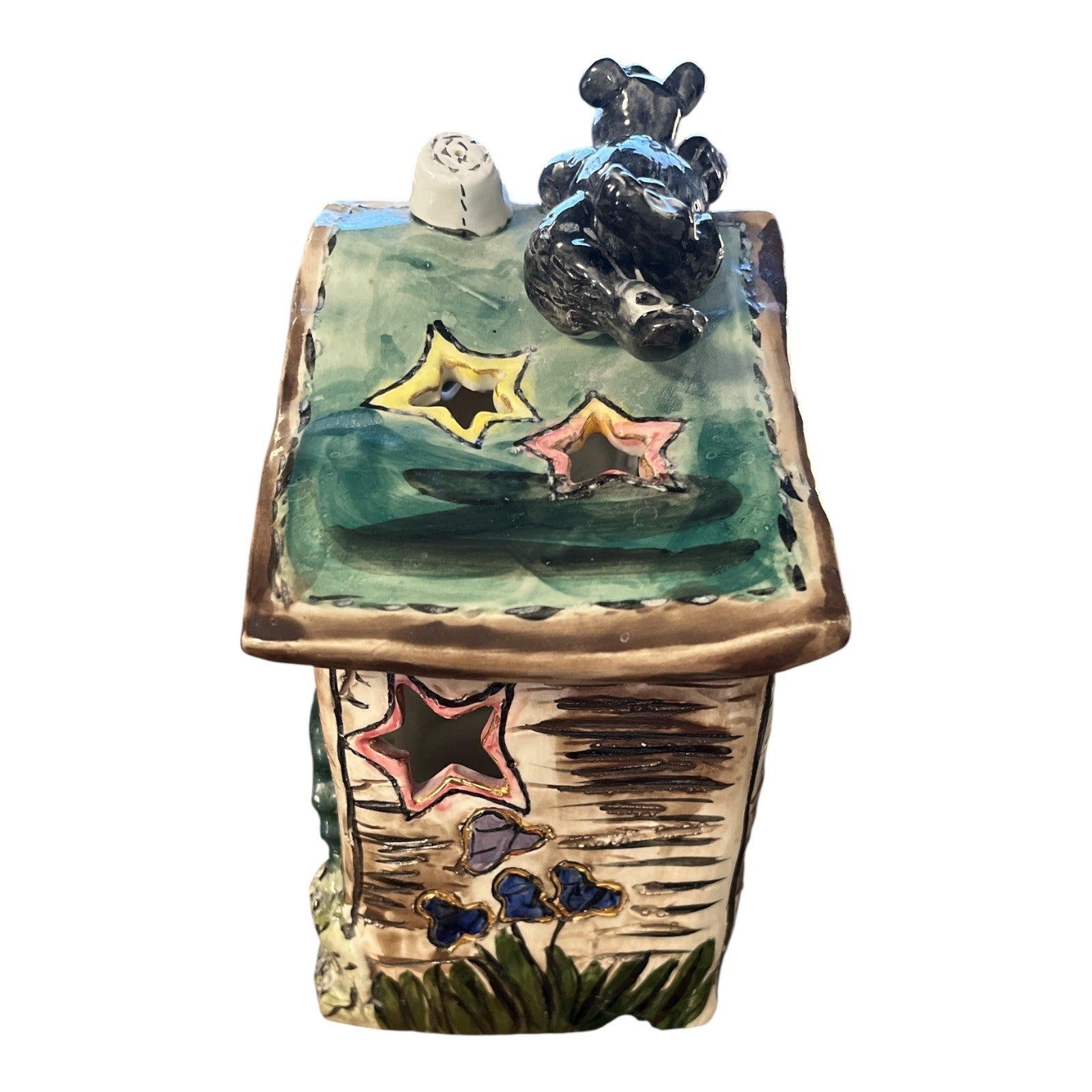 Blue Sky Clayworks Heather Goldminc Ceramic Outhouse Luminary – Hand-Painted Bear Figure – Rustic Cabin Decor – Early 2000s
