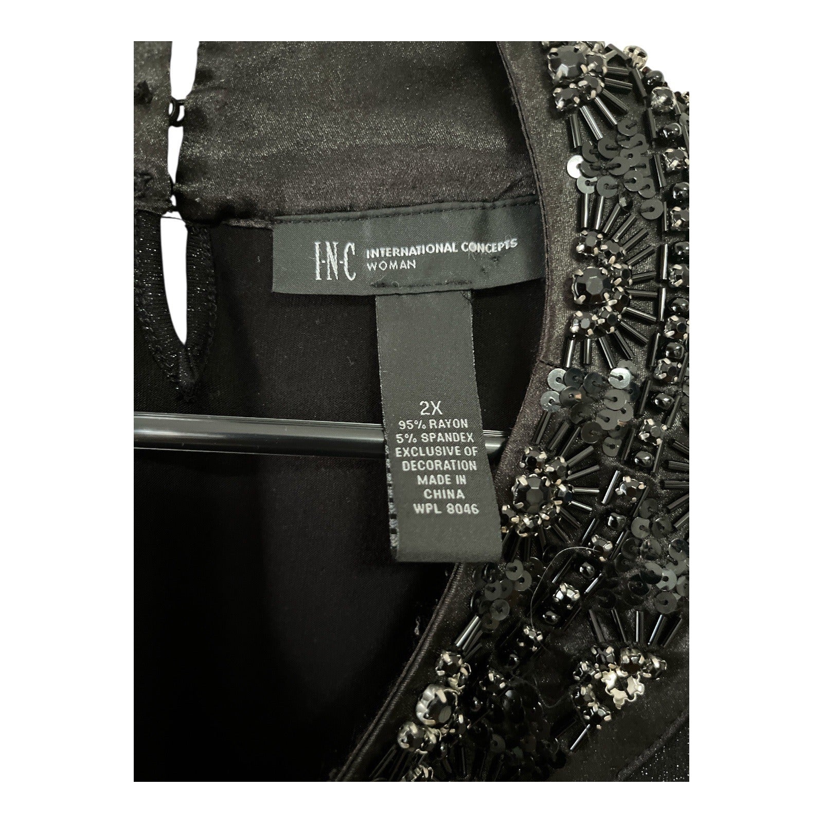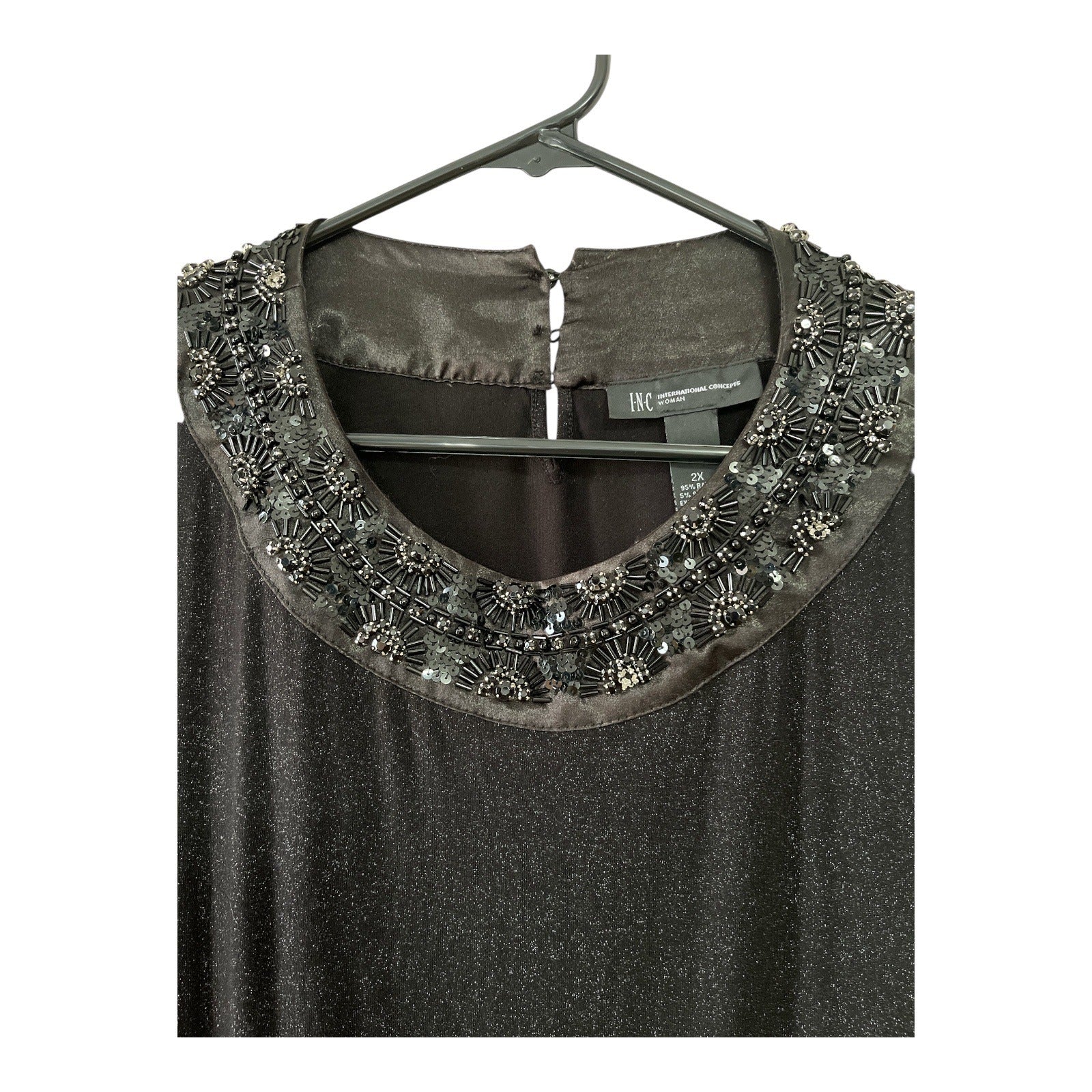 Elegant black top by INC International Concepts Woman, size 2X. This shimmer knit blouse features a satin-trimmed neckline adorned with intricate black beading and sequins for a refined touch. The relaxed silhouette drapes beautifully, perfect for evening wear, special occasions, or adding a hint of sparkle to everyday style.
