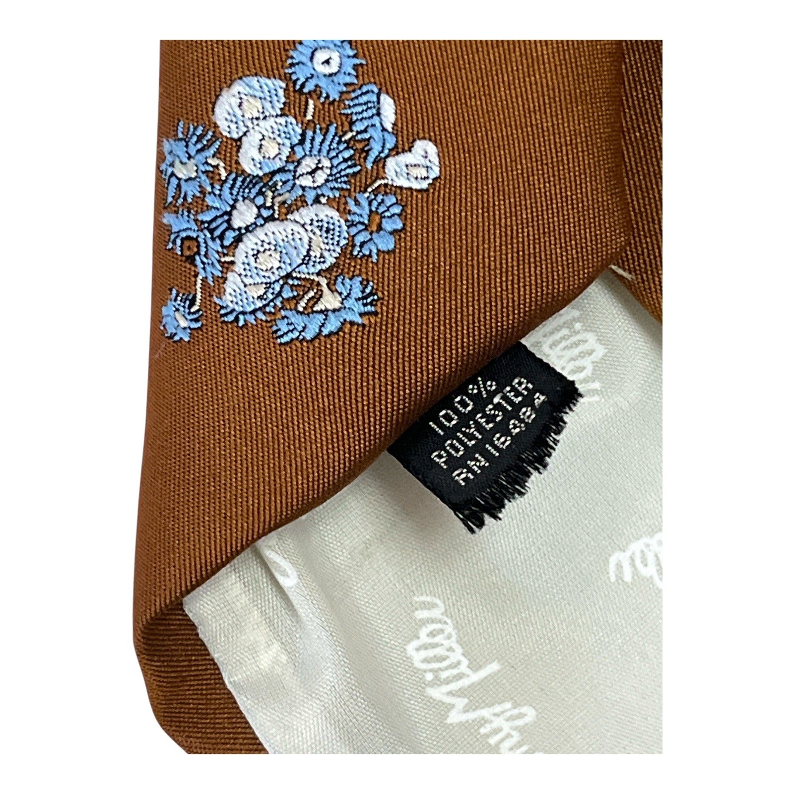 Add a touch of retro charm with this Johnny Miller men’s necktie featuring embroidered clusters of blue flowers, red berries, and a small golden bird on a rich brown background. A standout piece for both work and casual wear.