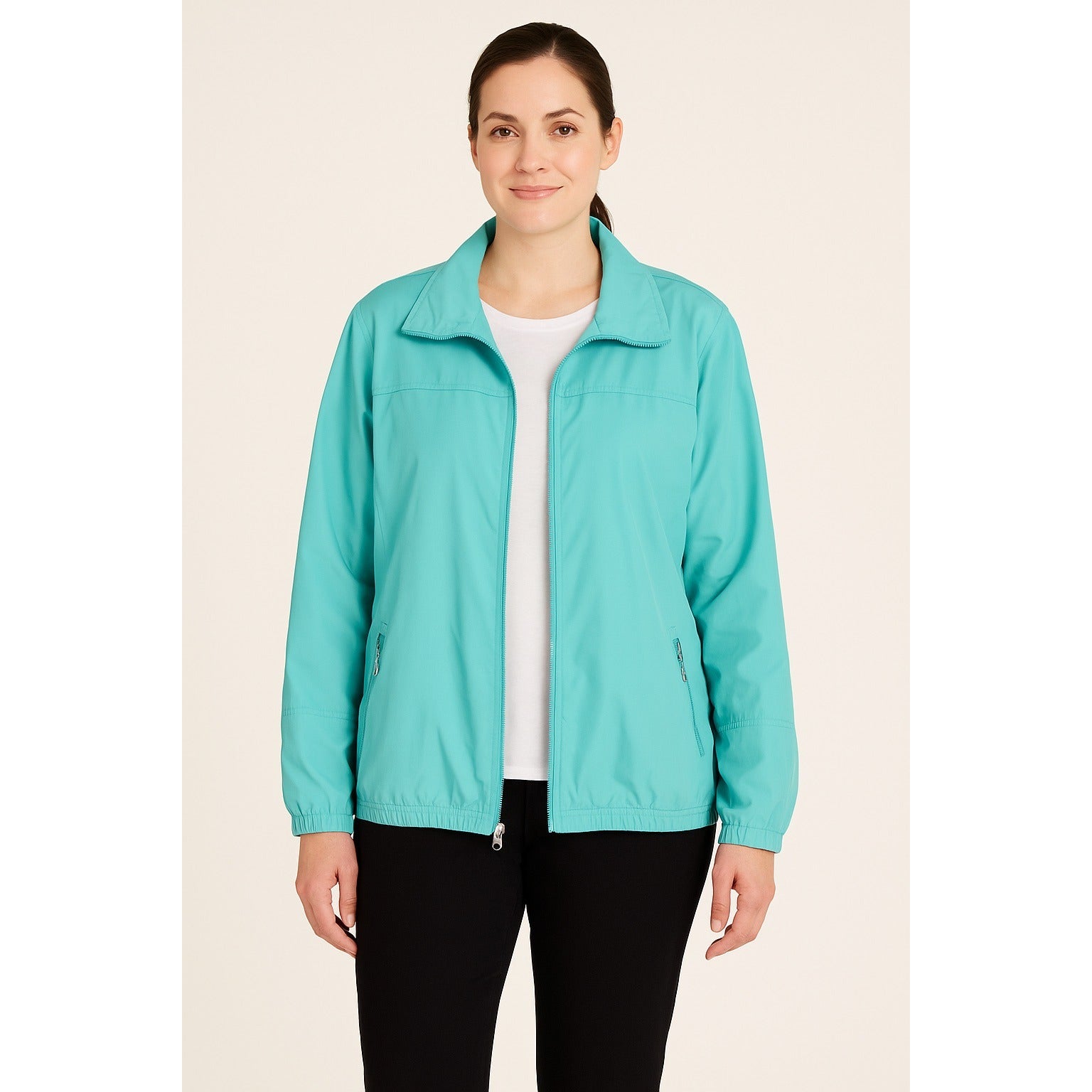 Koret women’s jacket in a bright aqua blue. This lightweight piece features a full front zipper, elastic hem and cuffs, and two zippered front pockets. Comfortable polyester shell with a soft polyester-cotton lining, ideal for layering in transitional seasons.