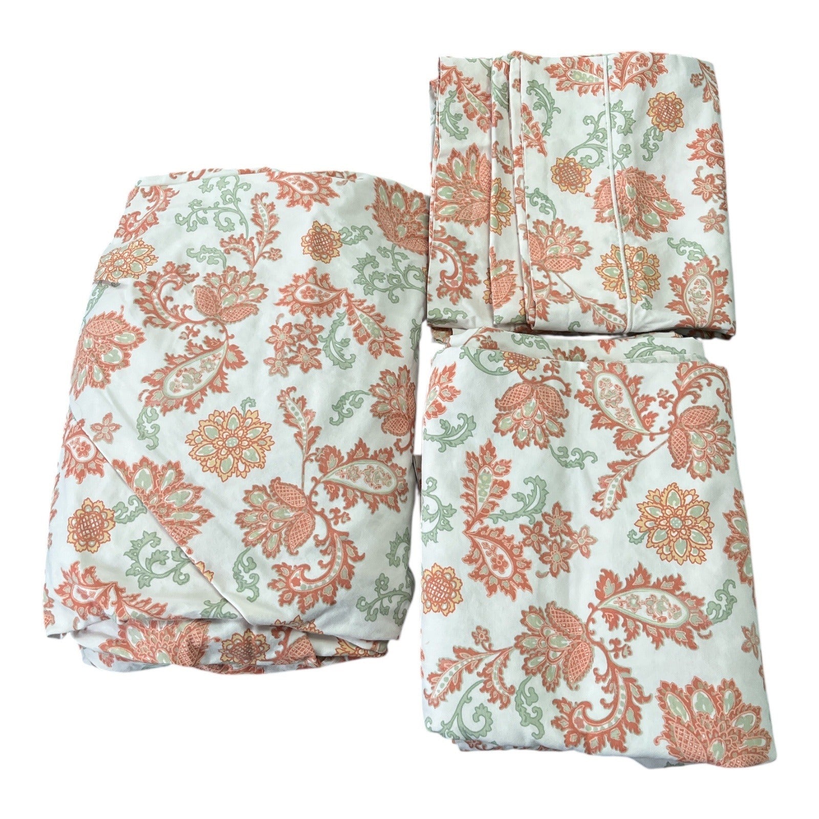 Soft and breathable L.L. Bean full-size sheet set featuring a peach, coral, and sage floral paisley print. Made in Portugal from 100% cotton, this set includes a flat sheet, fitted sheet, and two matching standard pillowcases. Quality L.L. Bean cotton with a classic pattern that works in cottage, farmhouse, or boho bedrooms.