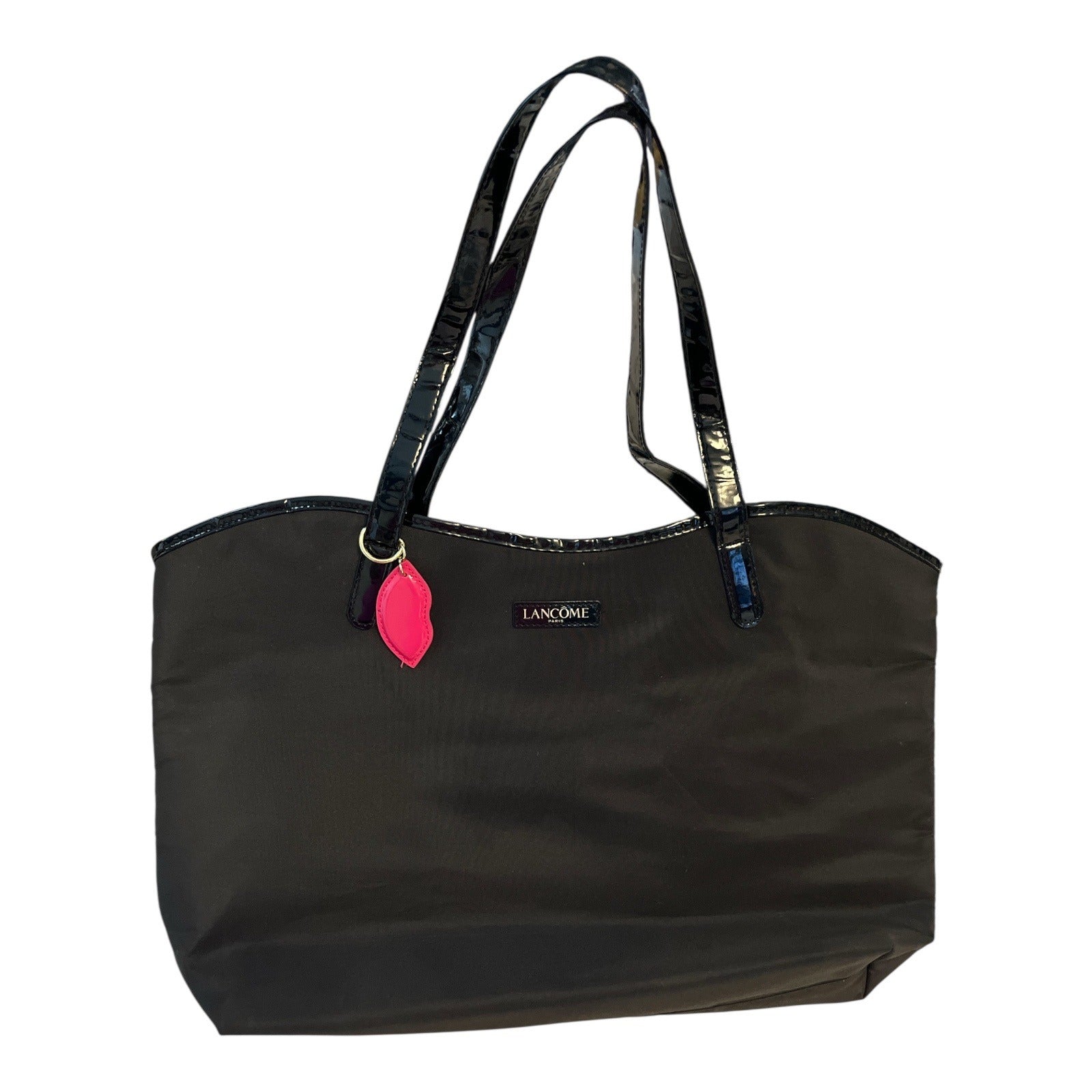 Lancôme Paris Black Nylon Tote Bag – Patent Handles – Eiffel Tower & Lip Print Lining – Pink Lips Charm – Large Cosmetic Travel Bag