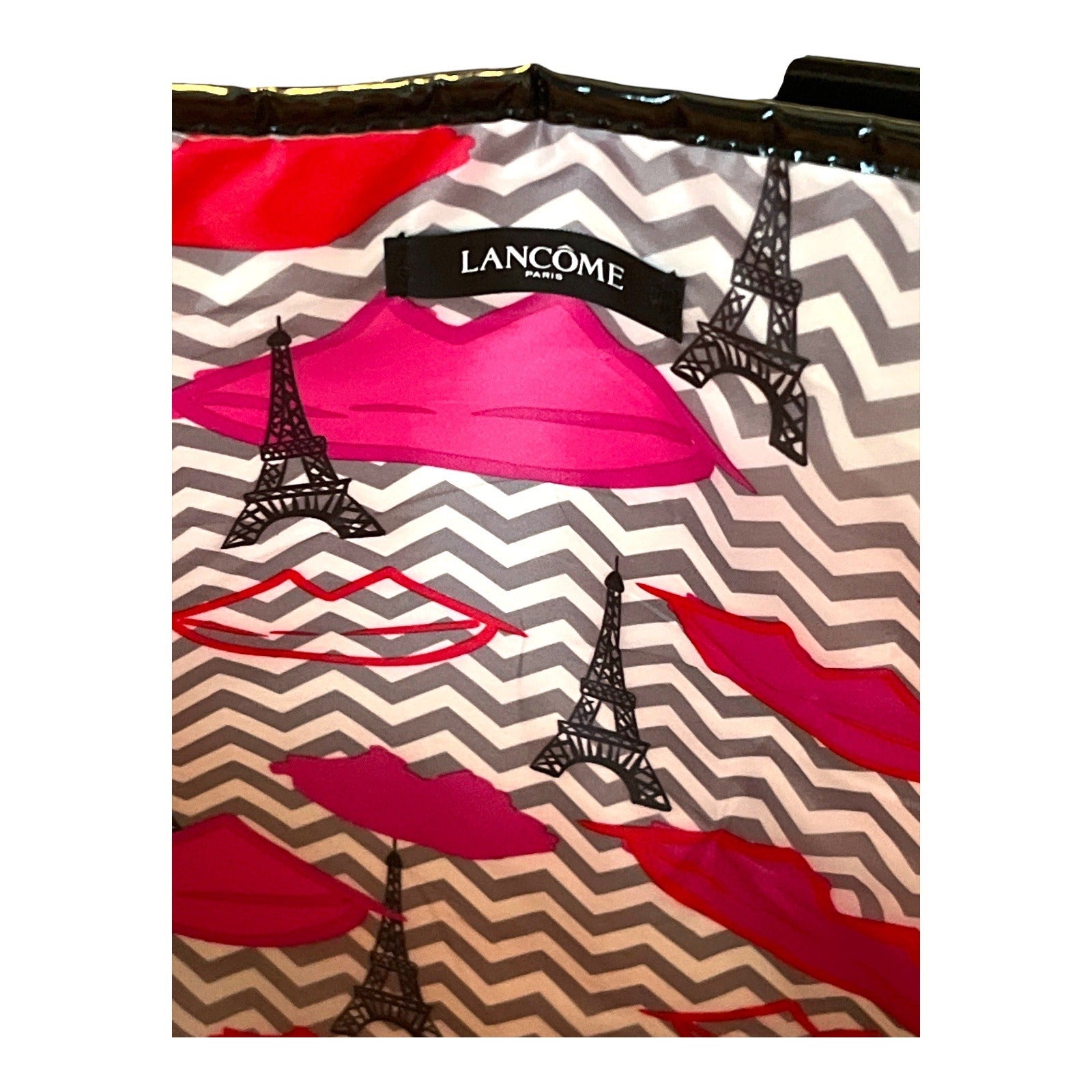 Stylish and spacious, this Lancôme Paris black tote bag is perfect for travel, cosmetics, or everyday use. Made of durable nylon with glossy black patent handles and trim, it features a vibrant interior lining with pink lips, Eiffel Towers, and a gray chevron print. A hot pink lips charm adds a playful touch.