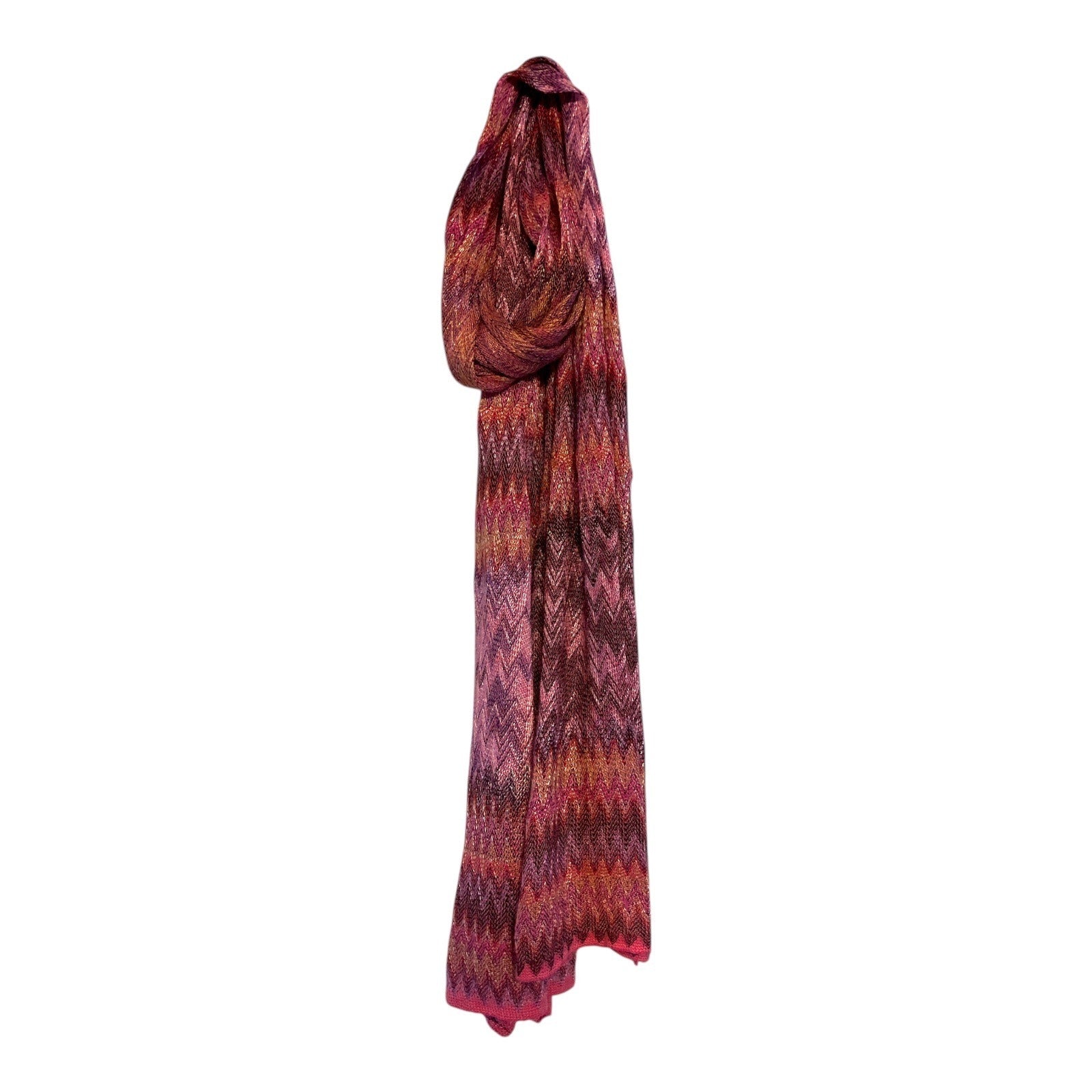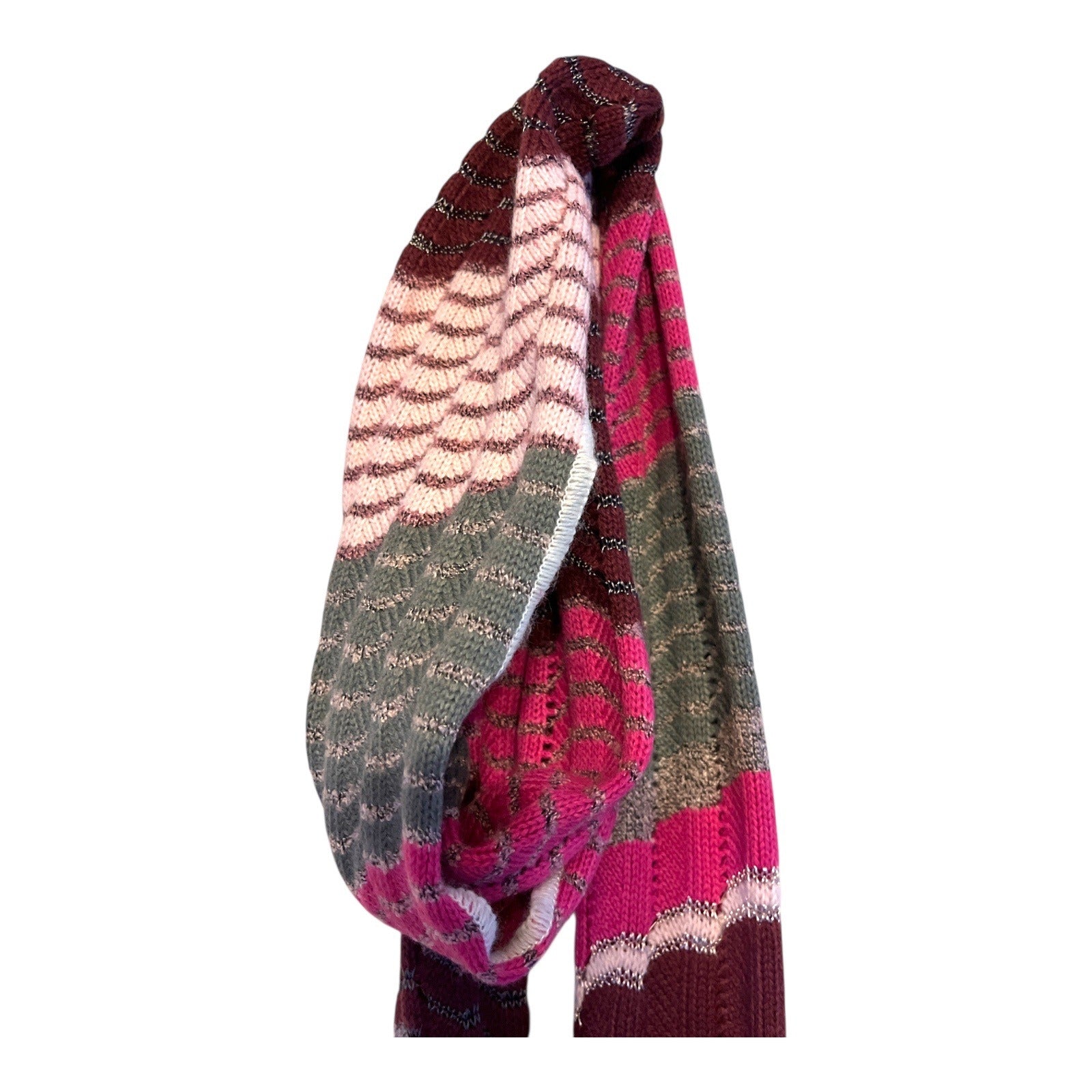 Stay warm in style with this colorful set of two knit scarves, featuring soft, lightweight materials and bold patterns. One scarf by a.n.a (A New Approach) measures approximately 84 inches long with pink, burgundy, gray, and white scalloped stripe patterns. The second scarf (unbranded) measures approximately 80 inches long and showcases a chevron zigzag design in pink, purple, and orange tones. Both scarves are in excellent pre-owned condition—great for layering or gifting.