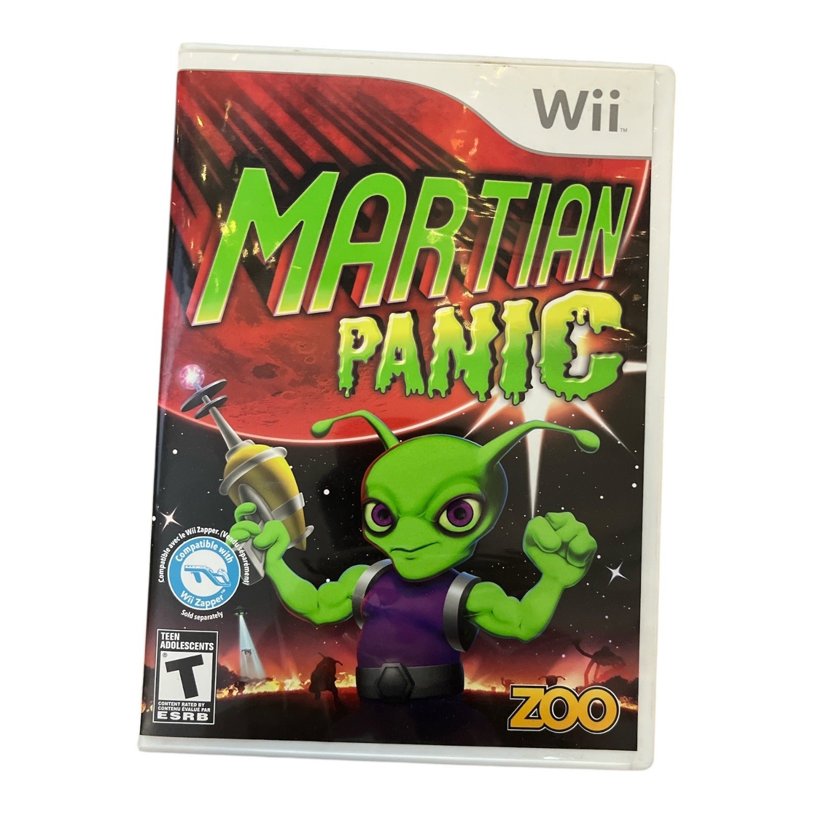 Blast off into action with *Martian Panic* for the Nintendo Wii! This complete-in-box (CIB) copy from 2010 includes the original case, disc, and instruction manual. Play solo or co-op as you defend Earth from swarms of invading Martians using blasters, grenades, and other sci-fi weapons. Compatible with the Wii Zapper (sold separately), this light-gun shooter is a must-have for collectors and fans of arcade-style gameplay.