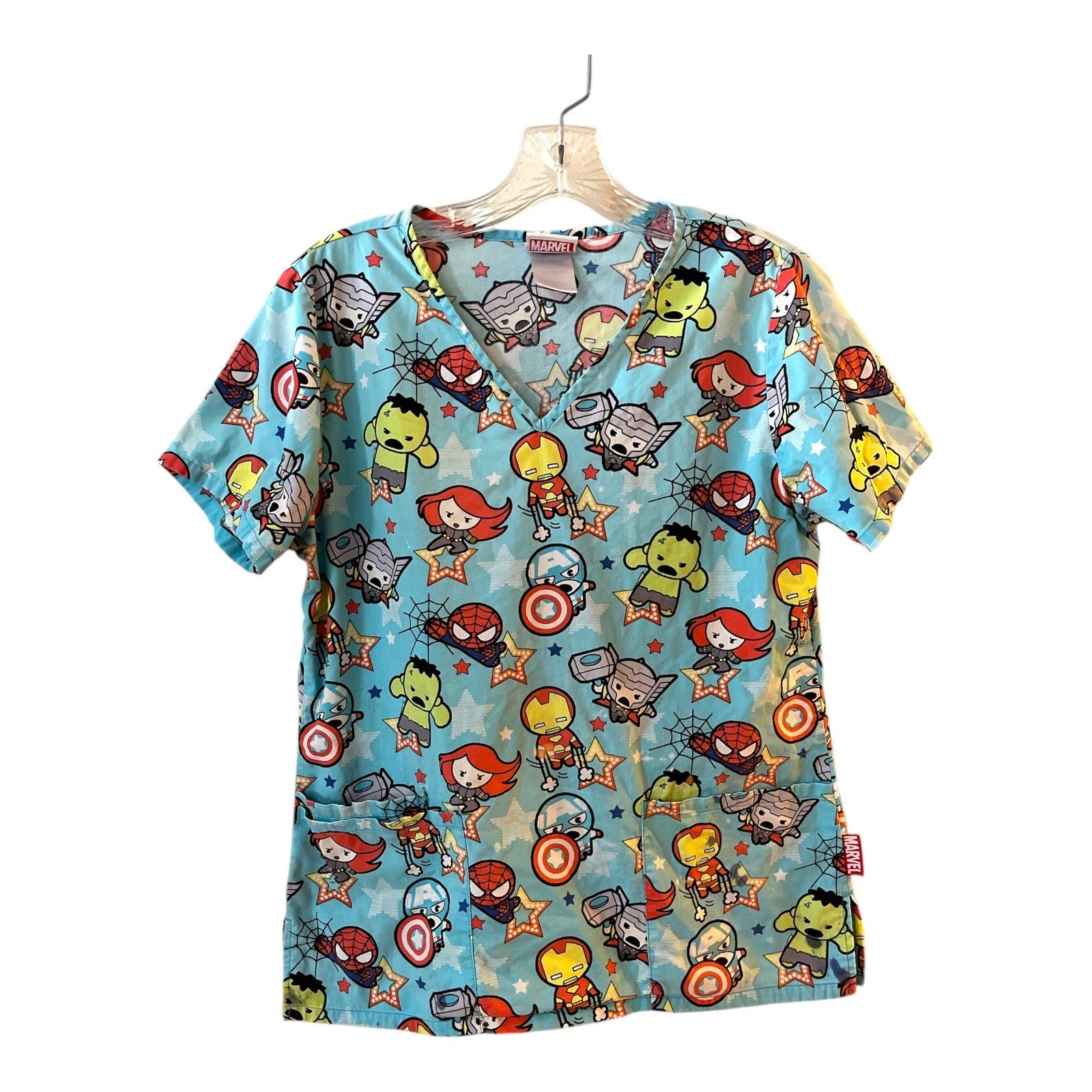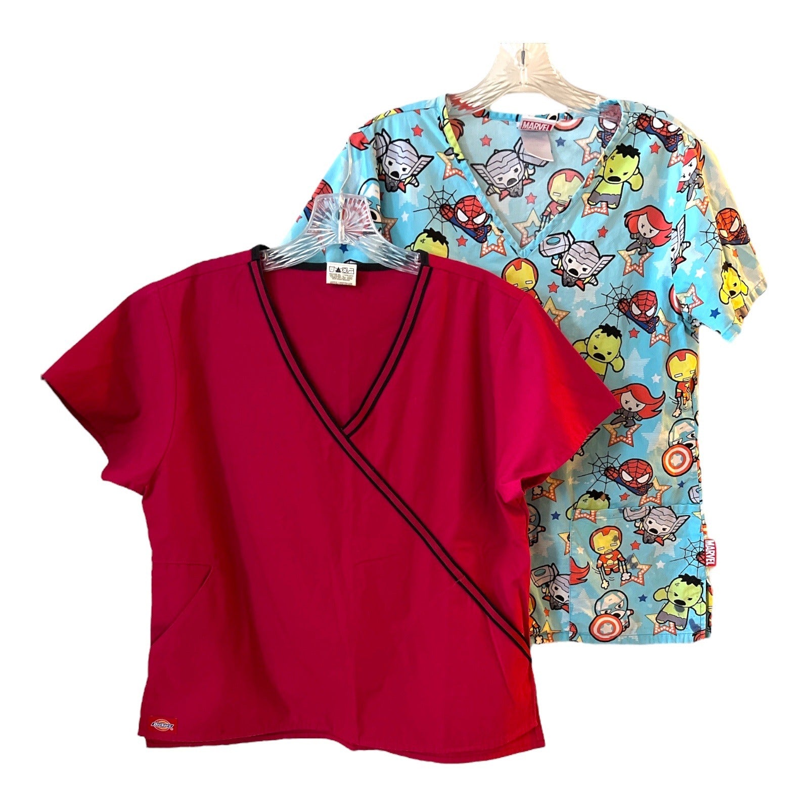 Dive into a world of comfort and whimsy with these scrub tops! This bundle includes a fuchsia Dickies scrub top with black trim and a wrap-style neckline, plus a Marvel-themed Avengers print top. The Dickies top is in good condition, offering a professional yet stylish look, while the Marvel piece adds playful charm to your day. Though the Marvel design has ink stains on one pocket and a loose seam on the other (photo provided), it remains a vibrant and practical choice for any spirited professional.